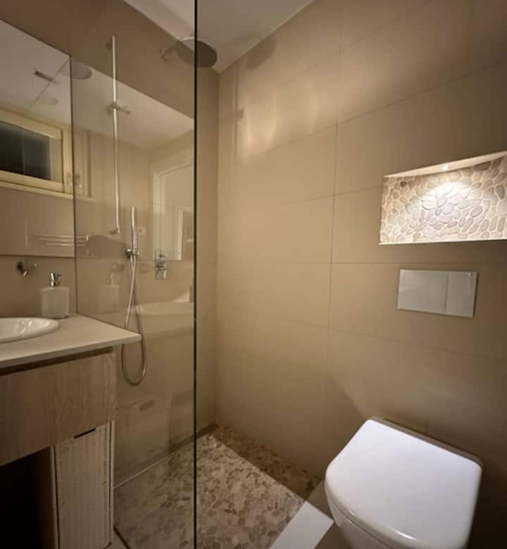 The kitchen is a gourmet’s dream, fully equipped with top-of-the-line appliances and high-end finishes. It features a stunning granite countertop made from granito assoluto, an induction hob, a steamer, and a dishwasher. This is a space where you can create culinary masterpieces with ease, all while enjoying the views. A built-in washing machine is also conveniently located in the guest bathroom, adding to the apartment’s practicality and functionality. For cooler evenings, a cozy wood-burning fireplace provides a warm and inviting focal point, perfect for relaxing and unwinding.