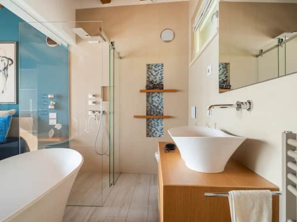 The master bedroom suite is a private retreat of its own, designed for ultimate comfort and elegance. A unique and breathtaking feature is the panoramic glass wall between the bedroom and the master bathroom. This innovative design allows air, natural light, and stunning lake views to flow seamlessly between both rooms, creating a sense of spaciousness and connection to the outdoors. The master bathroom is a luxurious sanctuary, featuring built-in designer furniture, elegant Fantini faucets, and a beautiful Jacuzzi brand freestanding bathtub and basin. This is a spa-like experience within your own home, a place to indulge in complete relaxation while gazing at the tranquil lake.