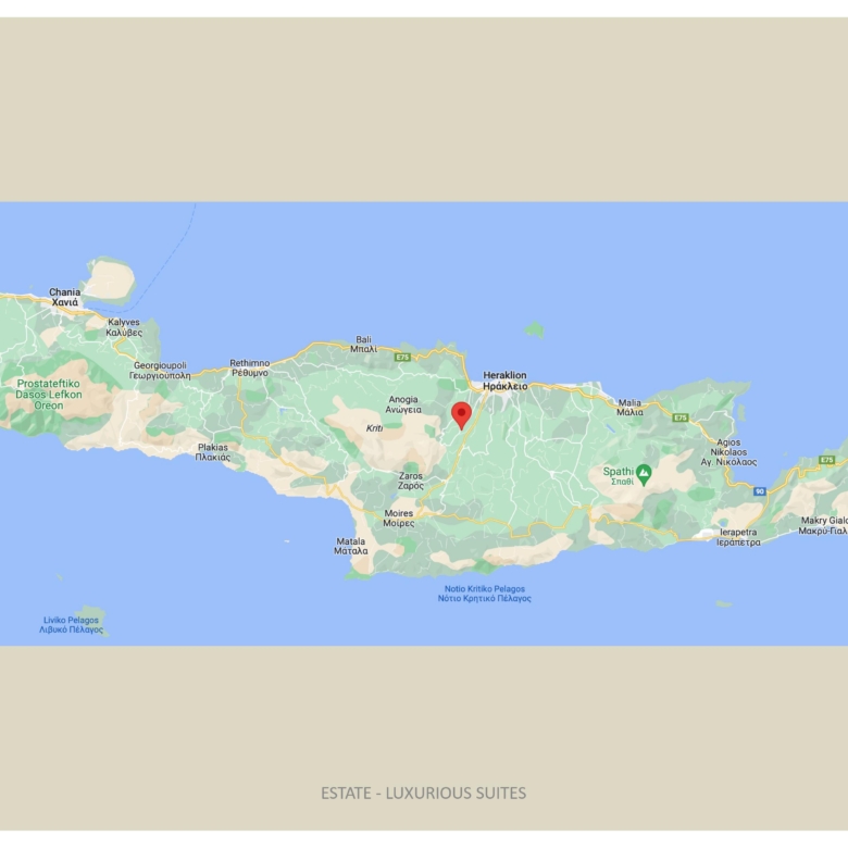The Estate is located in Northern Crete, Greece, 15 kms south of Heraklion, the island’s capital, and just 11 kms from the University General Hospital of Heraklion. It is perched on a hillside near the village of Agios Myronas, Municipality of Heraklion. The Estate offers spectacular vistas of the Cretan Sea and island of Dia, Mount Youchtas, the Lasithi mountain range, hills and valleys lush with vineyards and olive groves. The village of Agios Myronas is built around ancient Rafkos, a settlement that flourished during the Minoan period.