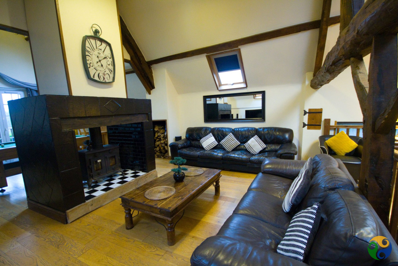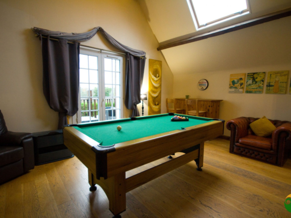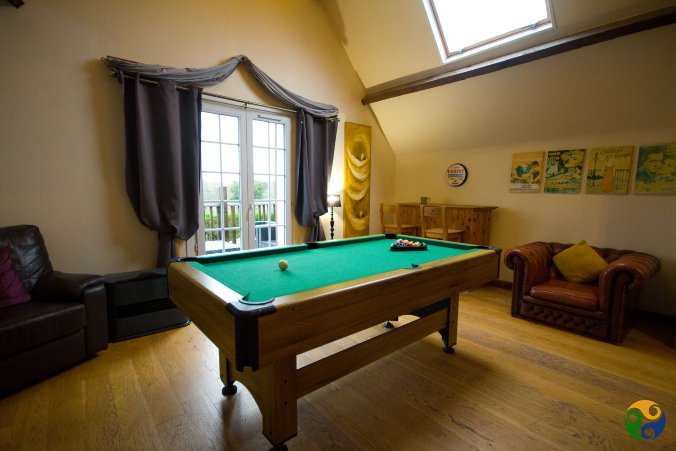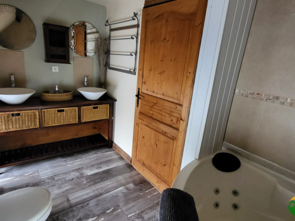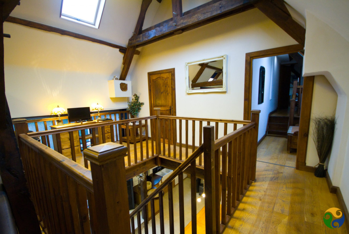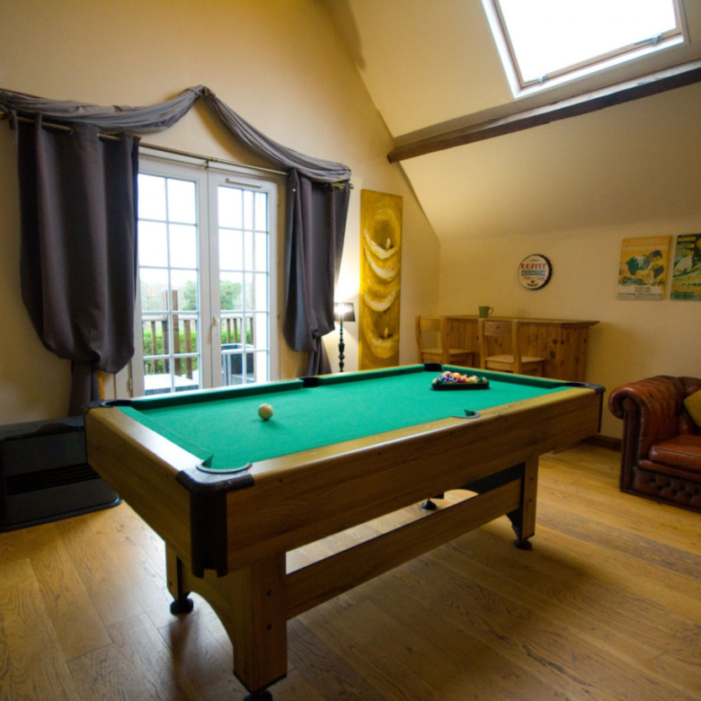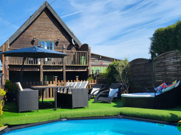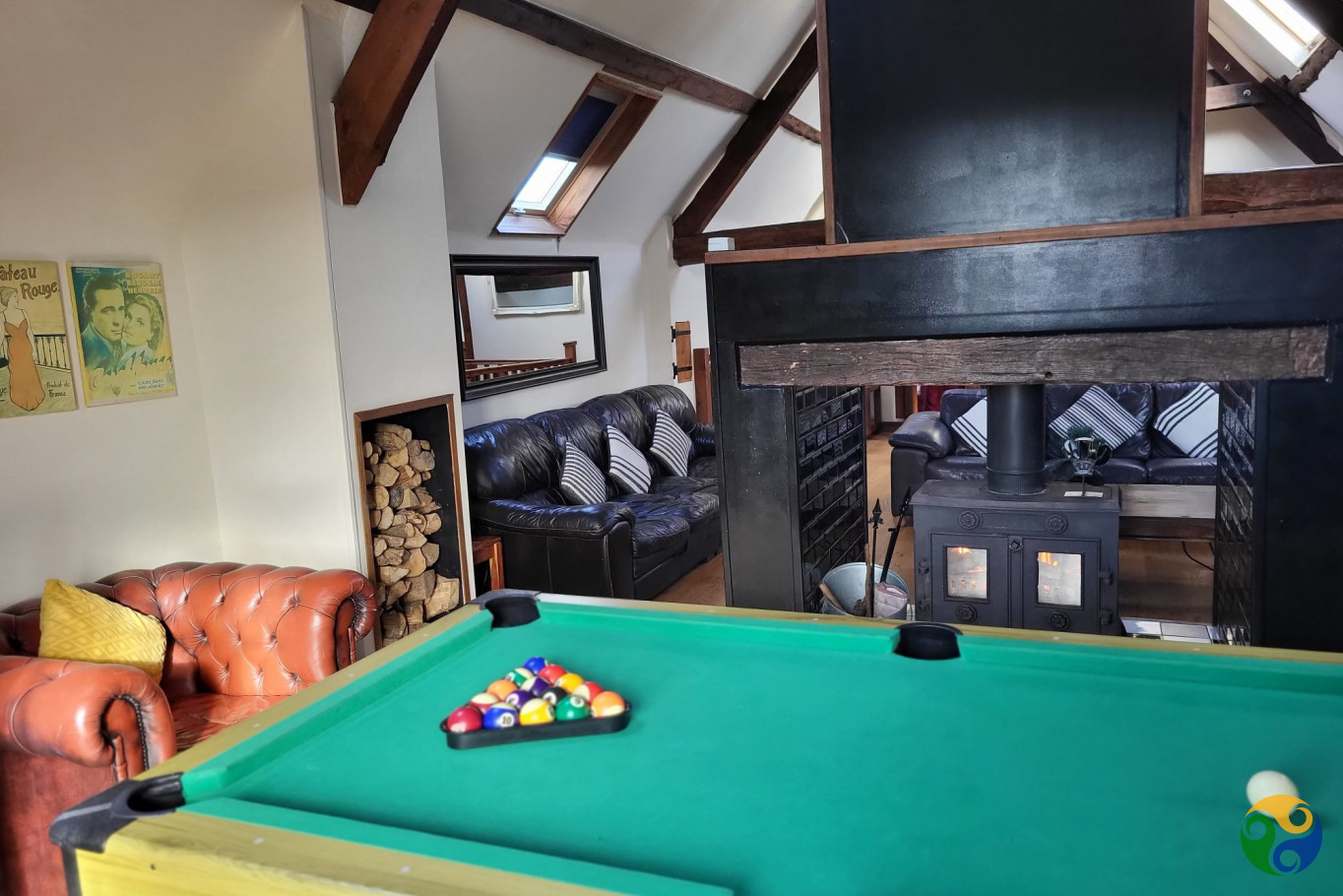 * The Converted Barn: A haven of comfort and entertainment, this converted barn features five bedrooms, three shower rooms, and a convenient separate WC in the pool area. The spacious kitchen boasts stunning oak units and granite worktops, a traditional Belfast sink, and a large lounge area ideal for socializing. A second-floor games room with a central log burner opens onto a balcony overlooking the delightful outdoor decked area and pool. For ultimate relaxation, the gite boasts an indoor 3×5 meter pool, jacuzzi, and sauna. A private garden enclosed by conifers ensures a sense of tranquility. This popular gite enjoys year-round bookings, guaranteeing a healthy turnover.