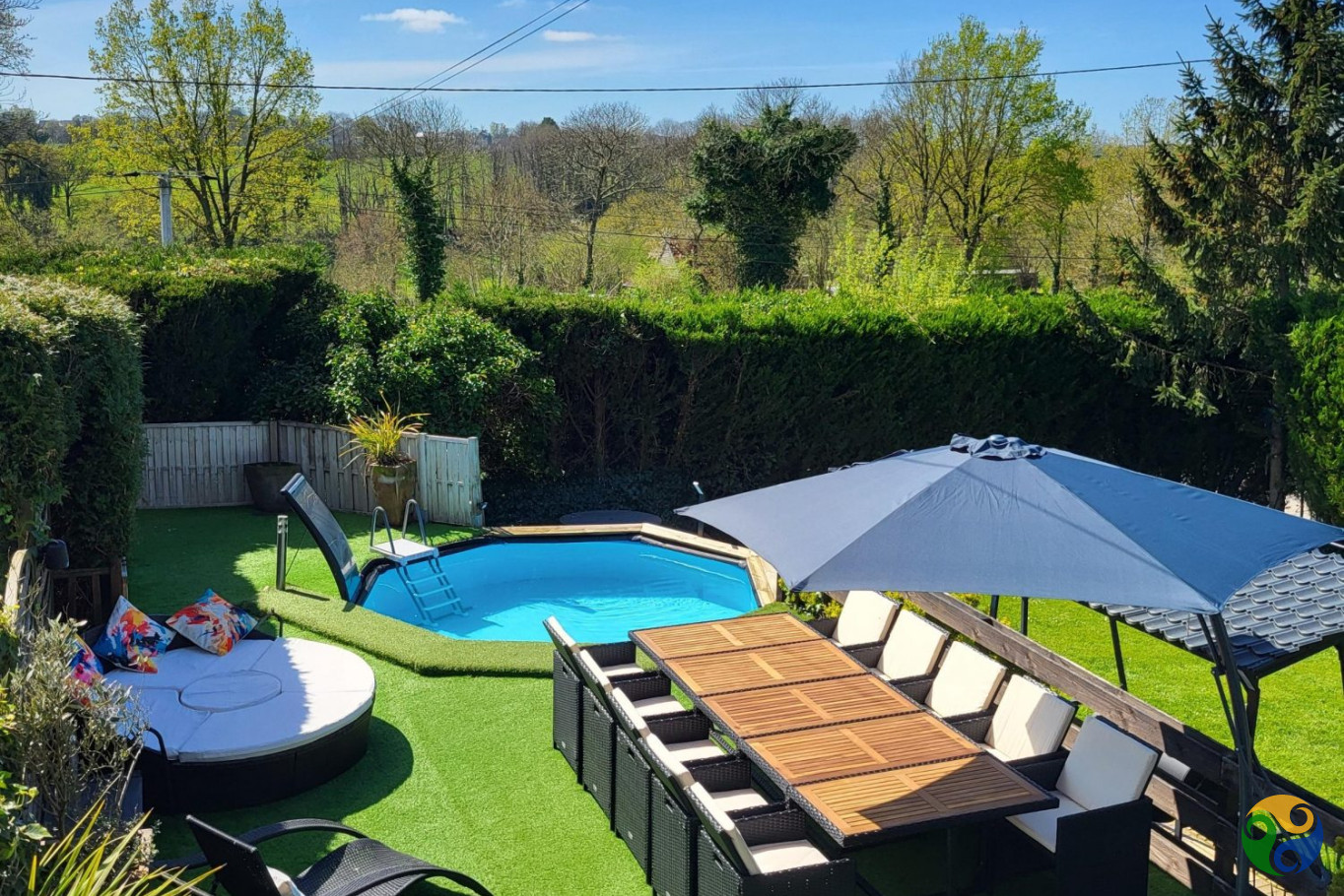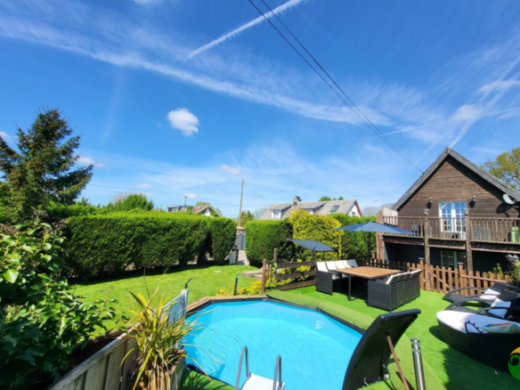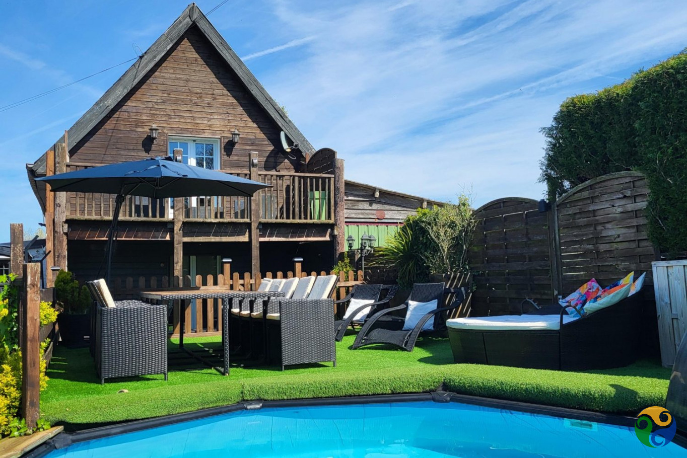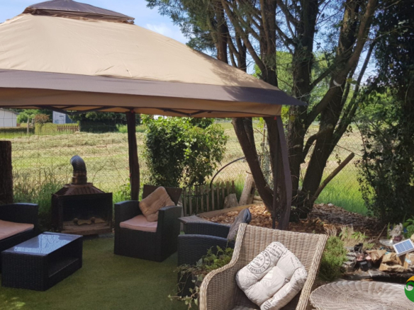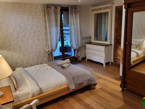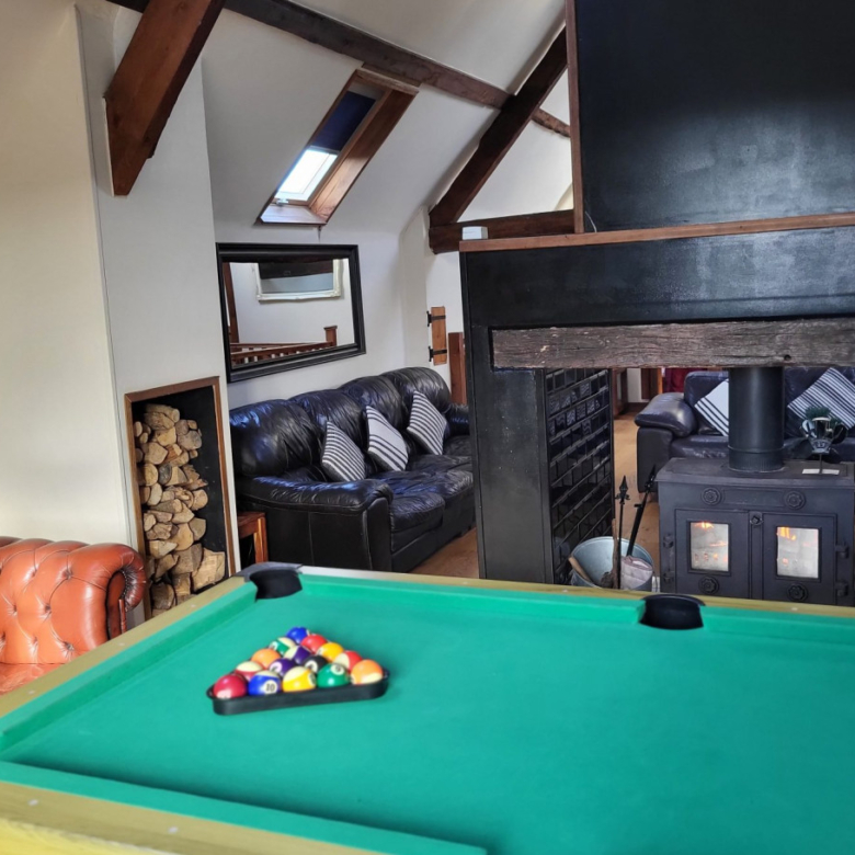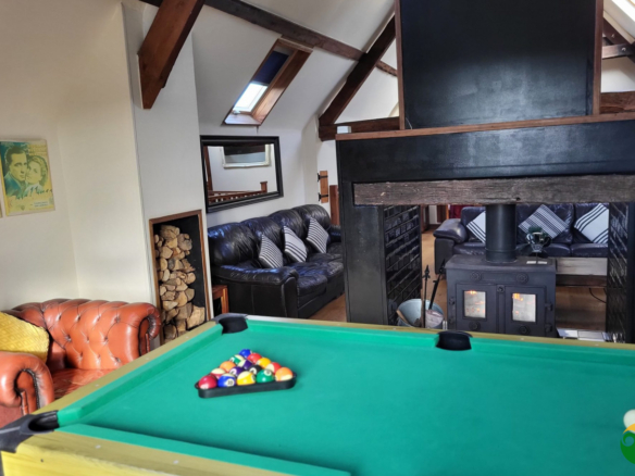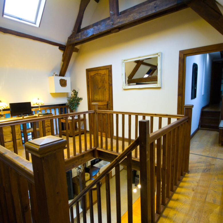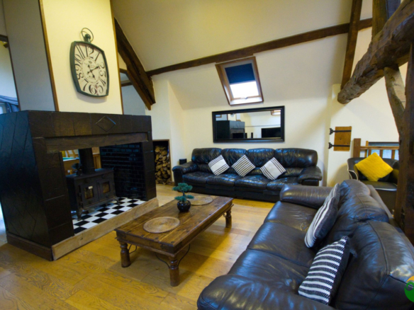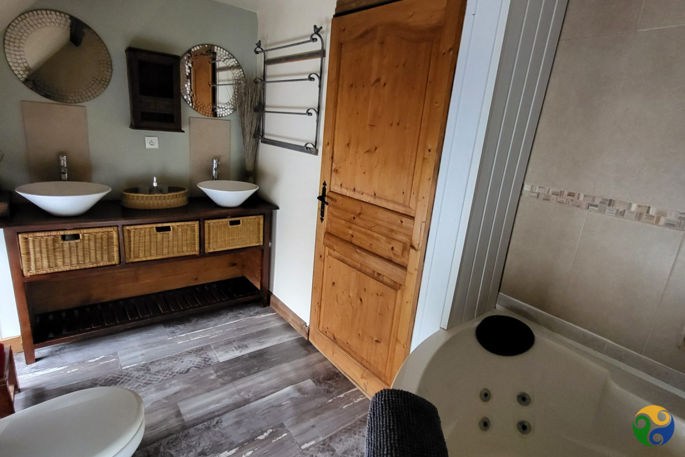* The Converted Barn: A haven of comfort and entertainment, this converted barn features five bedrooms, three shower rooms, and a convenient separate WC in the pool area. The spacious kitchen boasts stunning oak units and granite worktops, a traditional Belfast sink, and a large lounge area ideal for socializing. A second-floor games room with a central log burner opens onto a balcony overlooking the delightful outdoor decked area and pool. For ultimate relaxation, the gite boasts an indoor 3×5 meter pool, jacuzzi, and sauna. A private garden enclosed by conifers ensures a sense of tranquility. This popular gite enjoys year-round bookings, guaranteeing a healthy turnover.