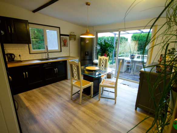 Step outside and discover a private haven spanning over 1,382 square meters. Lush greenery creates a tranquil atmosphere, perfect for unwinding amidst the French countryside. The property boasts an ideal location, with schools (from kindergarten to high school) conveniently located within a 10-minute drive.