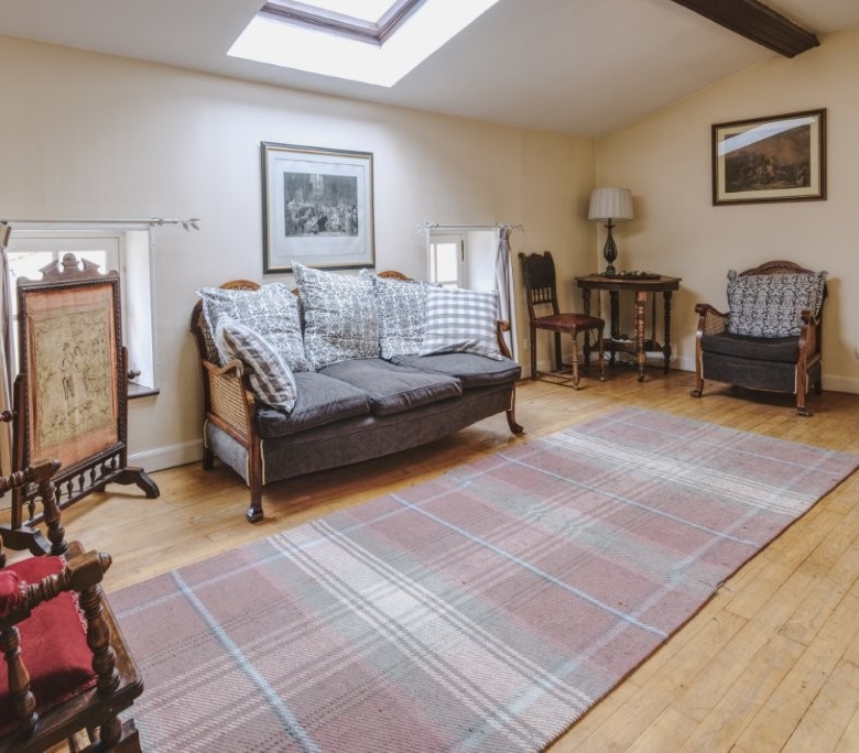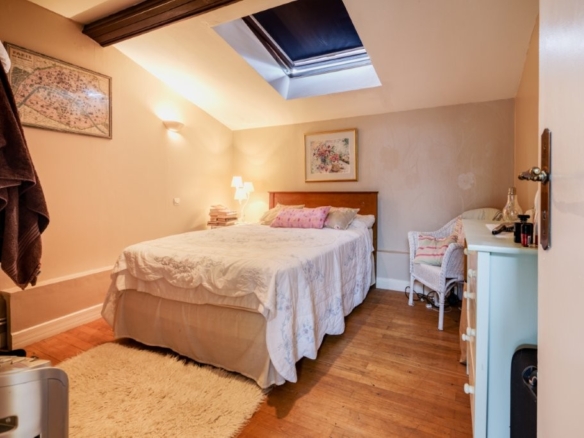 The South Wing opens to a large Mezzanine timber floor area (18.789m2), a versatile space warmed by a central heating radiator and warm air vents. Two windows overlook the courtyard and grounds, complemented by two Velux skylight windows. This wing leads to:
