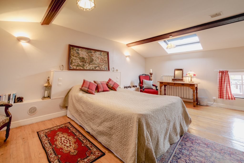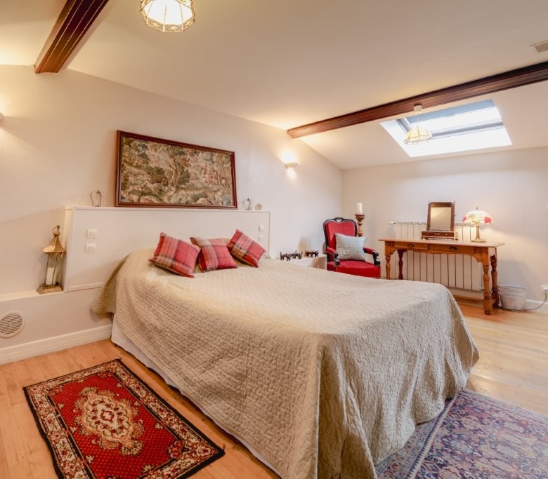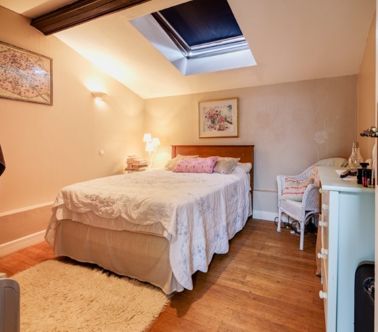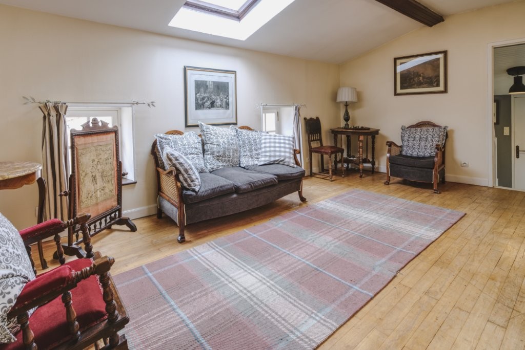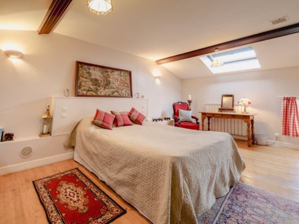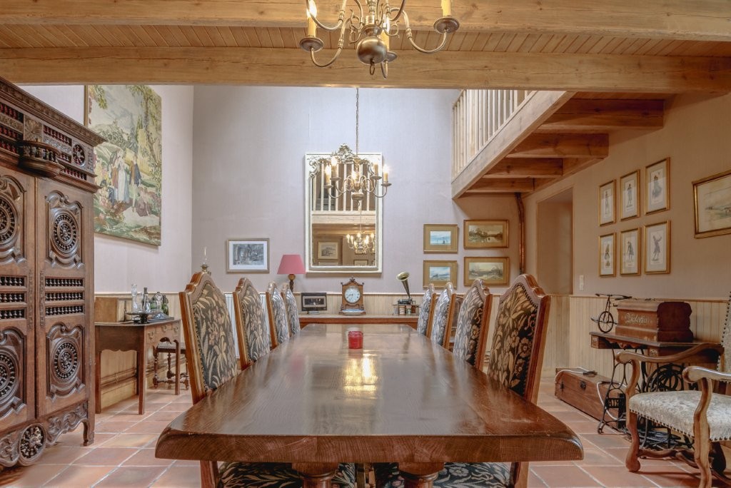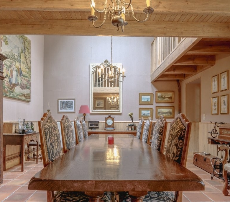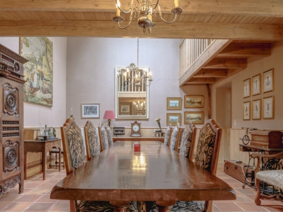 The magnificent Dining Room (30.642m2) features terracotta tiled flooring, exposed beams, a panelled ceiling with skylights, and a stunning minstrel gallery mezzanine overhead. Wood panelling continues around the base of the walls, and the room is warmed by electric wall heaters and central heating radiators. A charming bay-style window overlooks the courtyard, and glazed double exit doors also provide access to this central outdoor space. An internal door connects directly to ‘La Maison de la Rosairie’ gîte.