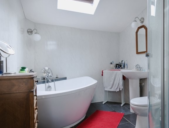 * Bedroom 3 (14.610m2): Accessed from a small hallway off the mezzanine, this bedroom features timber flooring, large built-in clothes storage cupboards, a central heating radiator, and a Velux skylight window. It benefits from an en-suite bathroom (4.851m2) with a bath, handbasin, toilet, and central heating radiator.