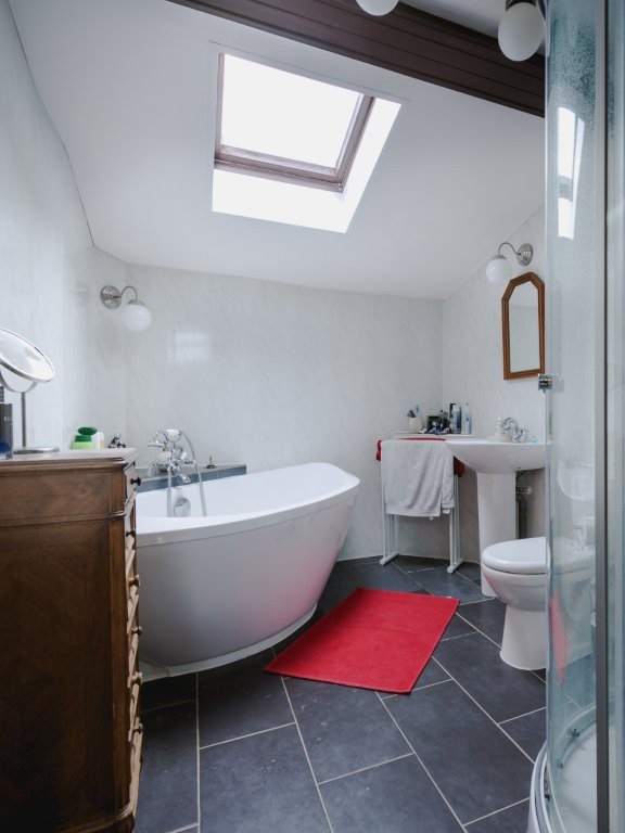 * Family Bathroom (6.622m2): Tiled floor and walls, toilet, built-in double basins, bath with mixer tap and shower head, central heating radiator, and Velux skylight.