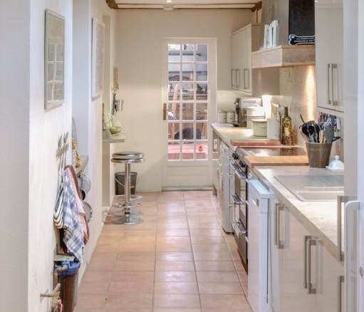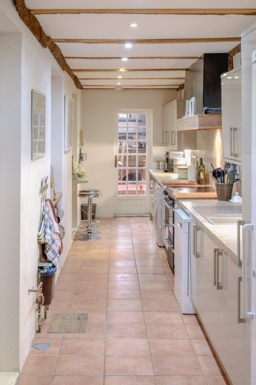 The Kitchen (22.580m2) is a superbly equipped galley-style space, finished with terracotta tiled flooring. It features a large extractor hood over a double electric oven, a full complement of base and wall cupboards, two large freezers, and a spacious fridge. A 1.5 bowl resin sink with its own under-cupboard hot water supply, under-cupboard lighting, and recessed utensil hanging areas complete this functional culinary hub. Adjacent is a generous walk-in Larder Store (3.434m2) with shelving and the consumer unit for the kitchen and ‘La Maison de Jardin’ gîte.