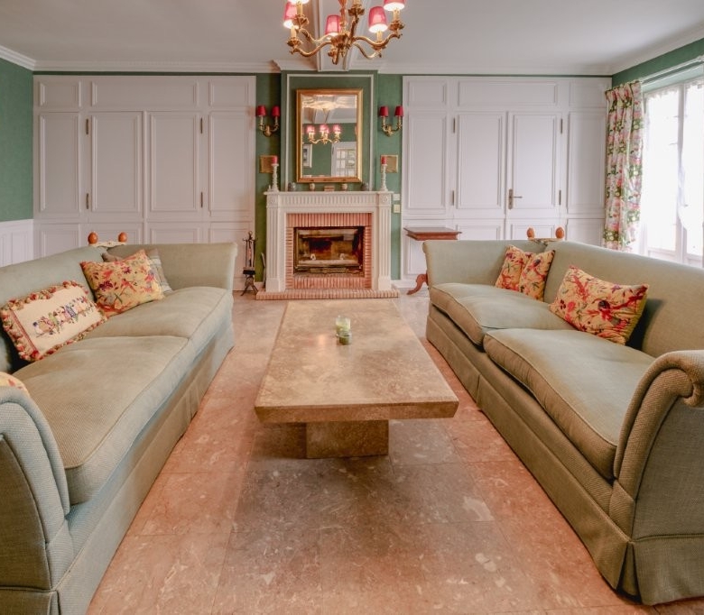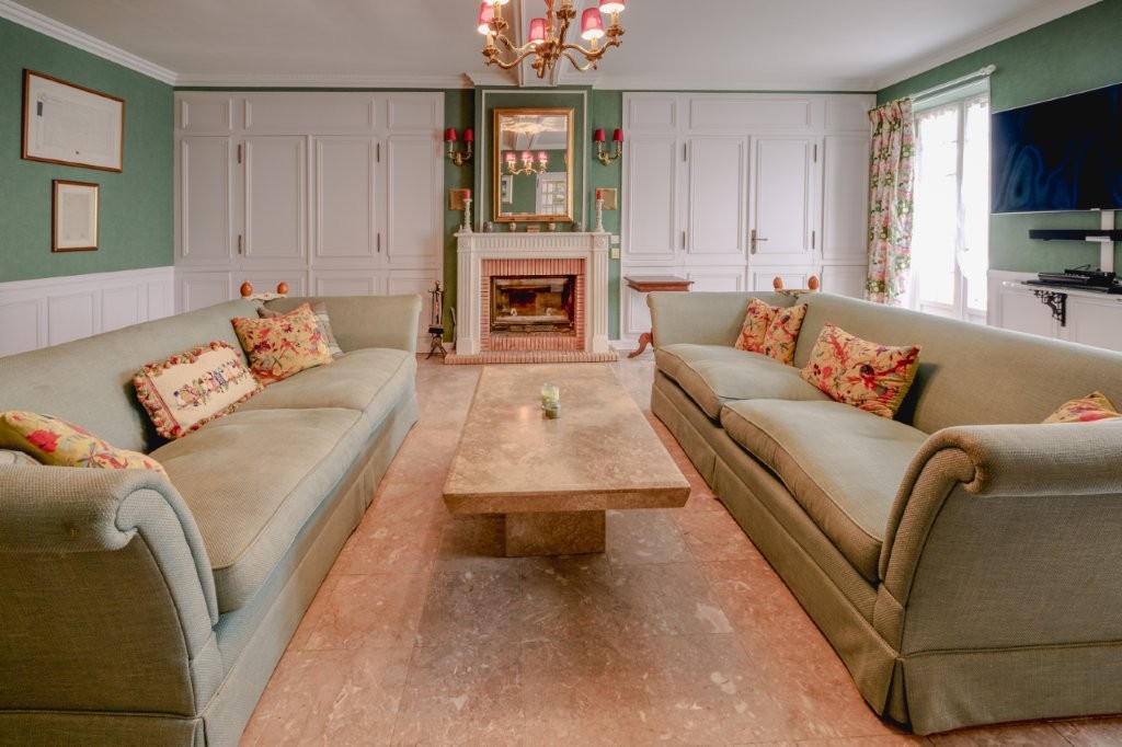 The impressive Lounge (34.079m2), adorned with marble tiled flooring, is a space of grandeur and warmth. A unique hot air central heating inset wood fire provides efficient warmth for the lounge and part of the first floor, with the option to open the glass fire door for a traditional log fire experience. A panelled ceiling with chandelier lights and elegant wood panelling around the base of the walls create a sophisticated ambiance. A cleverly designed wall of panelled hidden doors conceals large storage cupboards. Two sets of double glazed doors open directly onto the inviting courtyard.