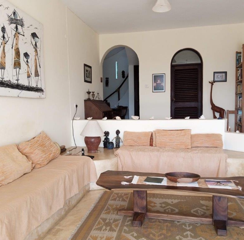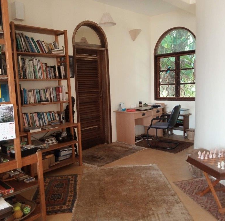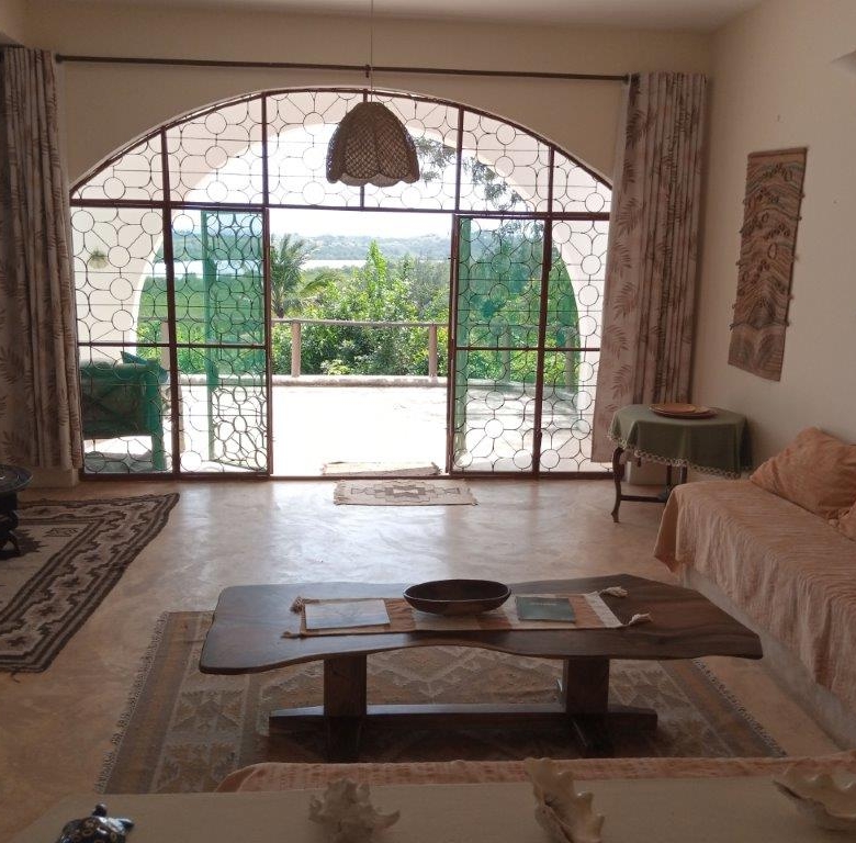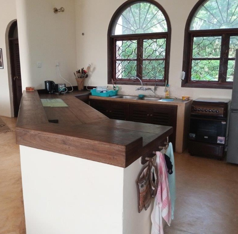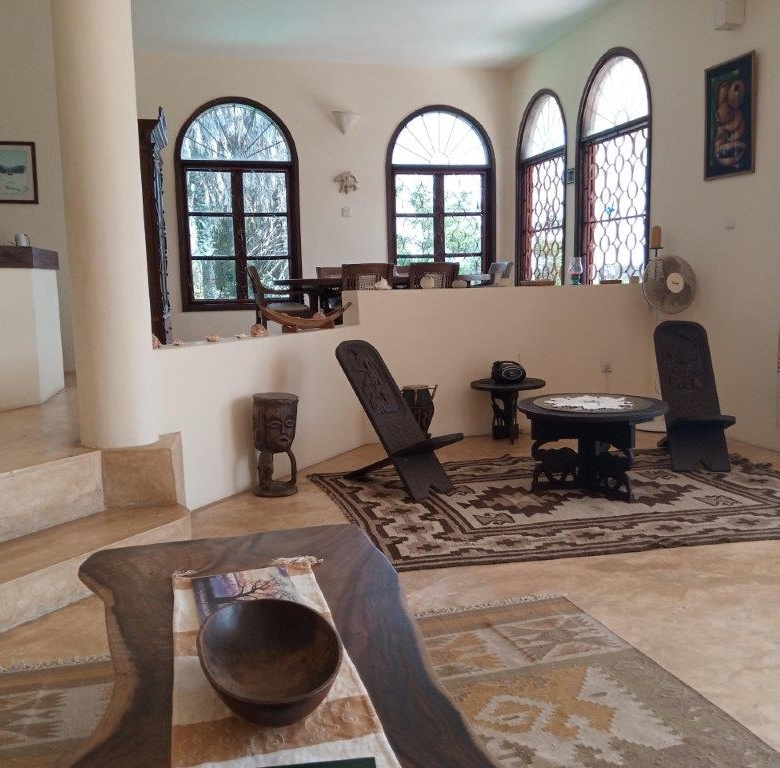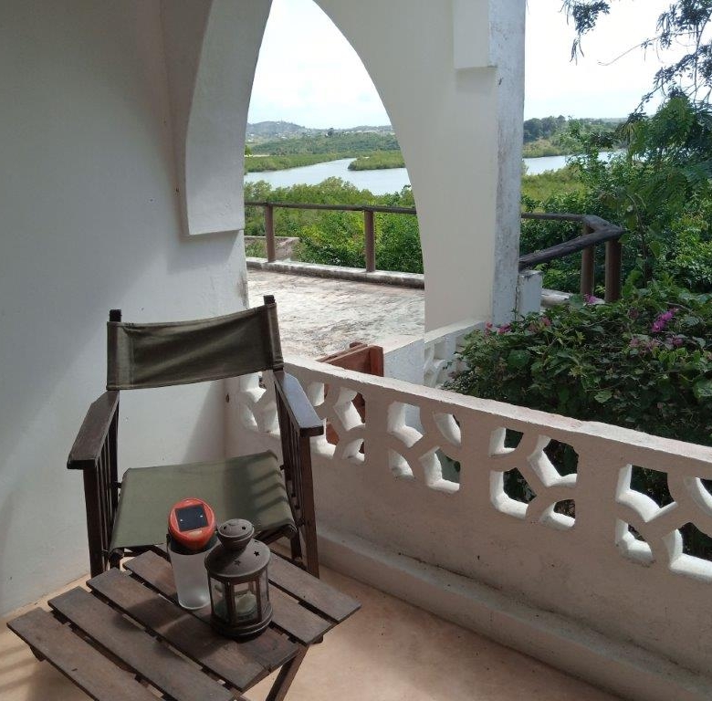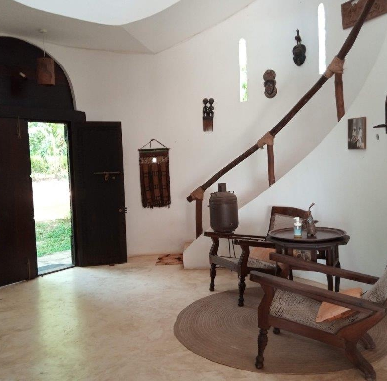 The forested property is presently used as an Eco Retreat as it is situated next to a conservation zone offering spectacular sunset views across Mtwapa Creek. The area is ideal for long walks along the mangrove forest, boat rides on the Creek and getting to know traditional villages in the neighbourhood. Beach hotels are 7 km away and Mombasa airport 25km. The house is constructed on three levels accessible through an indoor staircase built on wind tower principles which provide a cooling effect to the whole house. The design is Swahili coastal which provides a lot of space and airflow. Power supplies are mainly solar but main sockets are also powered through the national grid. Water supplies come from flat roofs rainwater collection and from a well.