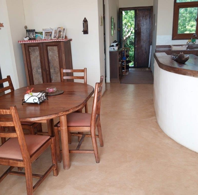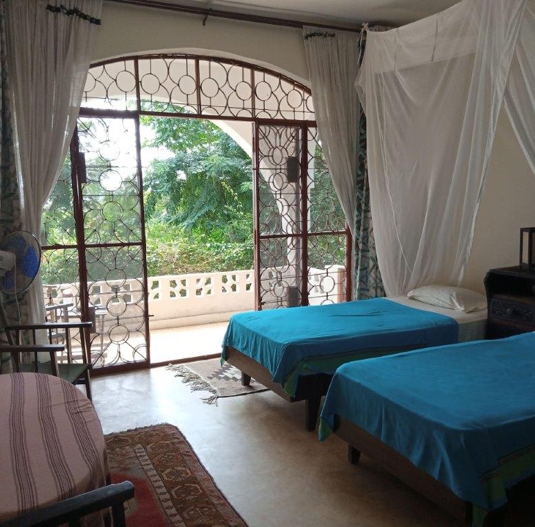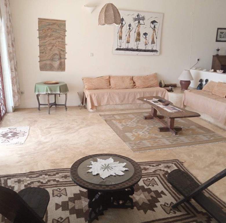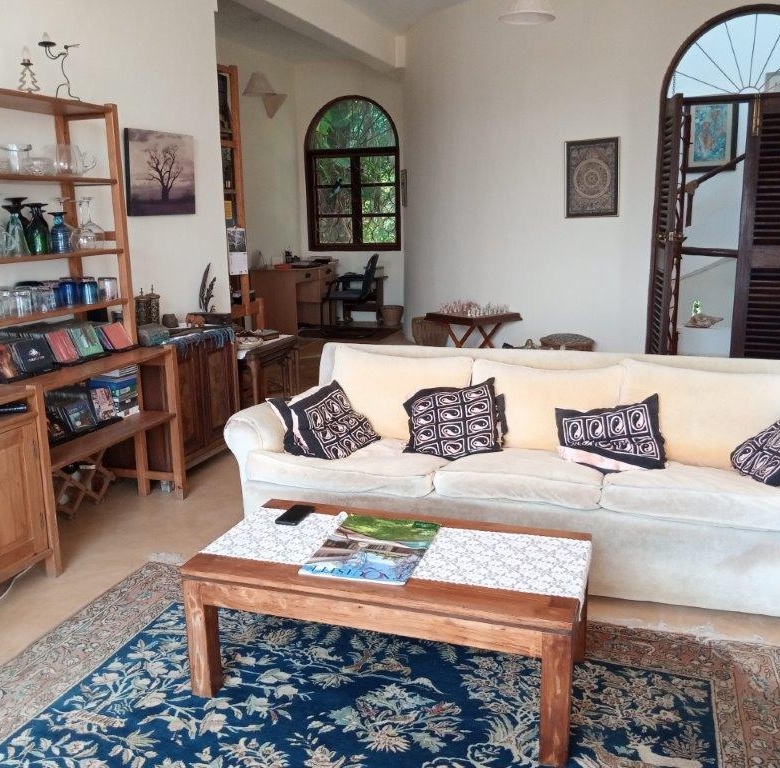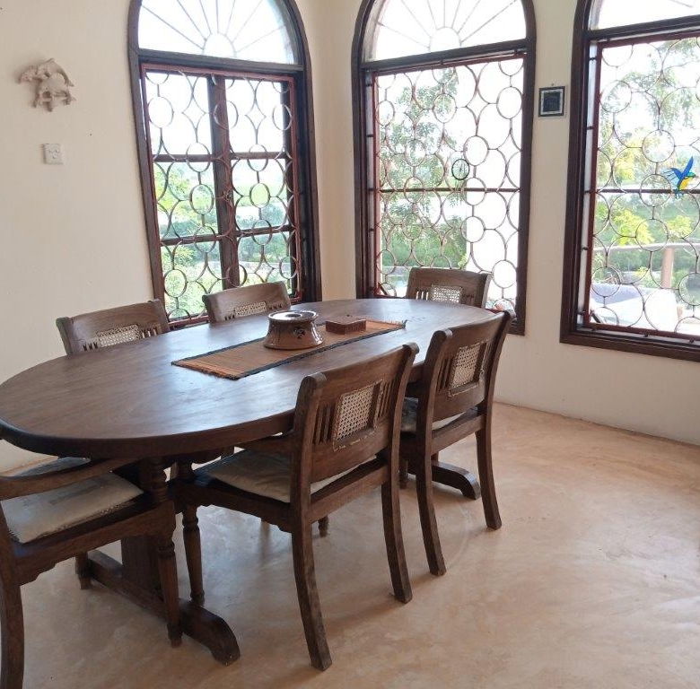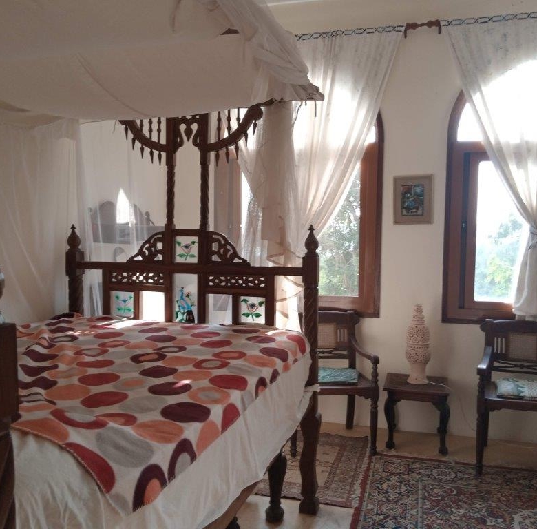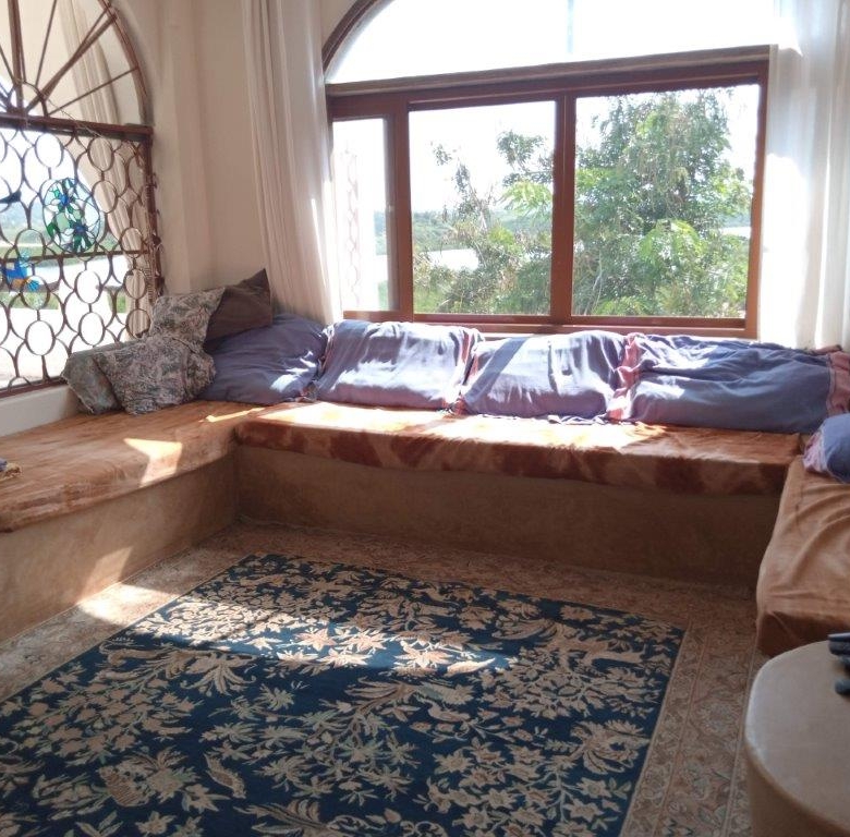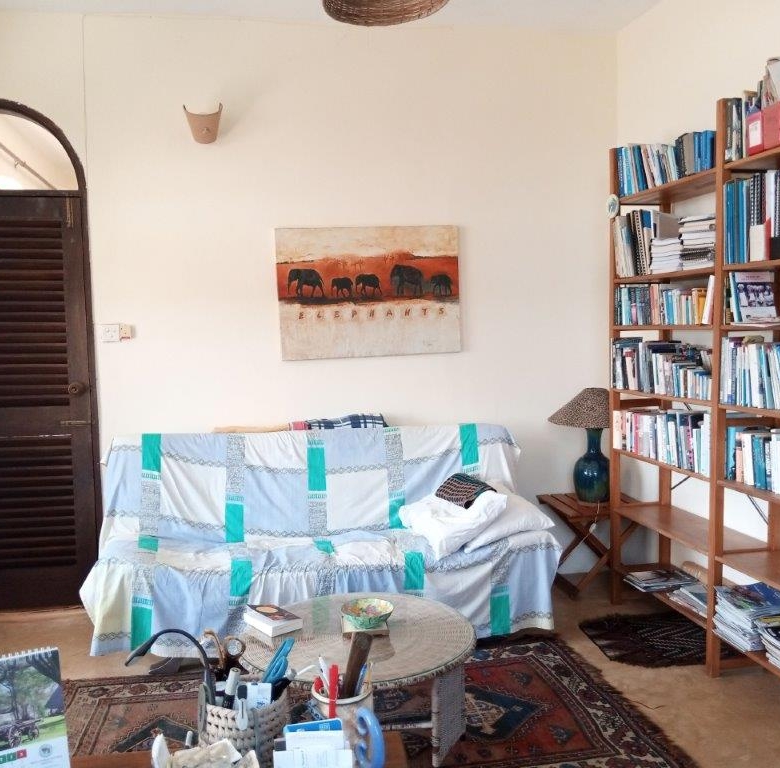 The forested property is presently used as an Eco Retreat as it is situated next to a conservation zone offering spectacular sunset views across Mtwapa Creek. The area is ideal for long walks along the mangrove forest, boat rides on the Creek and getting to know traditional villages in the neighbourhood. Beach hotels are 7 km away and Mombasa airport 25km. The house is constructed on three levels accessible through an indoor staircase built on wind tower principles which provide a cooling effect to the whole house. The design is Swahili coastal which provides a lot of space and airflow. Power supplies are mainly solar but main sockets are also powered through the national grid. Water supplies come from flat roofs rainwater collection and from a well.