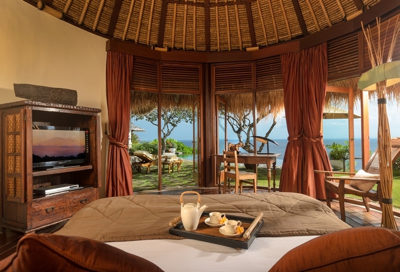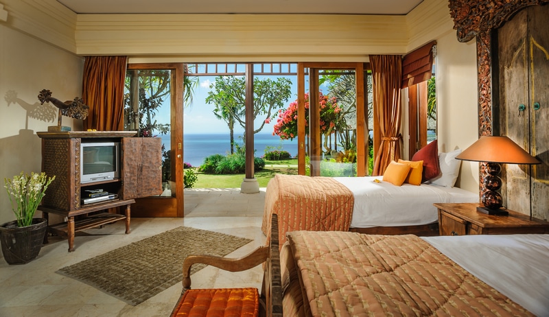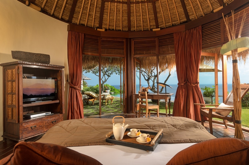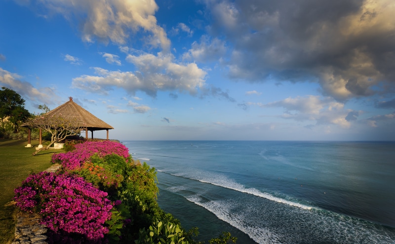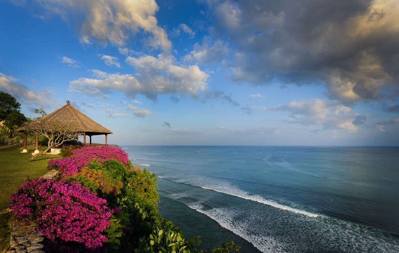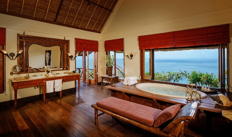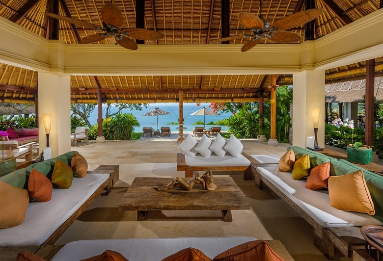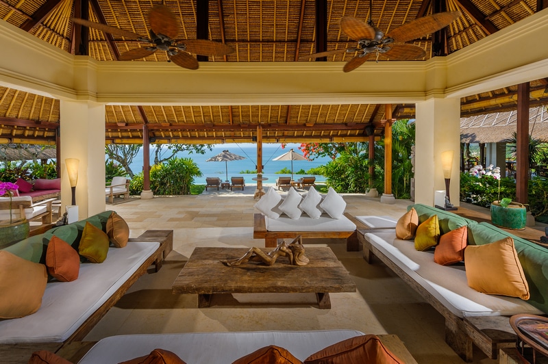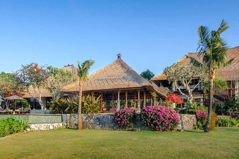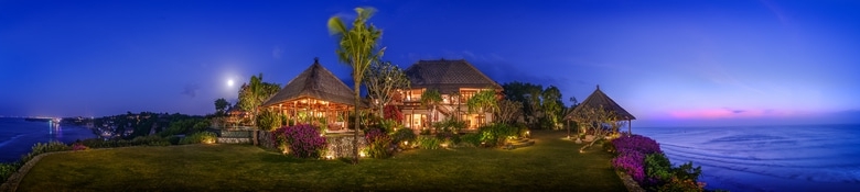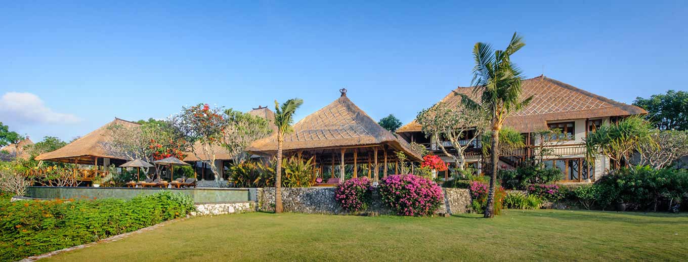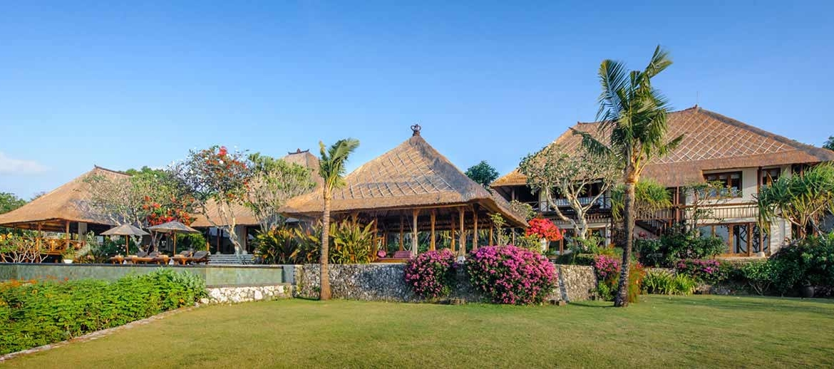 Perched on a cliff top, 50 metres above the dazzling azure sea, overhanging Bingin Beach, with spectacular bird’s eye views from the dramatic Bukit Peninsula to Bali’s southern coastline and beyond to Java, this five-bedroom exclusive private estate languishes over three sprawling acres (13,700 sqm). With its meticulously manicured lawns interspersed with ancient frangipani trees and bougainvillea blooms, the villa boasts a patina that comes with time, creating an elegance that most modern villas cannot match. They just don’t build villas on this kind of scale and beauty any more.The peaceful retreat shares its magnificent 180-degree views with a sprinkling of other private luxury villas and lavish hotels on Bali’s trendy Bukit Peninsula. Guests can wander down to Bingin beach from a pathway just beyond the villa’s gates, and even as far as Dreamland’s beach at low tide. Padang Padang, another popular surfing spot, with more facilities and easier access, is just under two kilometres. The iconic Uluwatu Temple is a twenty-minute drive away. Shops, boutiques, cafes and five-star restaurants are close by.One of the first properties to be built along this spectacular coast, this elegant, classic Balinese villa, is fully staffed and boasts exceptional facilities, including two pools, air-conditioned gym, a floodlit tennis court, a children’s play area, staff quarters and parking for 10 cars. Designed to merge perfectly with its coastal setting, it employs a delightful mix of limestone, teakwood and alang-alang thatch, blending traditional architecture and antique elements.The main three-bedroom villa and a two-bedroom self-contained guesthouse (with its own entrance and parking area and is linked to the main villa by a limestone walkway), each with its own cliff front swimming pools creates a magnificent property with style and personality. Consisting of airy and spacious bedrooms, formal and family-style living and dining areas, all with soaring ceilings, polished wood and marble floors, wide verandas, solid teak furniture, eclectic mix of classical art, sculpture and rustic objects, and floor-to-ceiling windows that embrace the breezes and the splendid views. On a clear day, the panorama encompasses the mighty Mt Agung in north Bali, to Java’s Mt Bromo in the west.The villa is entered through an antique Balinese gateway leading to a path lined with lotus ponds. The formal living area is centrally situated and overlooks the open-sided Wantilan pavilion and the main pool. To one side of the living space are the sleeping pavilions; behind is a two-storey building housing the study and TV room (that can be converted into another bedroom) and to the other side is the dining room and the large, gourmet kitchen. The master suite occupies the entire second floor of one pavilion with a wide wooden veranda that runs the length of the suite. it boasts an enormous walk-in dressing room, a huge bathroom which has windows on two sides that open to the ocean breeze, a jacuzzi tub set into a wooden platform overlooking the view while double sinks with brass taps and large ornate mirrors add a luxurious touch.With its impressive range of facilities and space enough for all, the villa is ideally suited as a luxury family residence or as a commercial property (specially designed function lawns makes the estate the perfect venue for weddings and events of any type) but the true value lies in the extraordinary backdrop and spectacular land the estate rests on.