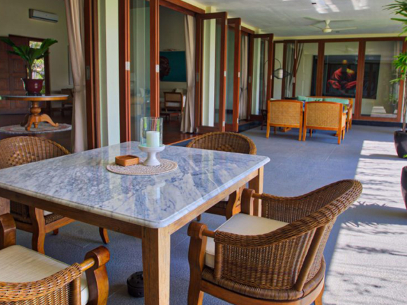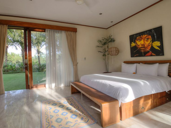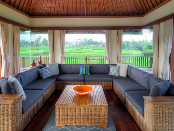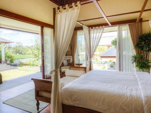 The villa boasts four spacious bedrooms, each with its own ensuite bathroom featuring a tub, rain shower, and sink, ensuring comfort and privacy for all occupants. The expansive living room provides a seamless flow to the dining area, which opens up to stunning rice field views, creating an atmosphere of elegance and relaxation. The fully furnished interiors reflect a sophisticated contemporary style, with carefully selected furnishings that complement the villa’s grand scale.