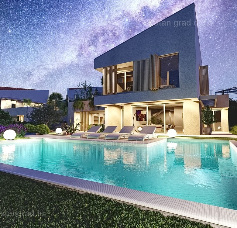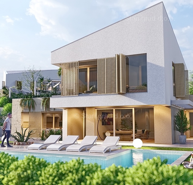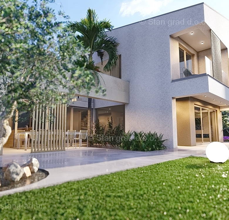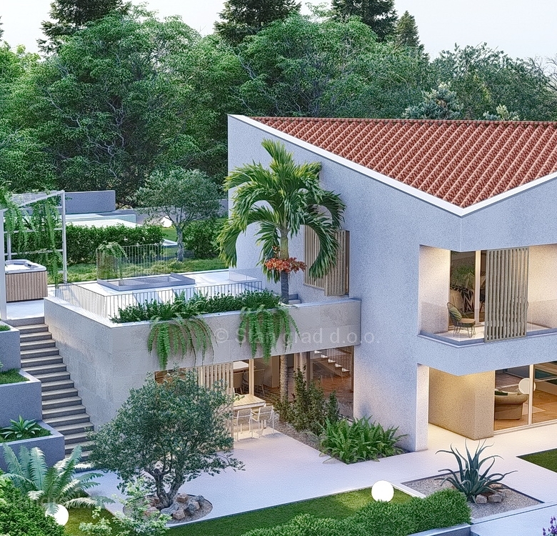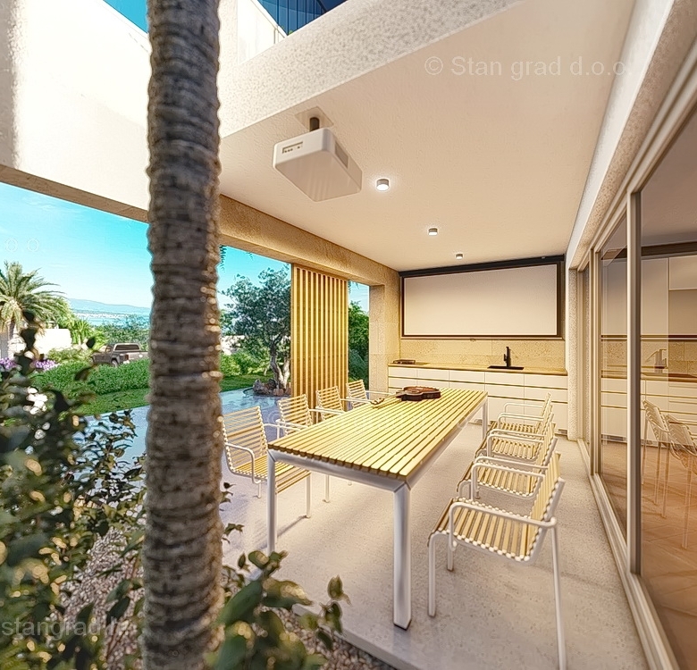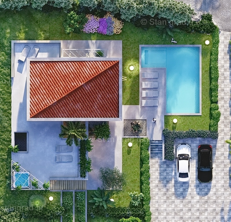 As part of the Kvarner real estate offer, the Stan Grad Immobilien agency is selling an exclusive design project – a luxury villa located in the northern Adriatic Mediterranean region, the island of Krk, on the highest point of the coastal town of Malinska with an enchanting view of the sea. This detached villa is ideal for anyone looking for a luxurious retreat that provides privacy, not only during the summer months, but all year round. The extremely attractive building covers a gross area of 200 m2, extending through a total of 2 floors (ground floor and first floor), providing a pleasant living space for its owners. The ground floor is characterized by an open concept of a spacious kitchen with a dining room and a living room surrounded by a glass wall, from which there is a view of the outdoor covered terrace with summer kitchen and swimming pool. Also on the ground floor there is one luxuriously equipped bedroom, bathroom and storage room. An internal staircase leads to the first floor of this impressive building, where there are two master bedrooms with private bathrooms, a storage room and a spacious terrace of 67.29 m2 with a sunbathing area and a jacuzzi. The added value of this whole building is given by the meticulously designed garden with a 40 m2 swimming pool and a sunbathing area, a terrace with an outdoor kitchen, which all together make the space ideal for outdoor gatherings and enjoying the sun. The villa is located within a unique resort consisting of 5 villas, and it is important to note that the owners will have a tennis court, basketball court, mini golf court, open gym, children’s park and bocce ball court. The facility and spacious grounds of this prestigious property allow for parking of several vehicles, ensuring practicality and comfort for the owners and their guests. The house in question is owned by a physical obligation and upon transfer of ownership is subject to the calculation of real estate transfer tax in the amount of 3%. The seller guarantees a quick transfer of ownership rights and proper ownership and technical documentation. We look forward to seeing you on the island of Krk. If you decide for us, our expert team will be happy to help you with the transfer of ownership and bills for utility connections to your name. Experience luxury, privacy and uniqueness in our superb villa on the island of Krk. Your oasis of peace is waiting for you!