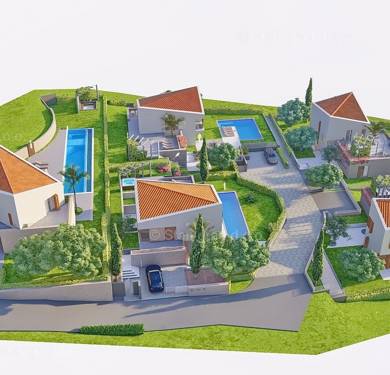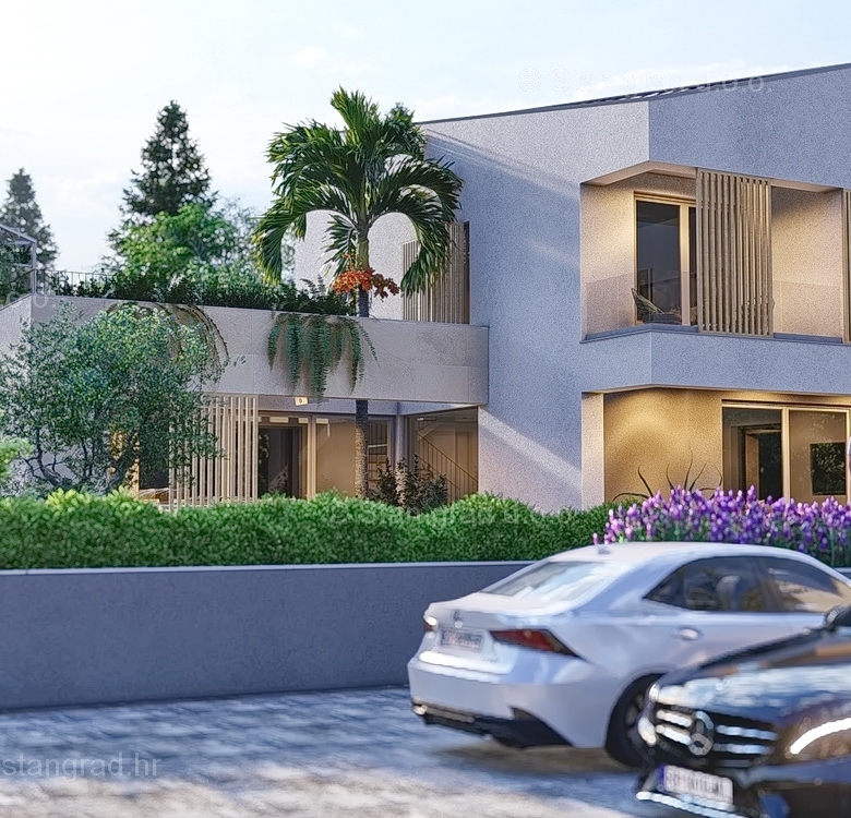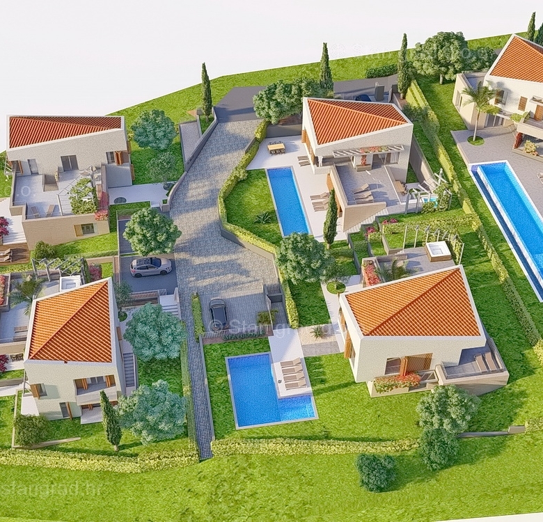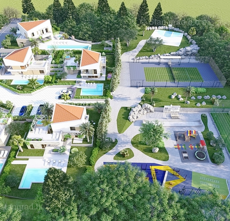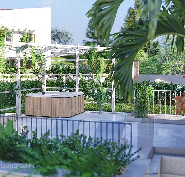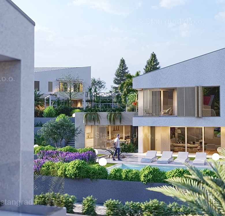 As part of the Kvarner real estate offer, the Stan Grad Immobilien agency is selling an exclusive design project – a luxury villa located in the northern Adriatic Mediterranean region, the island of Krk, on the highest point of the coastal town of Malinska with an enchanting view of the sea. This detached villa is ideal for anyone looking for a luxurious retreat that provides privacy, not only during the summer months, but all year round. The extremely attractive building covers a gross area of 200 m2, extending through a total of 2 floors (ground floor and first floor), providing a pleasant living space for its owners. The ground floor is characterized by an open concept of a spacious kitchen with a dining room and a living room surrounded by a glass wall, from which there is a view of the outdoor covered terrace with summer kitchen and swimming pool. Also on the ground floor there is one luxuriously equipped bedroom, bathroom and storage room. An internal staircase leads to the first floor of this impressive building, where there are two master bedrooms with private bathrooms, a storage room and a spacious terrace of 67.29 m2 with a sunbathing area and a jacuzzi. The added value of this whole building is given by the meticulously designed garden with a 40 m2 swimming pool and a sunbathing area, a terrace with an outdoor kitchen, which all together make the space ideal for outdoor gatherings and enjoying the sun. The villa is located within a unique resort consisting of 5 villas, and it is important to note that the owners will have a tennis court, basketball court, mini golf court, open gym, children’s park and bocce ball court. The facility and spacious grounds of this prestigious property allow for parking of several vehicles, ensuring practicality and comfort for the owners and their guests. The house in question is owned by a physical obligation and upon transfer of ownership is subject to the calculation of real estate transfer tax in the amount of 3%. The seller guarantees a quick transfer of ownership rights and proper ownership and technical documentation. We look forward to seeing you on the island of Krk. If you decide for us, our expert team will be happy to help you with the transfer of ownership and bills for utility connections to your name. Experience luxury, privacy and uniqueness in our superb villa on the island of Krk. Your oasis of peace is waiting for you!