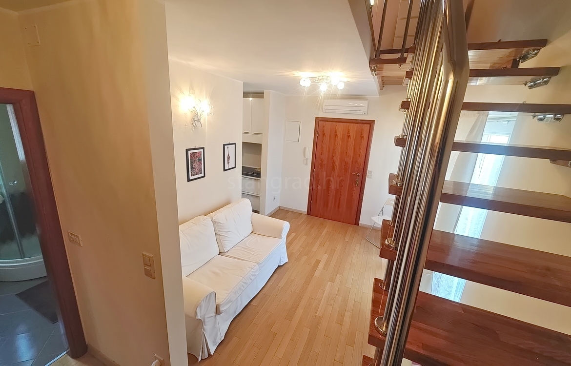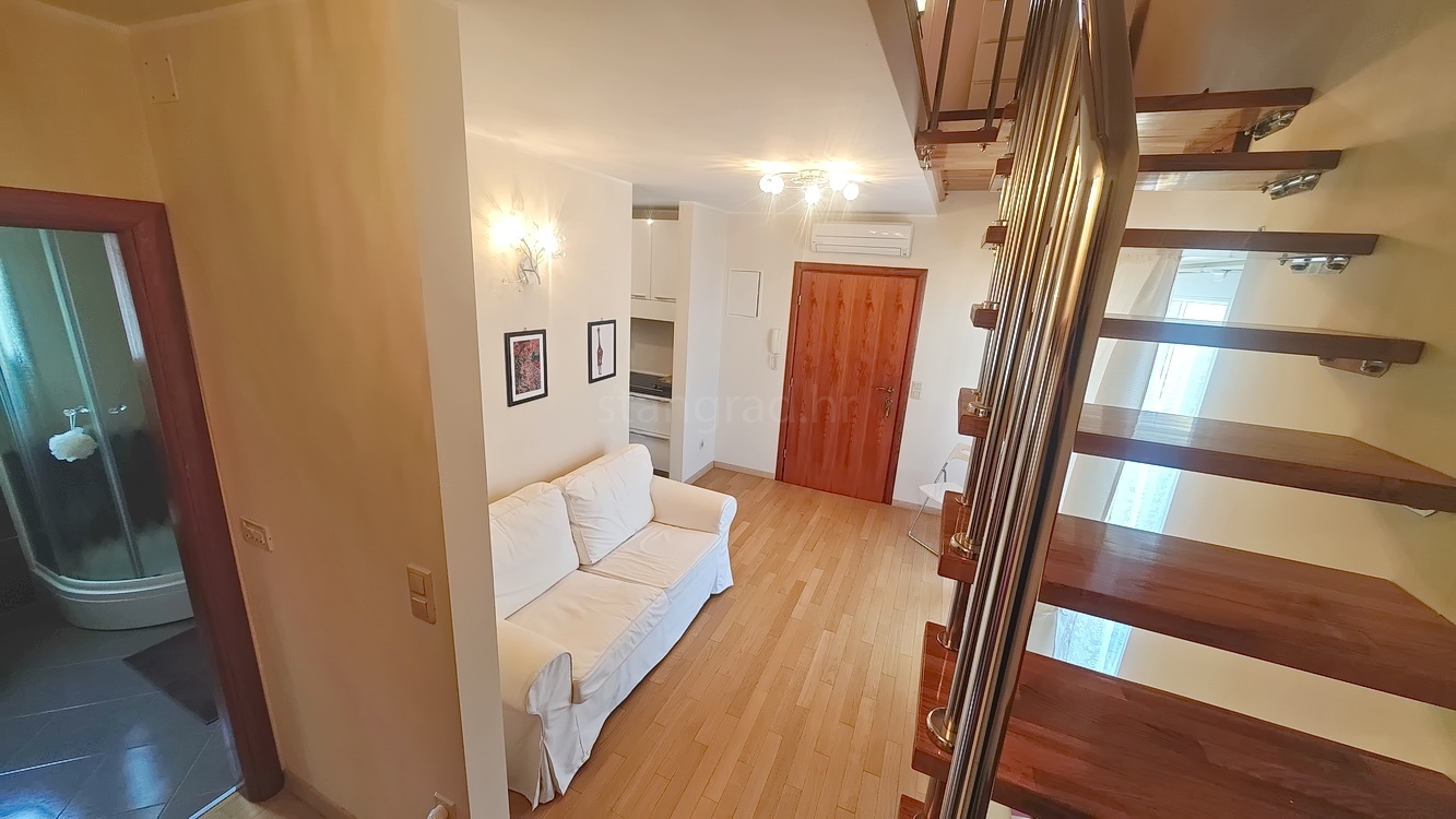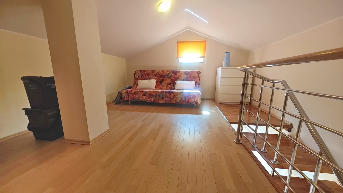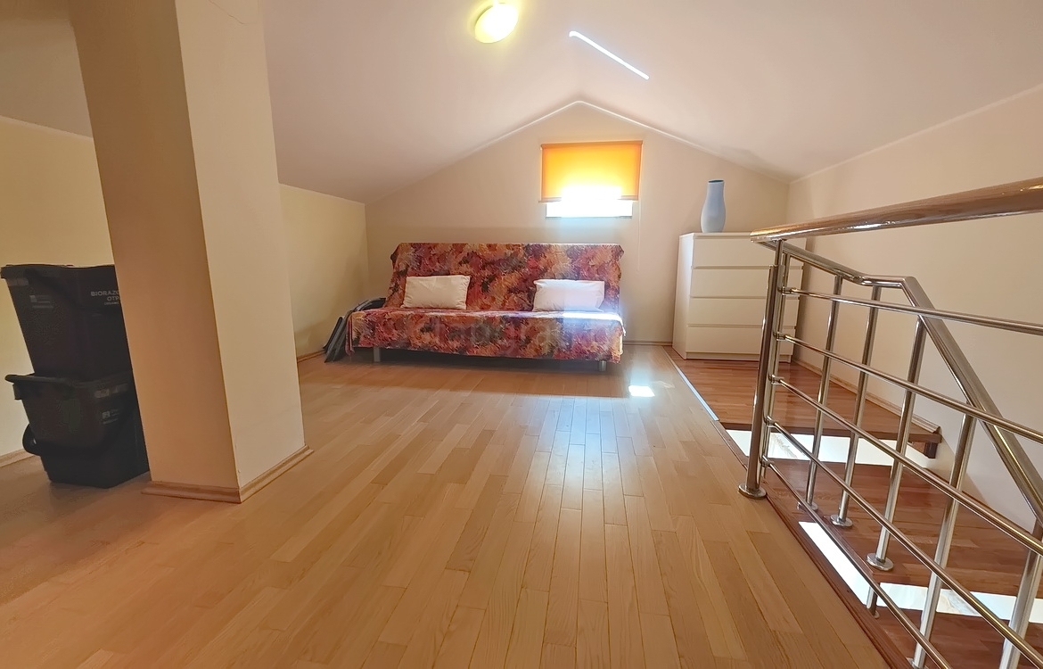 This duplex apartment is located in a well-constructed building, spanning the first floor and a high attic, with a total area of 50 m². The lower level features an entrance hallway, a spacious living room with a kitchen and dining area, a bedroom, a bathroom, and a balcony. On the upper level, within the gallery, there is an additional bedroom. The apartment is fully equipped with high-quality furniture and modern technical appliances and is excellently maintained.