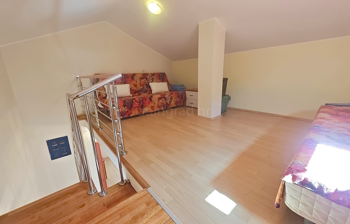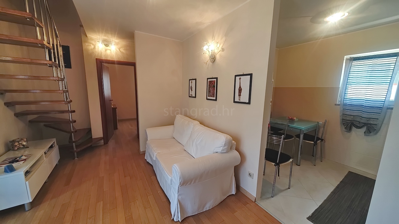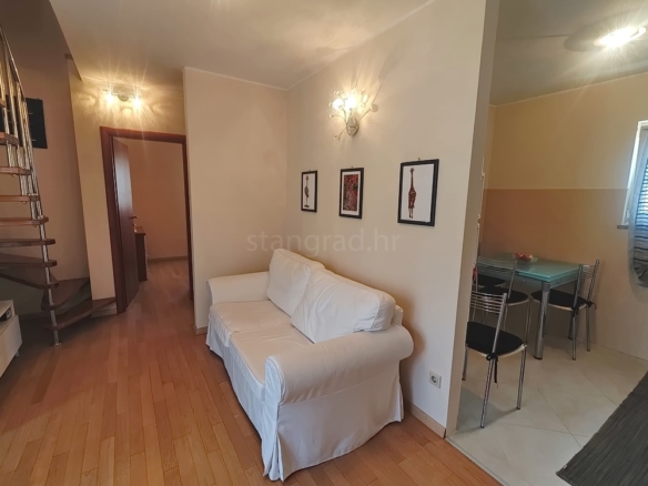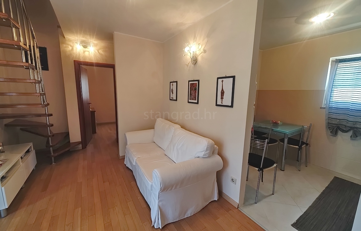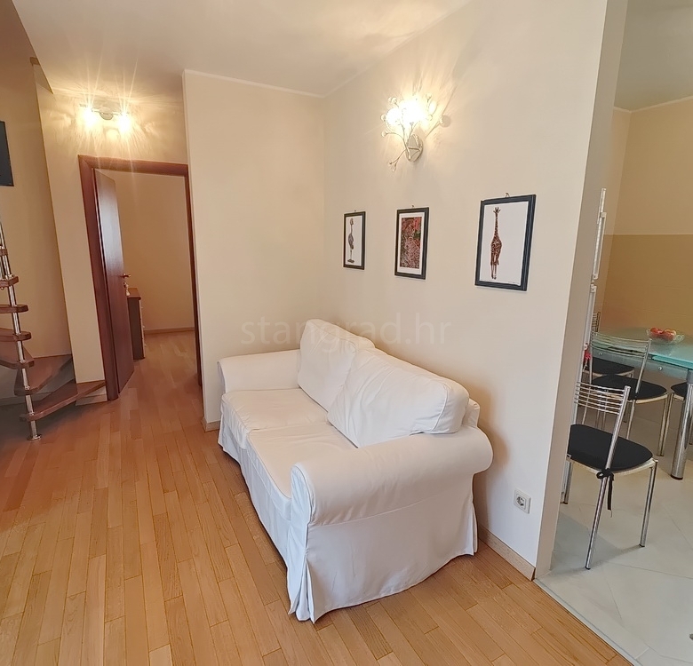 This duplex apartment is located in a well-constructed building, spanning the first floor and a high attic, with a total area of 50 m². The lower level features an entrance hallway, a spacious living room with a kitchen and dining area, a bedroom, a bathroom, and a balcony. On the upper level, within the gallery, there is an additional bedroom. The apartment is fully equipped with high-quality furniture and modern technical appliances and is excellently maintained.