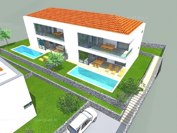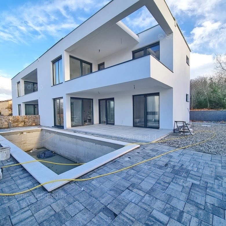 The agency Stan Grad Immobilien in Kvarner has for sale an exceptional Mediterranean urban house built according to a modern project on the developed and attractive northern Adriatic area, the island of Krk. This attractive property is located in an outstanding location close to the center of the famous tourist town of Malinska. Structurally, this is a two-story house. The modernly designed house includes useful space on a total of 2 floors. The property covers a total area of 143 m2. This area on the ground floor includes the entrance hall, toilet, bedroom, kitchen with dining room, living room with access to the terrace and garden. On the first floor of the property, there are 3 bedrooms, each with its own bathroom and exit to the balcony. The added value of this entire facility is given by the garden with a swimming pool and sun deck. The yard of the property includes a place arranged for comfortable parking of two vehicles. In addition to the above, it is important to note that the house has a very nice open view of the sea. The planned completion of the works is expected in the middle of 2025. This property is subject to VAT. The seller of this house guarantees complete and orderly documentation and a simple transfer of the property to the buyer. We will warmly welcome you in Kvarner, at the address of our office on the island of Krk. In addition to a professional tour and presentation of the property and its legal status, the friendly staff of our agency will be happy to help the buyer of the property in the transfer of ownership rights and the transfer of utility bills to their name.