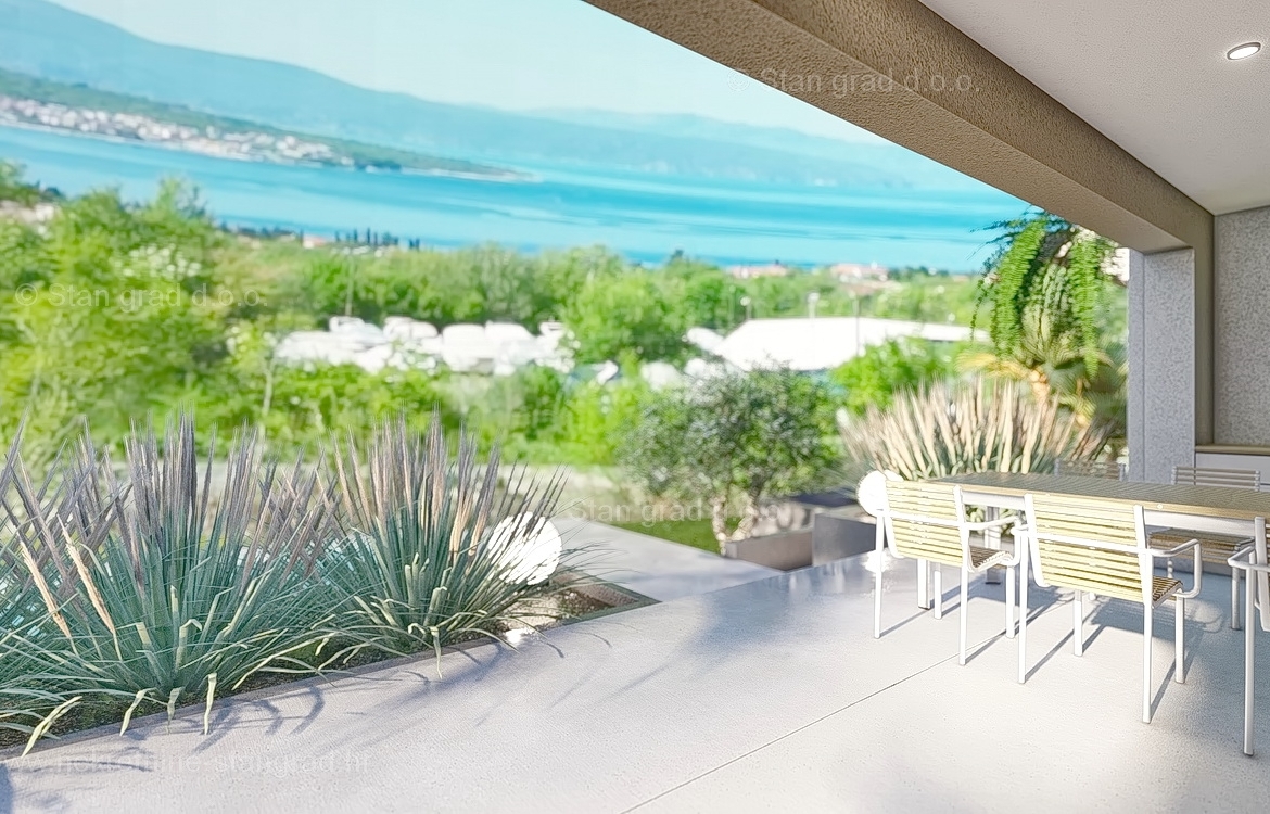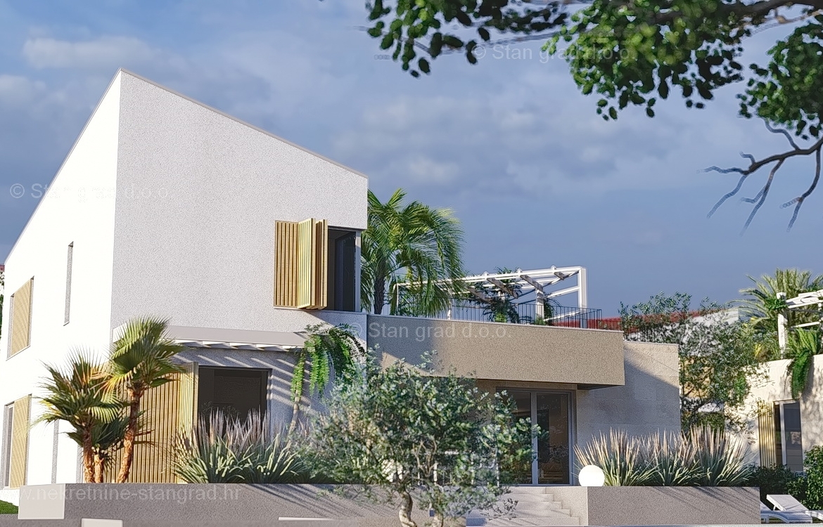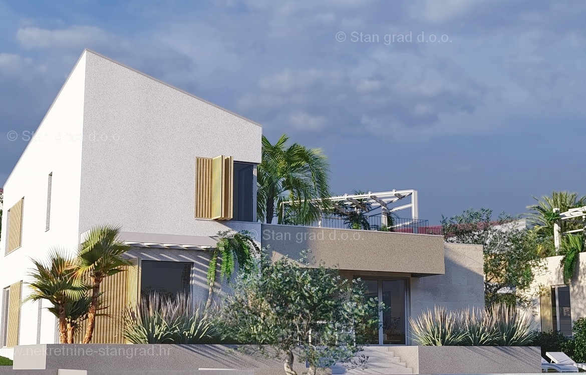 As part of the Kvarner real estate offer, the Stan Grad Immobilien agency is selling an exclusive design project – a luxury villa located in the northern Adriatic Mediterranean region, the island of Krk, on the highest point of the coastal town of Malinska with an enchanting view of the sea. This detached villa is ideal for anyone looking for a luxurious retreat that provides privacy, not only during the summer months, but all year round. The extremely attractive building covers a gross area of 279 m2, extending through a total of 3 floors (basement, ground floor and first floor), providing a pleasant living space for its owners. In the basement there is a space that has been carefully designed and includes a gym, a bathroom, an additional toilet and a storage room. The ground floor is characterized by an open concept of a spacious kitchen with a dining room and a living room surrounded by a glass wall with a view of the outdoor covered terrace and pool. Also on the ground floor there are two luxuriously equipped master bedrooms with private bathrooms and access to the terrace. An internal staircase leads to the first floor of this impressive building, where there are additional master bedrooms with their own bathrooms, a storage room and a spacious terrace of 72.23 m2 with a sun deck and jacuzzi. The added value of this entire building is given by the meticulously designed garden with a 32 m2 swimming pool and a sunbathing area, a terrace with an outdoor kitchen, which all together make the space ideal for outdoor gatherings and enjoying the sun. The villa is located within a unique resort consisting of 5 villas, and it is important to note that the owners will have a tennis court, basketball court, mini golf court, open gym, children’s park and bocce ball court. The facility and spacious grounds of this prestigious property allow for parking of several vehicles, ensuring practicality and comfort for the owners and their guests. The house in question is owned by a physical obligation and upon transfer of ownership is subject to the calculation of real estate transfer tax in the amount of 3%. The seller guarantees a quick transfer of ownership rights and proper ownership and technical documentation. We look forward to seeing you on the island of Krk. If you decide for us, our expert team will be happy to help you with the transfer of ownership and bills for utility connections to your name. Experience luxury, privacy and uniqueness in our superb villa on the island of Krk. Your oasis of peace is waiting for you!