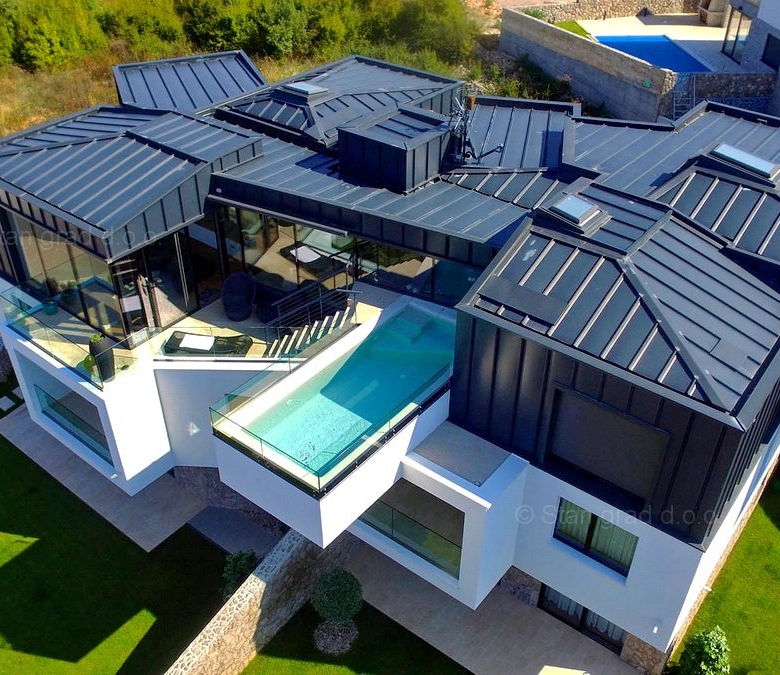 By combining cutting-edge technology and materials with traditional elements, the property fits seamlessly into its surroundings. This “smart” low-energy home with open sea views has been built and equipped using state-of-the-art materials and technology. It features 15 cm thick thermal insulation, extensive use of stone and glass surfaces, a modern heating and cooling system, underfloor heating, and a German “VIESSMANN” heat pump. The property also includes remote control of heating, cooling, appliances, and electrical installations, a private elevator, video surveillance, alarm system, and fire detection.