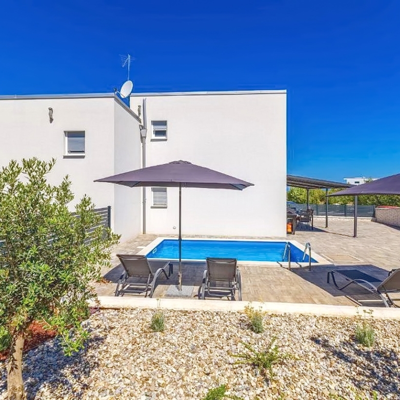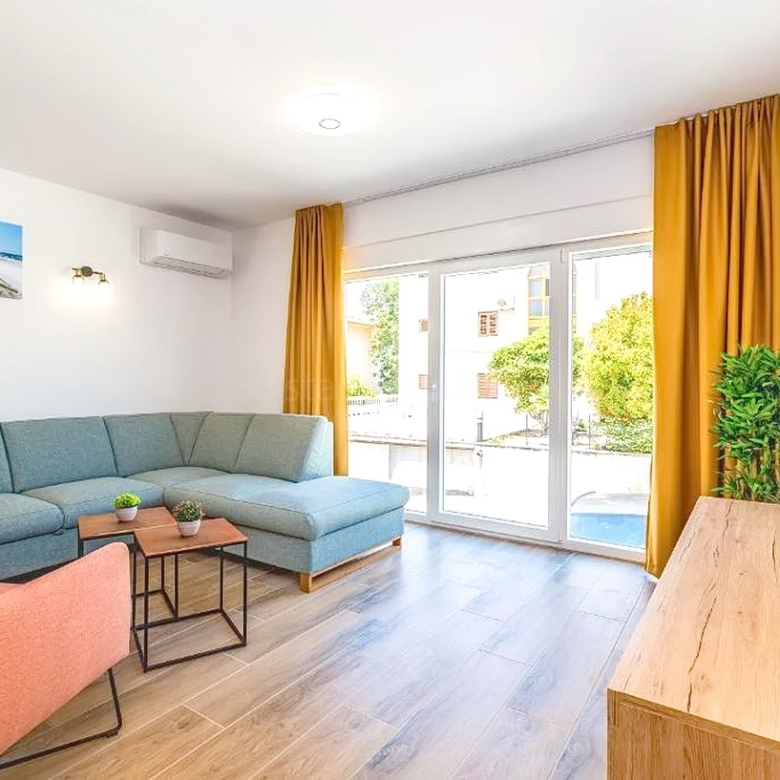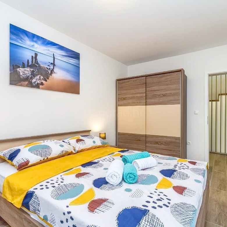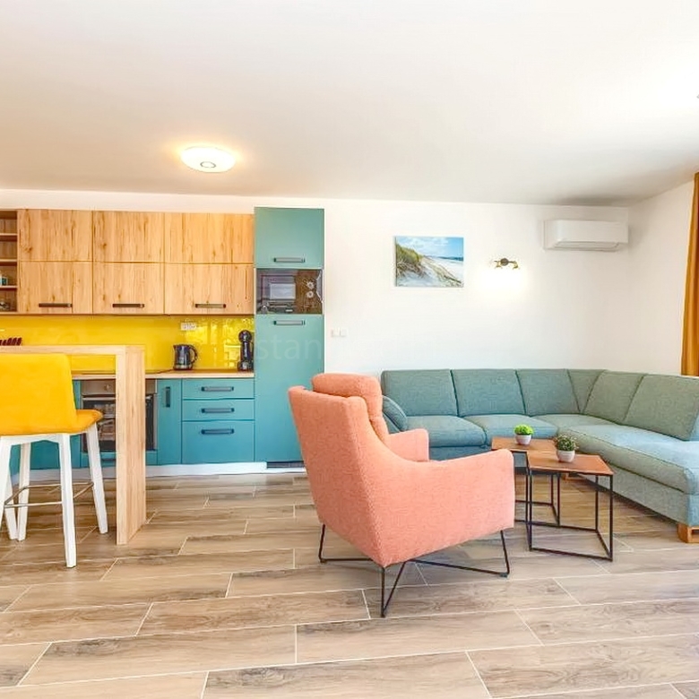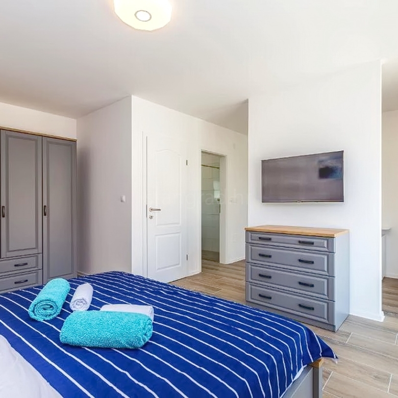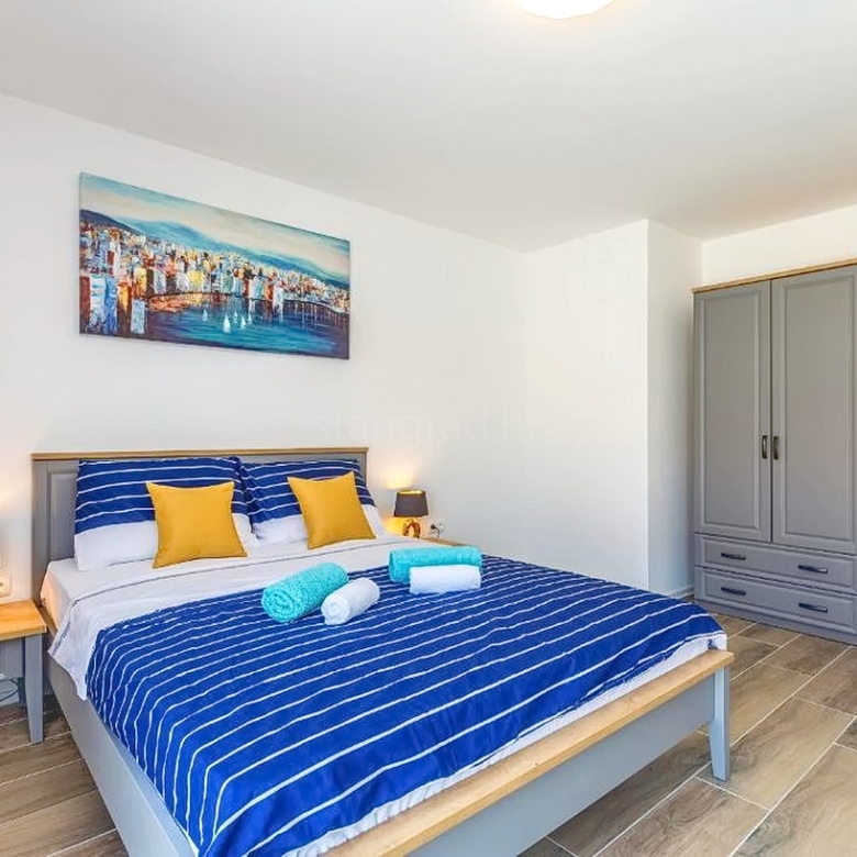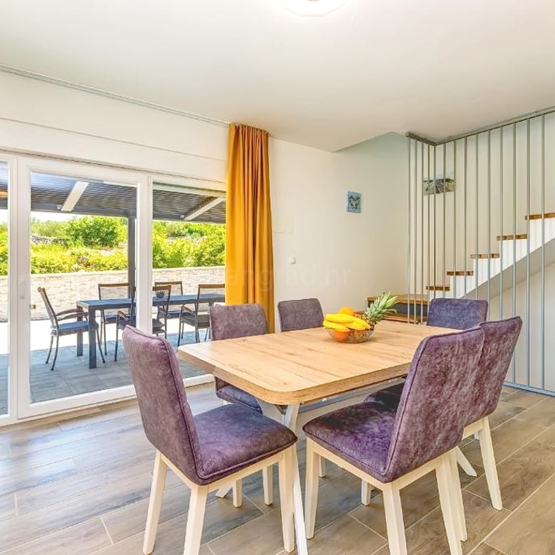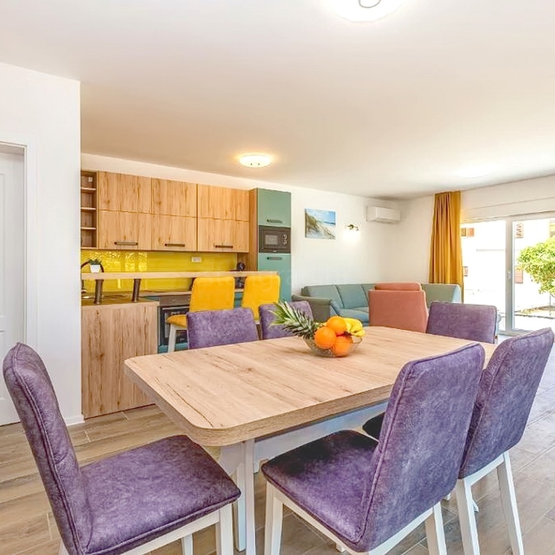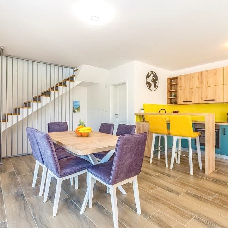 At the Stan Grad Immobilien agency in the Kvarner region, an exceptional Mediterranean urban house built according to a modern design is for sale in the developed and attractive northern Adriatic area of the island of Krk. This beautiful house is located in a highly desirable location, close to the sea and the center of the popular tourist town of Malinska. Structurally, it is a semi-detached, two-story house.