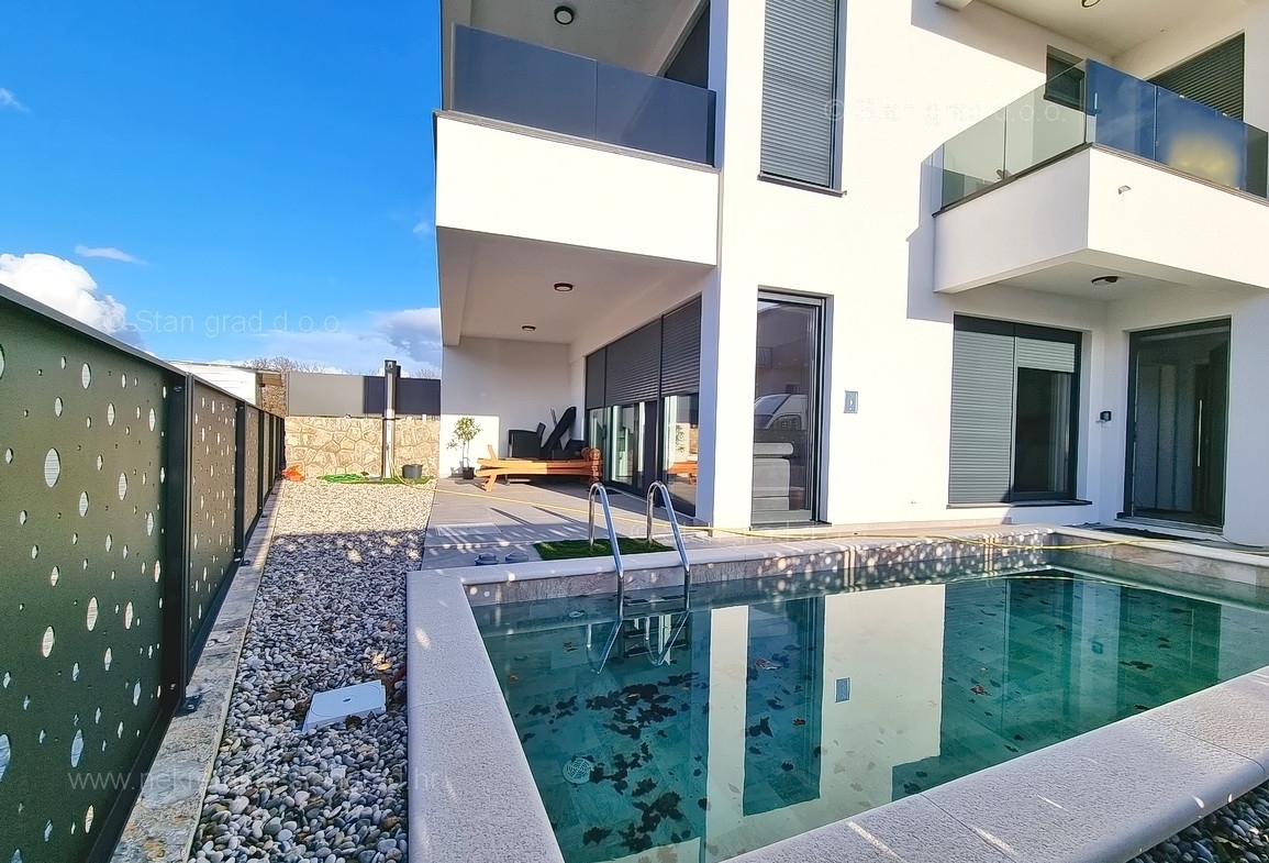 The agency Stan Grad Immobilien in Kvarner has for sale an exceptional Mediterranean urban house built according to a modern project on the developed and attractive northern Adriatic area, the island of Krk. This desirable house is located in a very good location near the center of the famous tourist destination of Malinska. Structurally, this is a two-story house. The object of excellent quality is built on a total of 2 spatially useful floors. The property covers a total area of 156 m2. The mentioned area on the ground floor contains an entrance hall, toilet, kitchen with dining room and living room with access to the terrace and garden, and on the first floor there are 3 bedrooms, each with its own bathroom and access to the balcony. The property is fully equipped with modern furniture and modern and high-quality technical equipment. The special charm of this property is given by the exceptionally landscaped garden, which includes a swimming pool and a sunbathing area. In the garden of this house there is enough space to park two cars. In addition to the above, it is important to note that the house has a very nice open view of the sea. This property is subject to VAT. The seller guarantees the orderliness of the relevant technical and ownership documentation, as well as the possibility of a quick and smooth transfer of ownership of the house to the buyer. You are warmly welcome to our golden island of Krk and to our Kvarner branch. In addition to a professional tour and presentation of the property and its legal status, the friendly staff of our agency will be happy to help the buyer of the property in the transfer of ownership rights and the transfer of utility bills to their name.