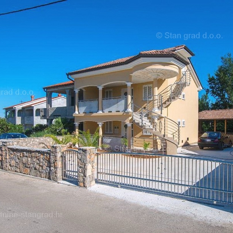 For sale by the Stan Grad Immobilien agency on the Kvarner coastal locality, the island of Krk, is a house of very good quality and in a general state of preservation. The prominent house is located in a nice location not too far from the center of the famous town of Malinska. It is essentially a semi-detached house with an attic that can be converted into another residential unit. The very beautiful building is built on 3 usable floors. The house consists of two separate apartments. The total area of this house is 160 m2. This area contains two apartments, each approx. 60 m2, consisting of a living room and a kitchen with a dining room, 2 bedrooms and a bathroom. The interior of the property is very well maintained and fully equipped with all the necessary technical devices and quality furniture. The ownership of this house includes a very nicely decorated and refined garden where there is a covered terrace with a barbecue and a summer kitchen and bathroom. The spacious garden of the described property is equipped with comfortable parking for several vehicles. In addition to the above, it should be noted that the house has a beautiful view of this seaside place. This real estate is owned by a natural person and in the name of its transfer, the buyer of the house is obliged to pay real estate sales tax in the amount of 3%. The owner of the house guarantees a quick transfer of the right to dispose of the property to the buyer. We cordially await you at the address of the office on the island of Krk. The Stan Grad Immobilien agency will provide all its clients with all the necessary assistance in registering ownership and taking over the real estate itself.