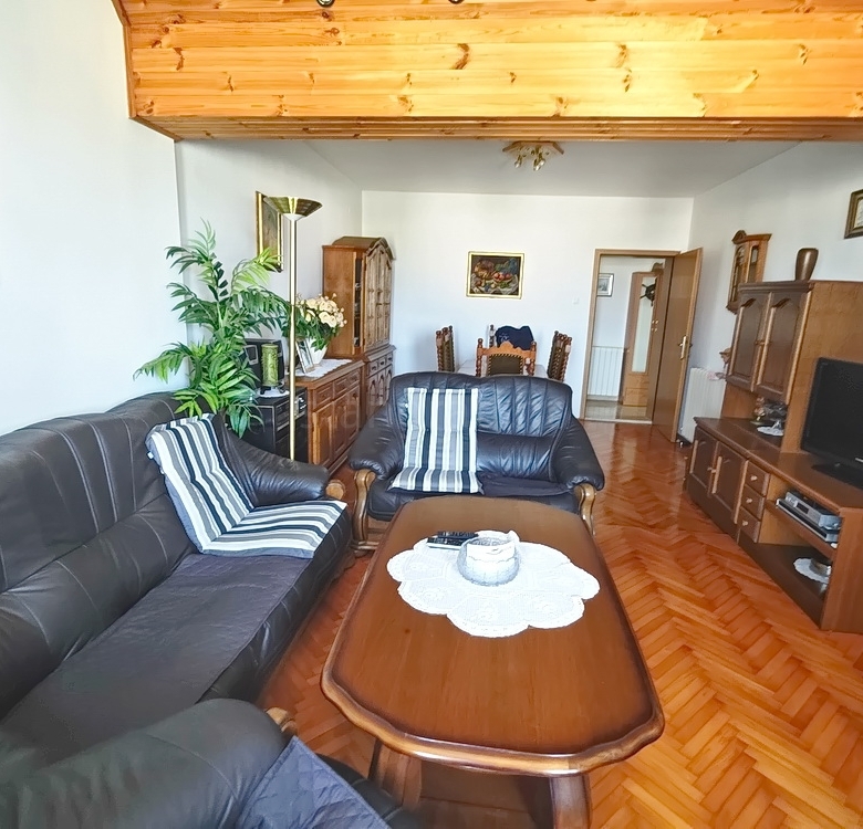 The house consists of three separate apartments spread across three floors, with a total surface area of 267 square meters. On the ground floor, there is a 100-square-meter apartment that includes an entrance hall, storage room, bathroom, three bedrooms, living room, kitchen with dining area, and two terraces. The first floor houses another apartment of the same size, comprising an entrance hall, bathroom, storage room, balcony, two bedrooms, kitchen with dining area, living room, and a terrace. The third residential unit is located in the basement. The interior of the house is well-preserved and equipped with quality furniture and technical devices, ensuring functionality and comfortable living.
