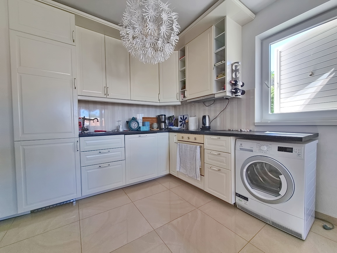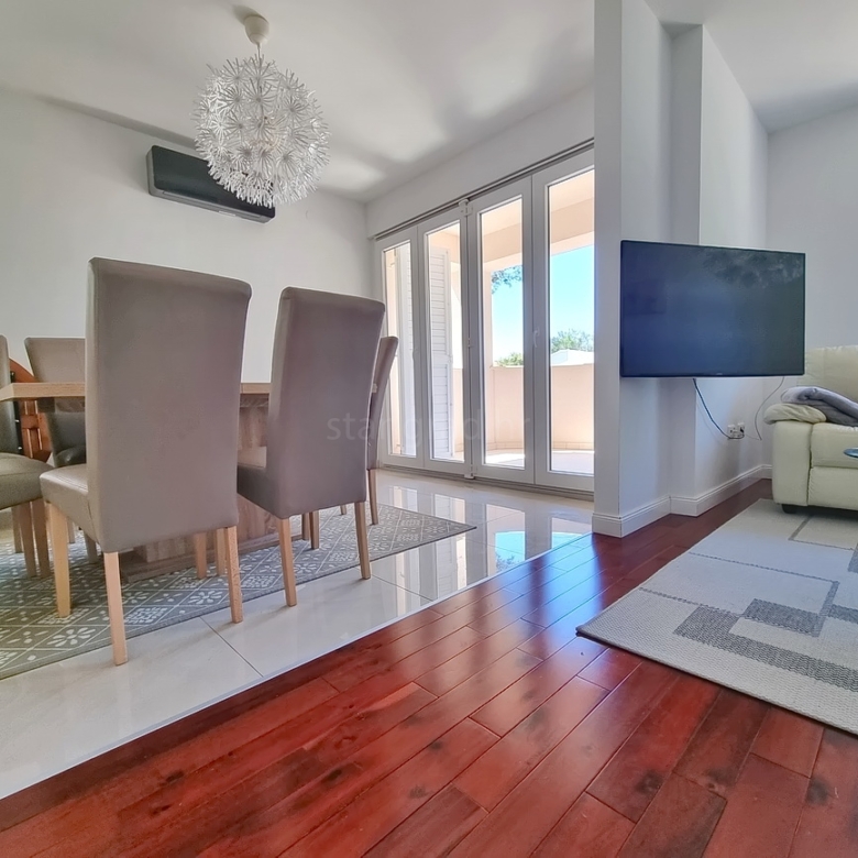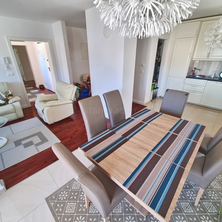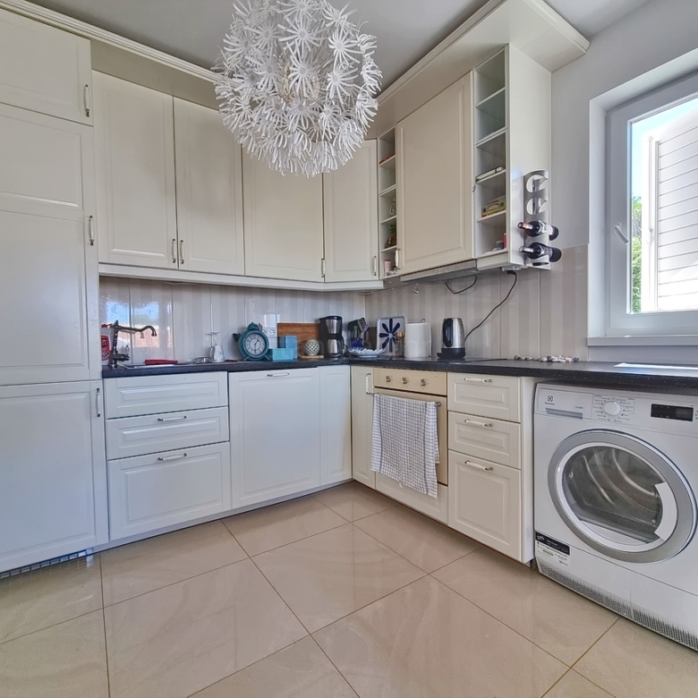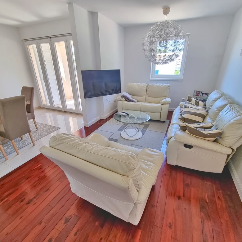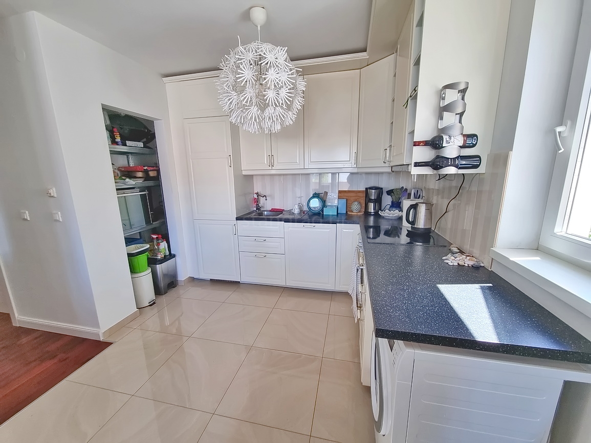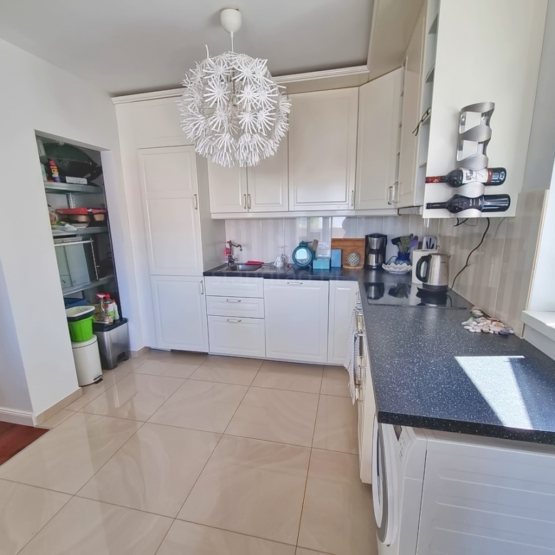 This is a very spacious and comfortable single-level apartment. It is located on the 1st floor of a well-maintained, high-quality building. The total area of the apartment is 91 m² and includes an entrance hallway, storage room, living room and kitchen with dining area, three bedrooms, a bathroom, a separate toilet, and two terraces. The interior is exceptionally well maintained and features luxurious, high-quality furniture and modern technical equipment.