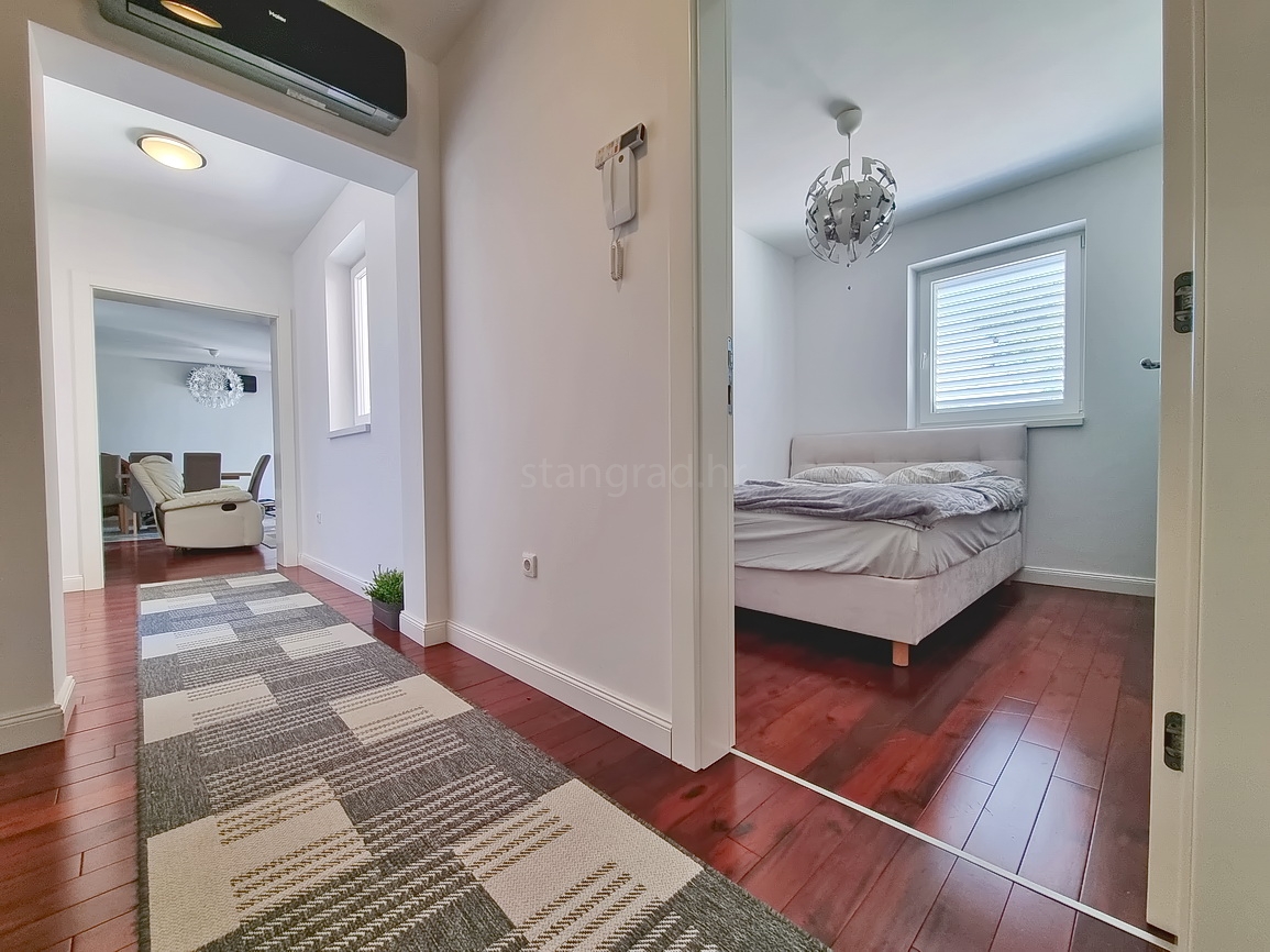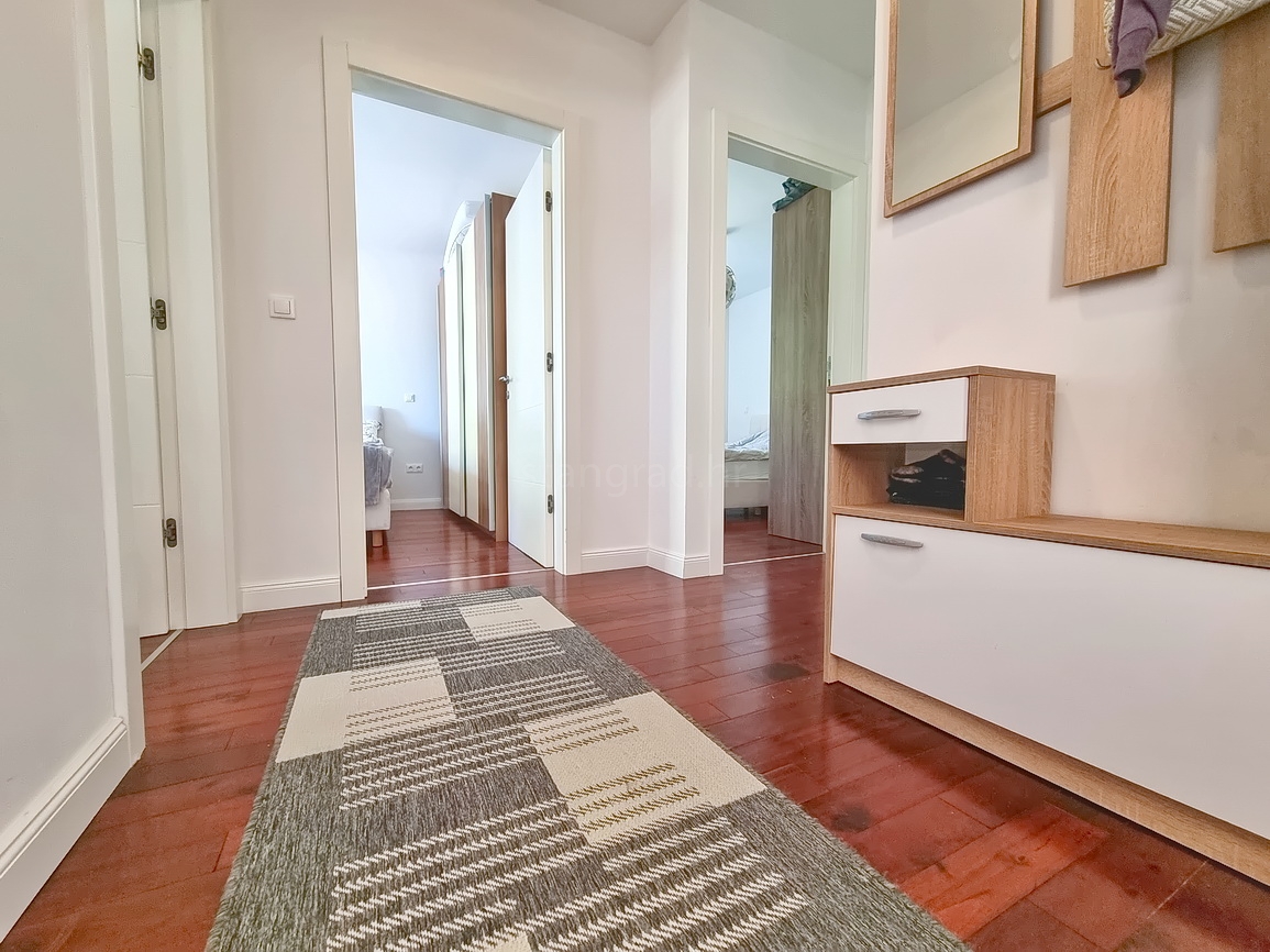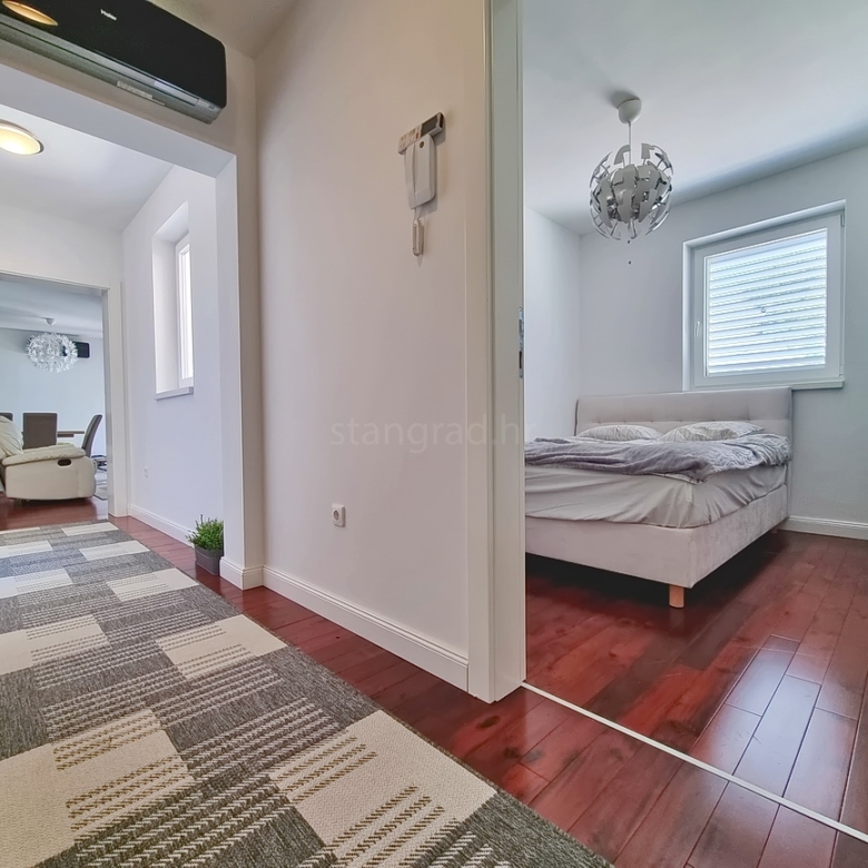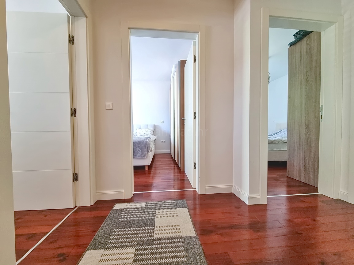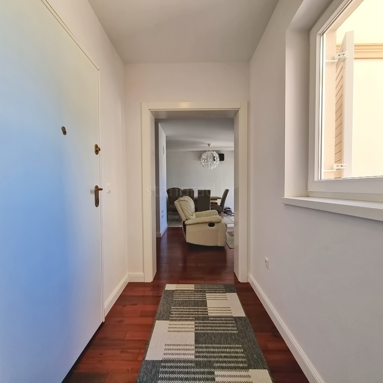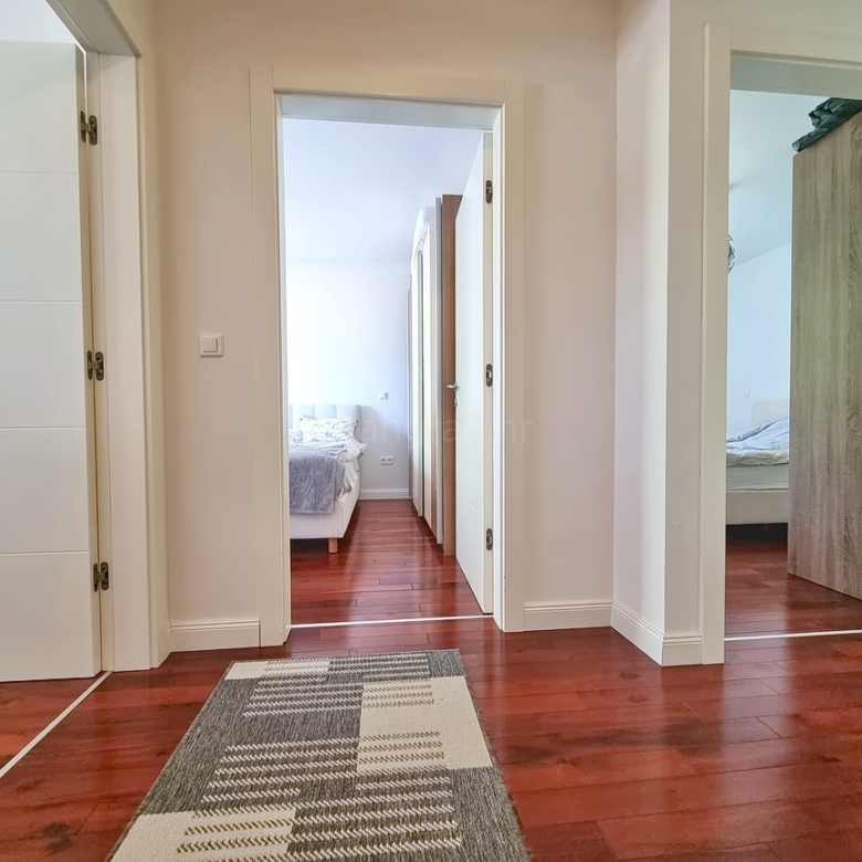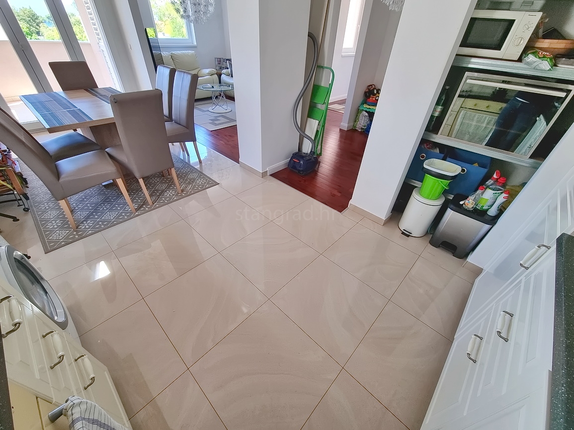 This is a very spacious and comfortable single-level apartment. It is located on the 1st floor of a well-maintained, high-quality building. The total area of the apartment is 91 m² and includes an entrance hallway, storage room, living room and kitchen with dining area, three bedrooms, a bathroom, a separate toilet, and two terraces. The interior is exceptionally well maintained and features luxurious, high-quality furniture and modern technical equipment.
