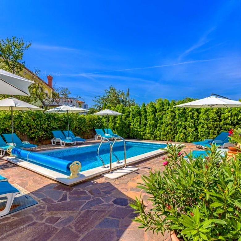 This very good and high-quality property consists of 3 usable floors: a ground floor and two upper floors. The house contains 9 separate apartments, each with its own entrance. It occupies a total area of 680 m2. On the ground floor, there are two one-bedroom and one two-bedroom apartments, a laundry room, and a storage room. An external staircase leads to the first floor, which consists of 5 studio apartments, each with its own balcony. On the second floor, there is an apartment with a net area of 177 m2, consisting of an entryway, 3 bedrooms, 2 bathrooms, a large living room, a kitchen with a dining area, and a terrace with a partial sea view. All rooms are air-conditioned, and the property is being sold fully furnished. The landscaped yard includes a shower, a pool, a sunbathing area, and a summer kitchen with a barbecue. The property’s yard also has space for comfortably parking vehicles.