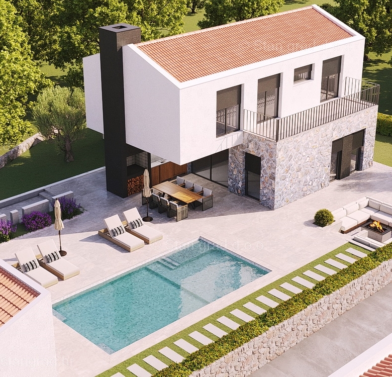 The rest of the beautifully landscaped yard, covering approximately 658 m², features a large heated pool of 46.5 m², a sunbathing area, and a lounge space with a fireplace in the center. The backyard offers ample parking space for at least two vehicles. The property is characterized by high-quality construction and premium equipment. The villa will be equipped with top-notch carpentry, flooring made of high-quality ceramics and stone, premium sanitary fixtures, ceiling air conditioning, and underfloor heating with a heat pump. The surrounding environment will be beautifully landscaped with Mediterranean plants, green areas, and plenty of stone details.