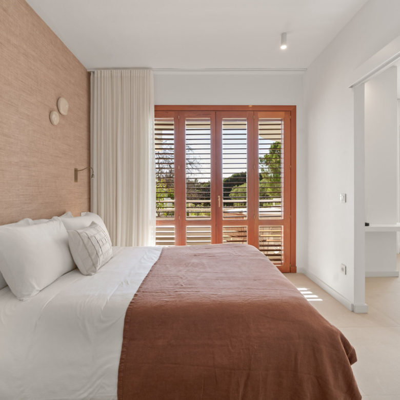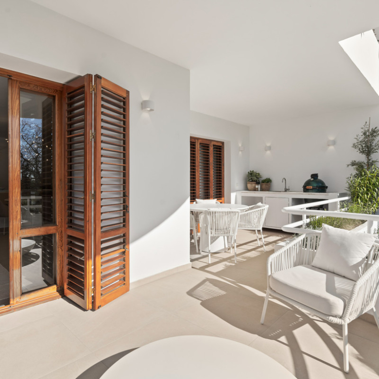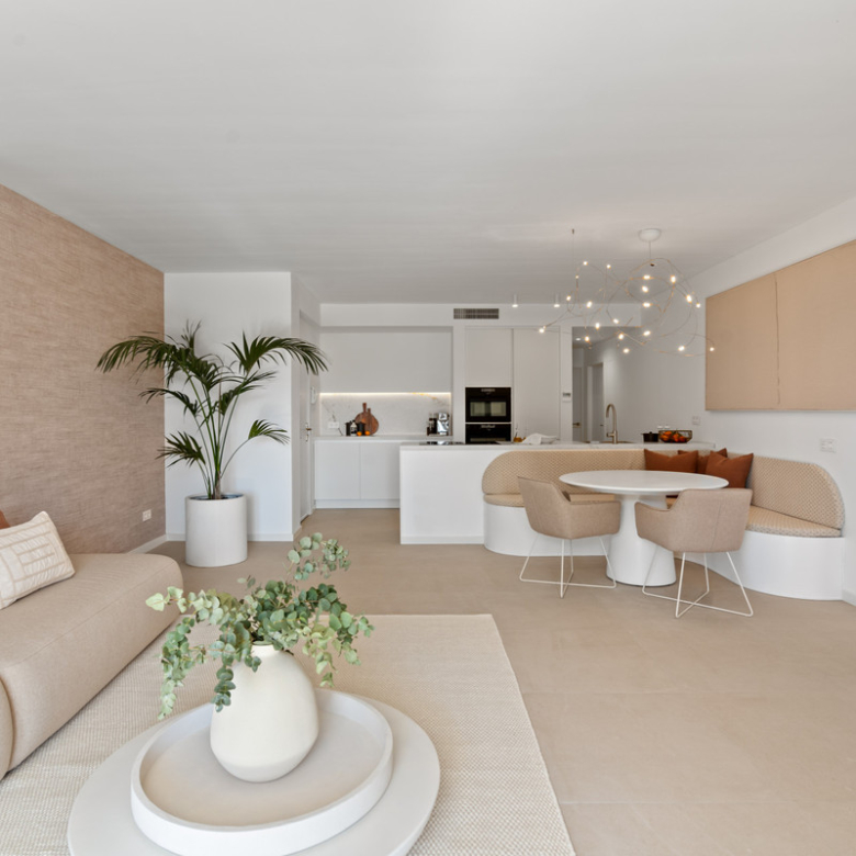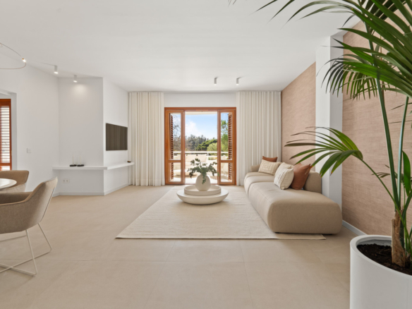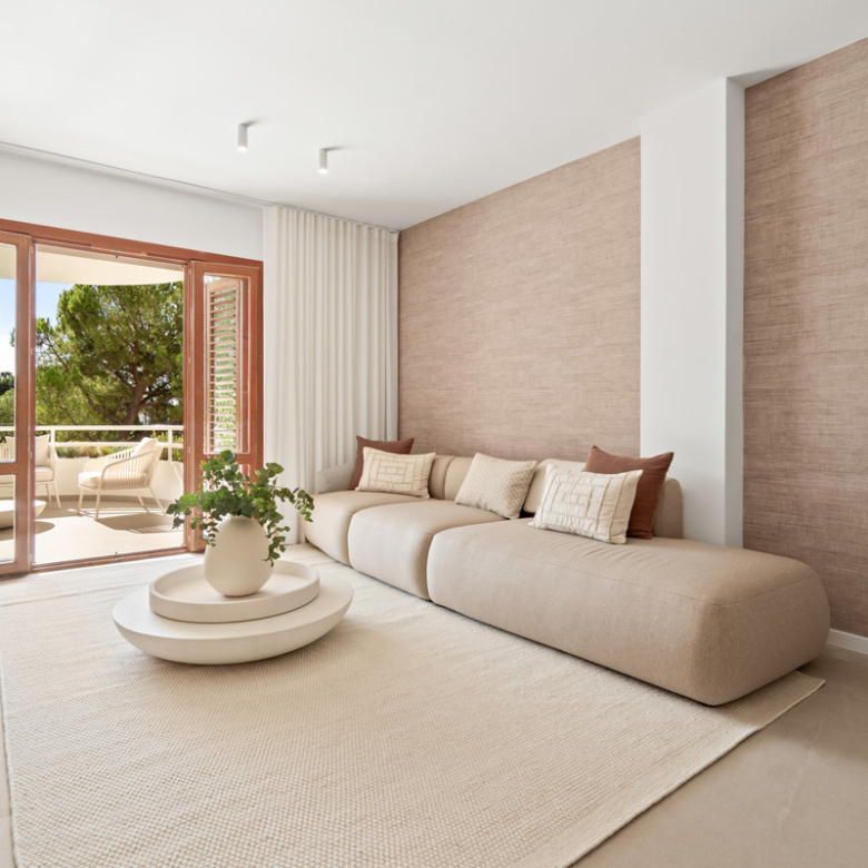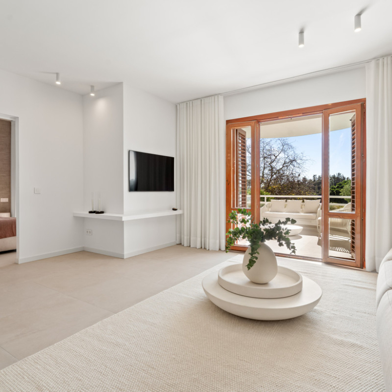 This renovated apartment is located in Alcores del Golf, a south-facing property with plenty of natural light and a clean, minimalistic design. The open-plan layout connects the living area with a modern kitchen, and the large terrace features a barbecue, dining area, and a relaxing outdoor space with views of the garden and greenery.