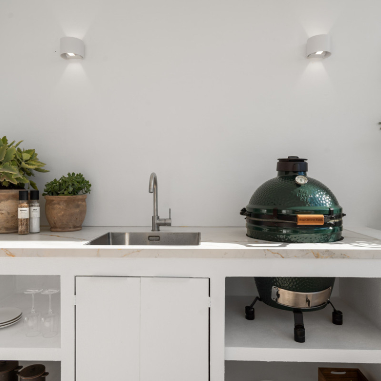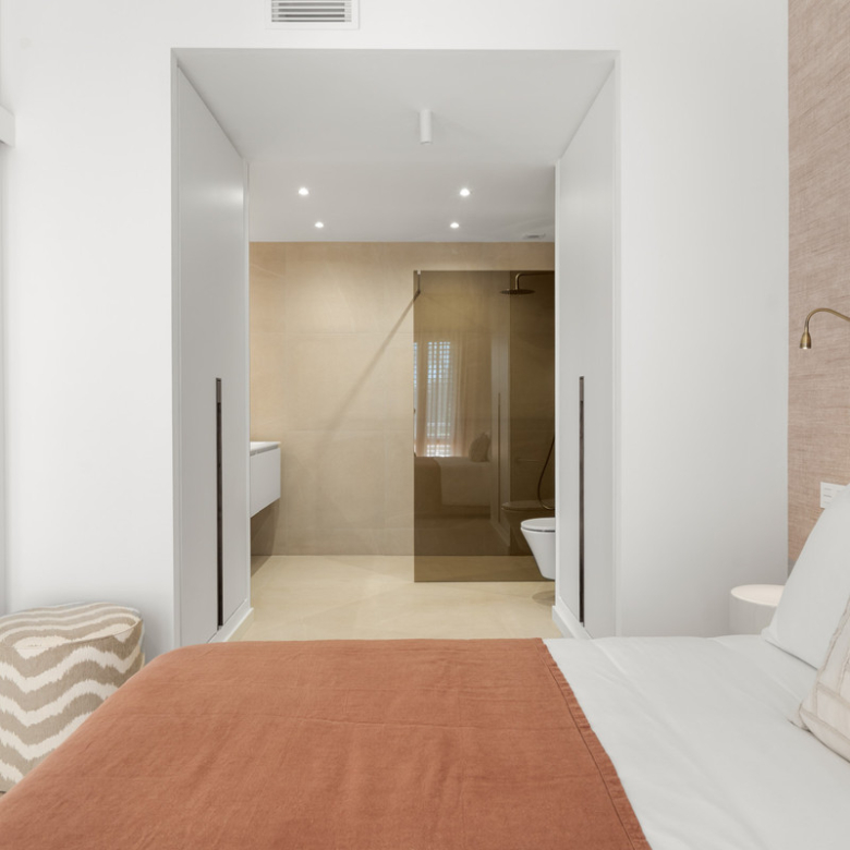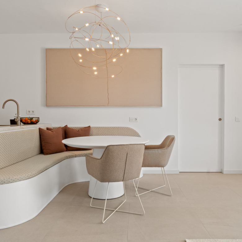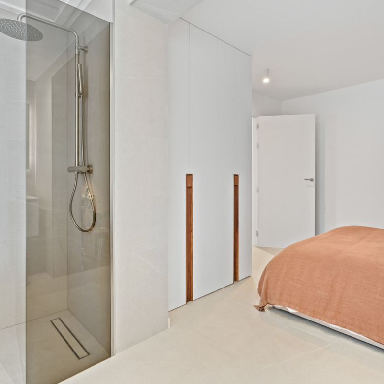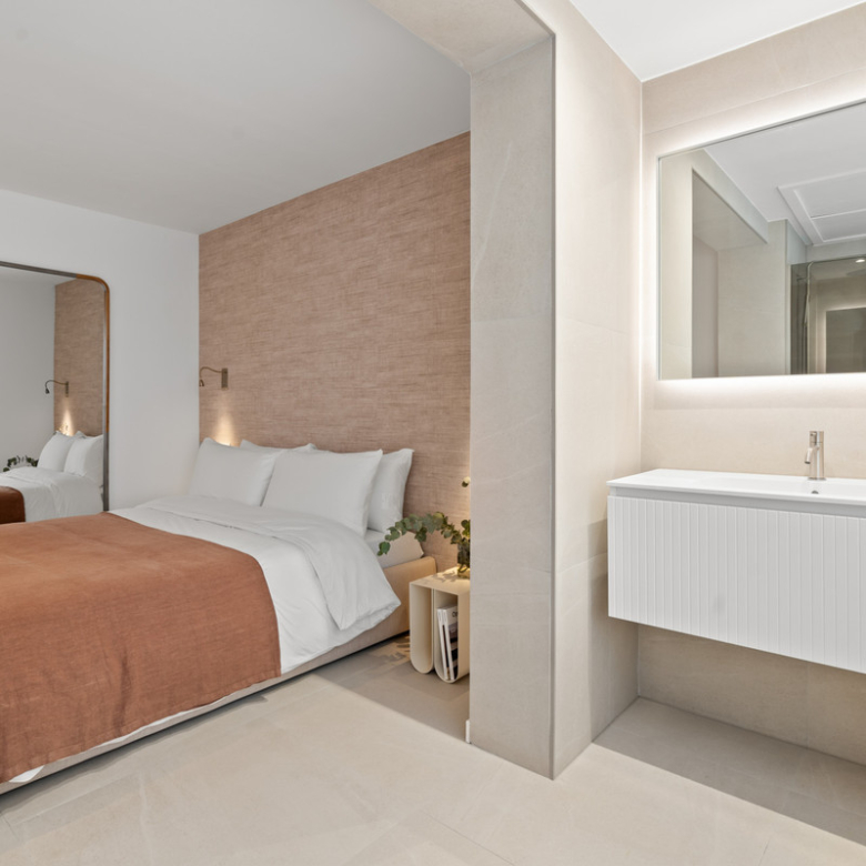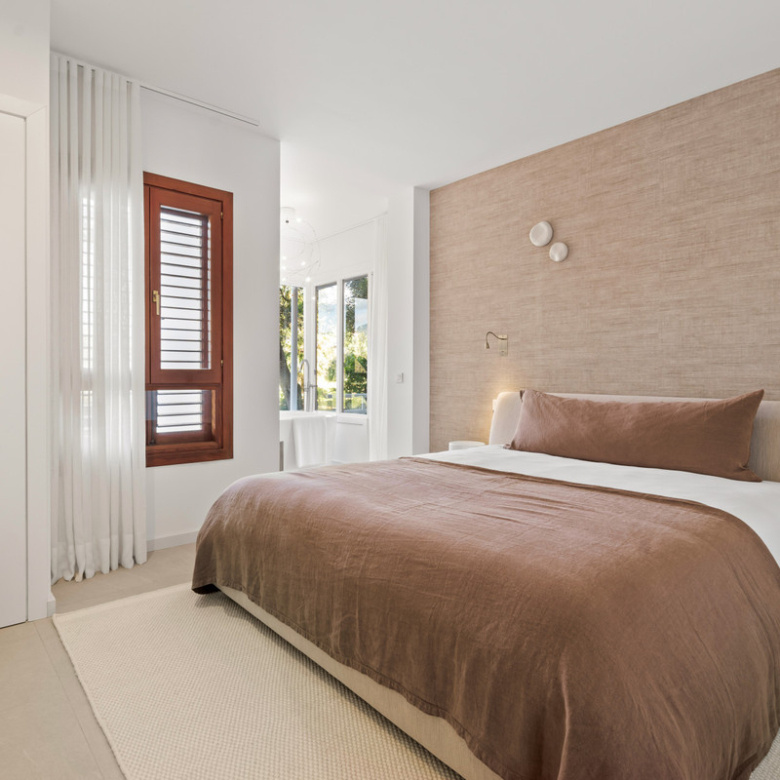 This renovated apartment is located in Alcores del Golf, a south-facing property with plenty of natural light and a clean, minimalistic design. The open-plan layout connects the living area with a modern kitchen, and the large terrace features a barbecue, dining area, and a relaxing outdoor space with views of the garden and greenery.