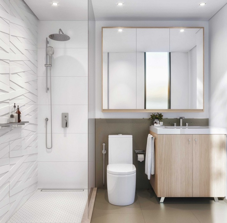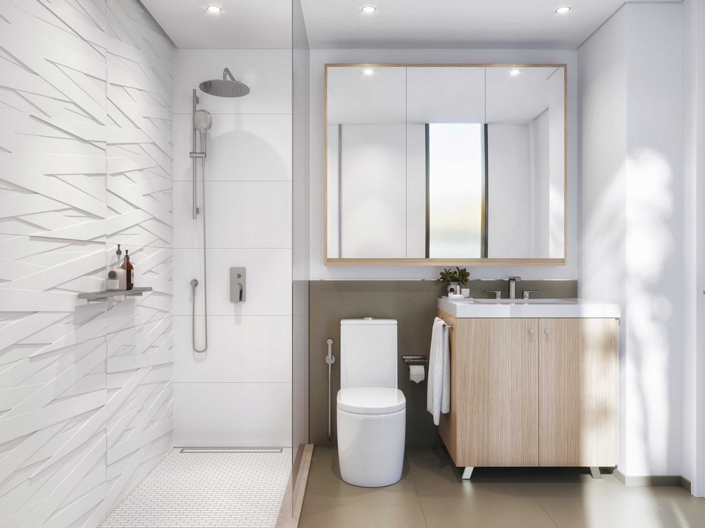 Bathrooms: Modern spa-style bathrooms with walk-in showers, woven wall tile accents, and ample storage
