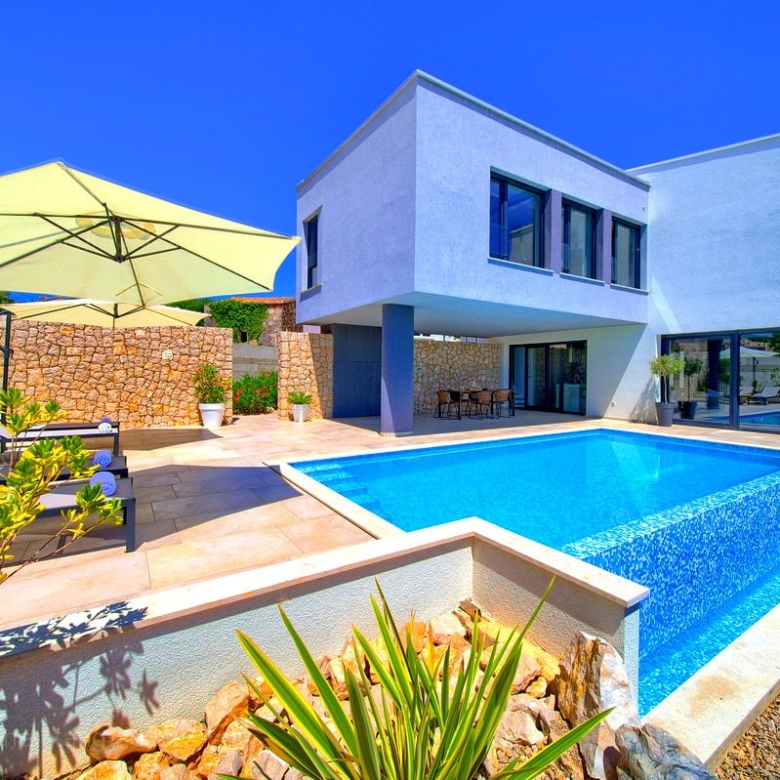 At the Stan Grad Immobilien agency, a beautiful house perfect for a vacation is for sale in the region of Island Krk. This desirable modern house is located in a very quiet cul-de-sac, close to the well-known tourist town of Krk. The house is of high-quality construction and consists of three floors. It is furnished and decorated to a high standard.