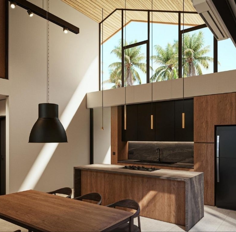 Designed across two levels, each villa offers three bedrooms, with two on the ground floor and a private master suite upstairs, creating a perfect balance between privacy and shared living. The open-plan living, dining, and kitchen area boasts soaring 7-meter ceilings, flooding the space with natural light and seamlessly connecting indoor and outdoor living. Large glass panels open directly onto a private rectangular swimming pool measuring 6.3m x 2.9m, framed by landscaped greenery and captivating rice field views.