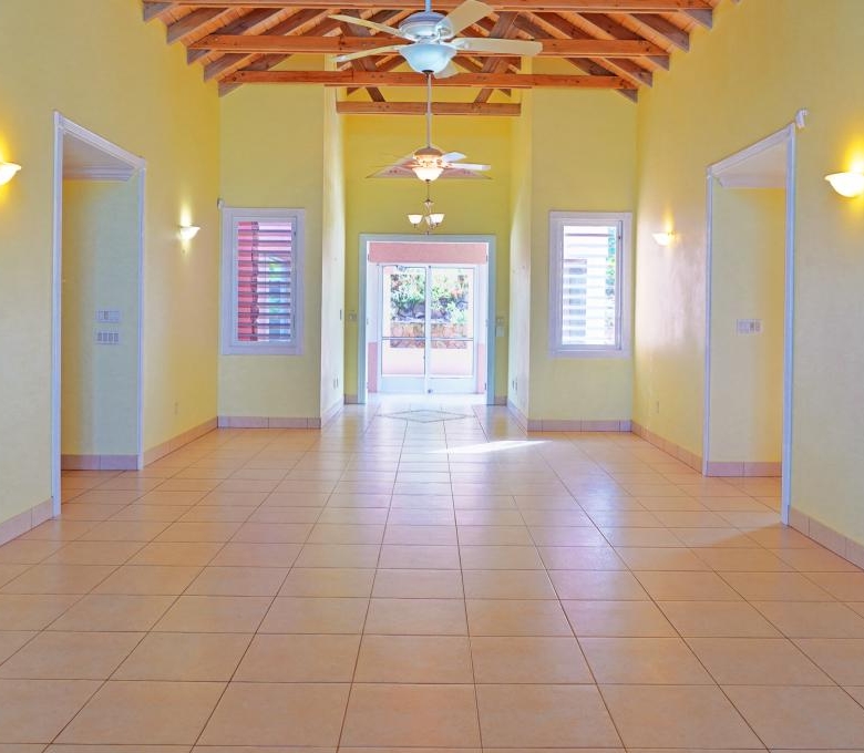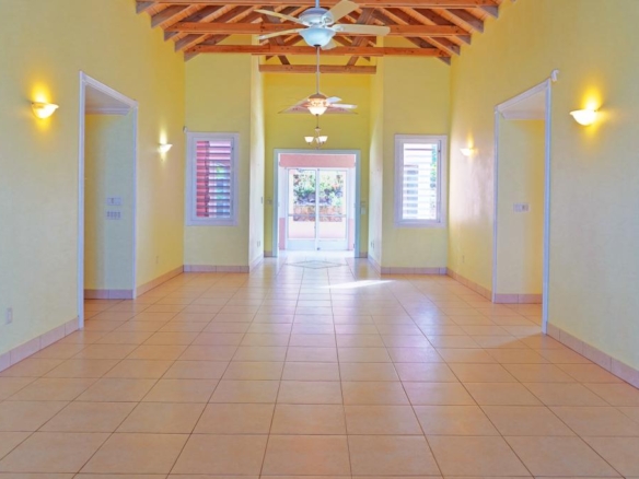 Step inside Morning Star Manor through its grand double entrance doors, which open into a welcoming foyer that flows seamlessly into a remarkably spacious living area. This expansive zone extends effortlessly into a screened outdoor space, blurring the lines between indoor comfort and Caribbean charm. The living room, crowned with tall cathedral ceilings, is bathed in natural light and enjoys superb cross-ventilation from multiple windows.