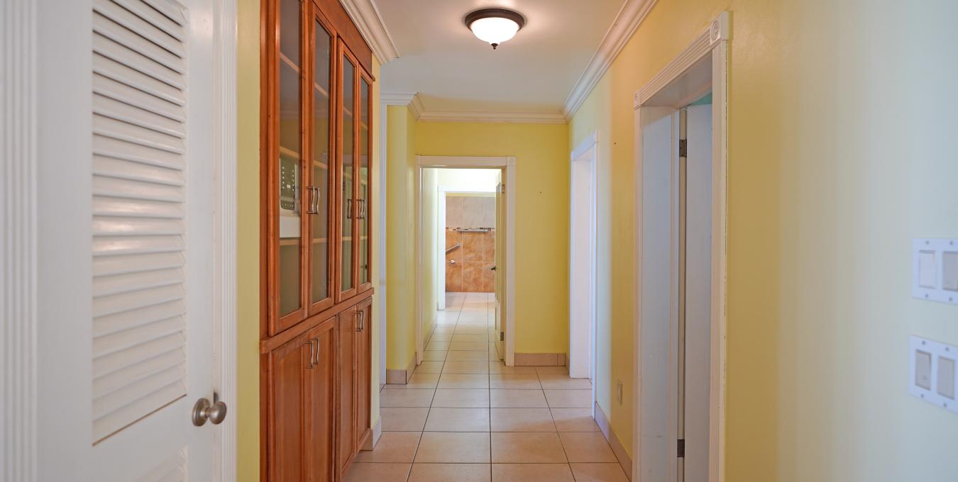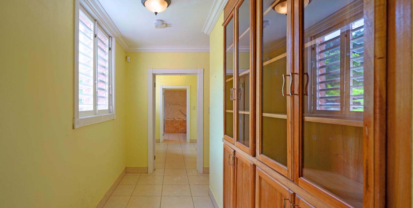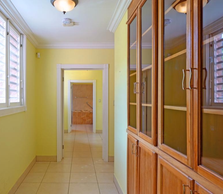Off the main living area, the fully equipped gourmet kitchen is a culinary delight, featuring abundant built-in cabinetry and a central island perfect for casual dining or entertaining. A separate laundry room is conveniently located immediately off the kitchen. The villa’s thoughtful layout divides the sleeping quarters into two distinct wings, housing four generous ensuite bedrooms, each connected by wide, airy corridors. All bedrooms are appointed with individual air conditioning units, ceiling fans, large closets, and spacious, private bathrooms. Two beautifully built-in bookshelves elegantly embellish the hallways, adding a touch of bespoke character. For enhanced convenience and security, the house is equipped with an intercom system connecting the bedrooms to the kitchen, as well as a security system with concealed wiring.