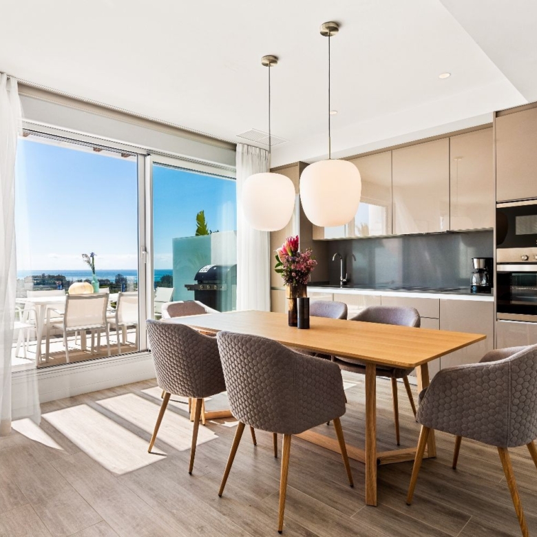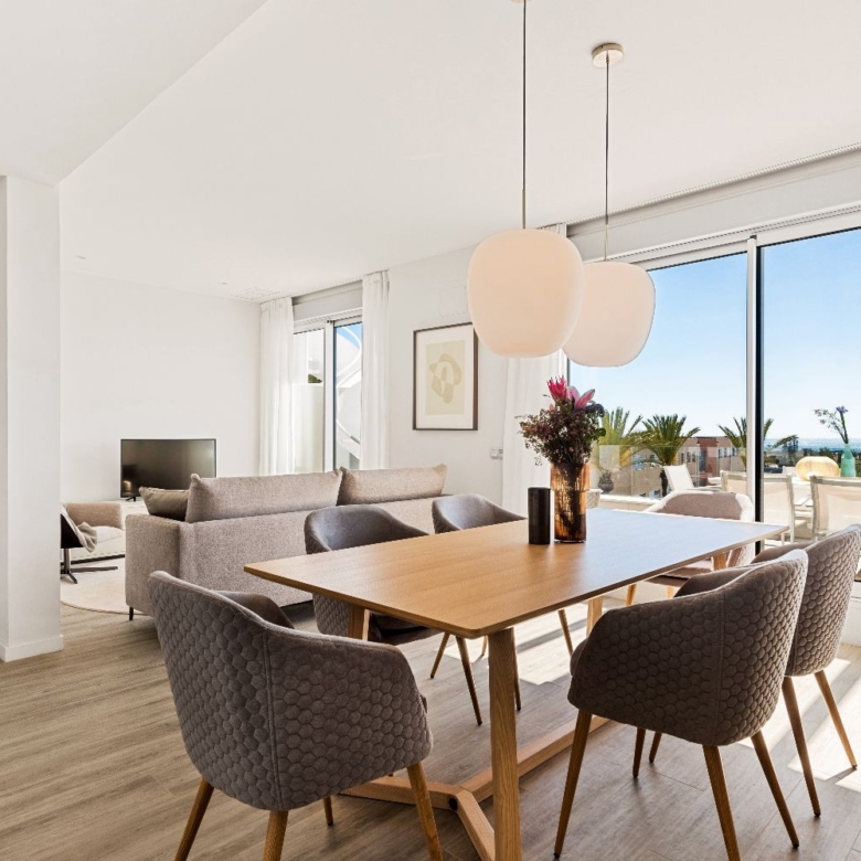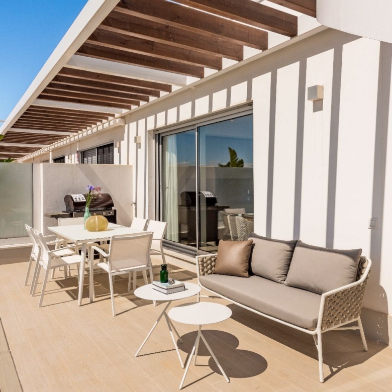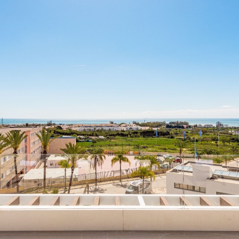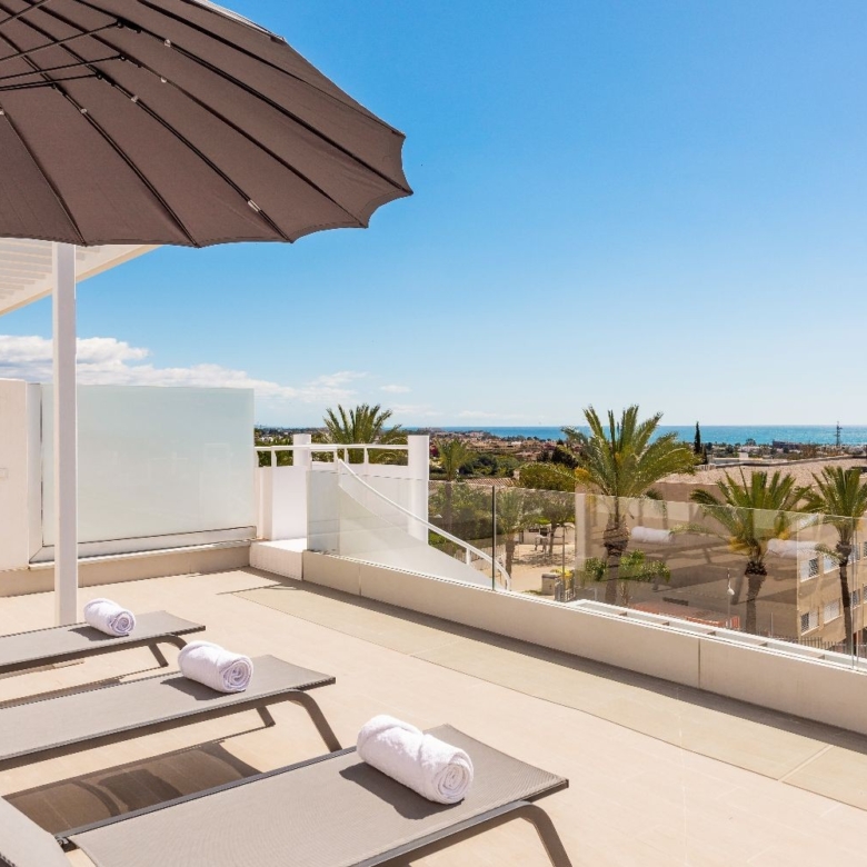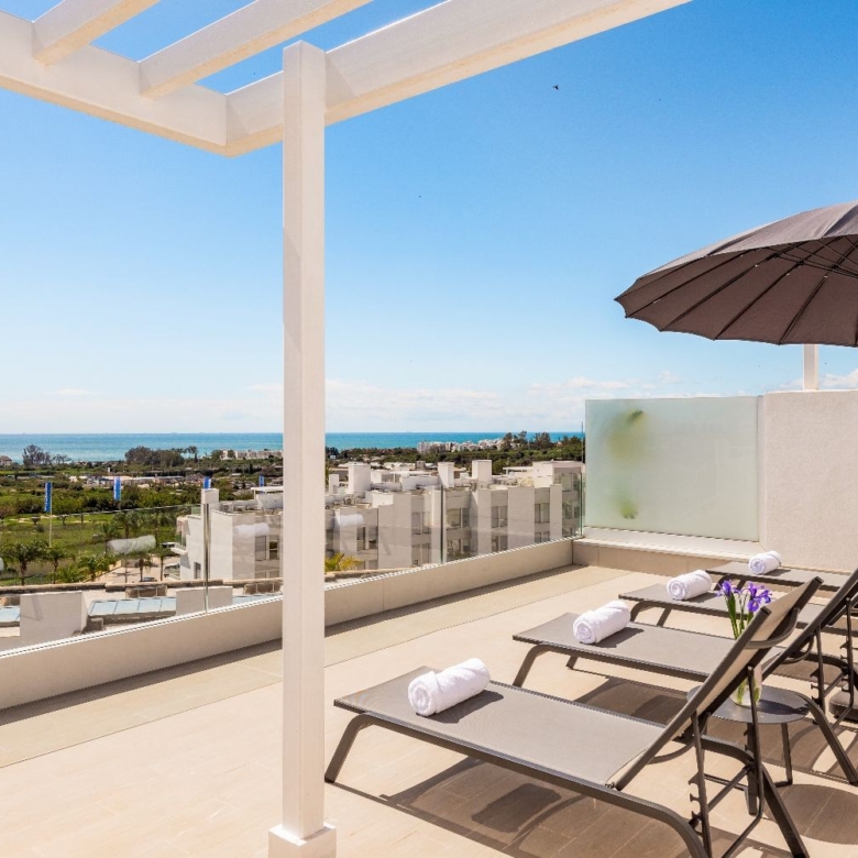 This 2 bedrooms duplex penthouse is located in the new Golden Mile, in Cancelada walking distance to amenities and services and just a few minutes driving from Hotel Anantara Villa Padierna, golf course los Flamingos, Saladillo Beach and Villacana. Contemporary design, comfort and quality combine all this with plenty of light and a unique living. Ground floor level have direct access to living area with open plan kitchen fully fitted and direct access to the terrace , two bedrooms with two bathrooms on suite, one of them with bath and the other one with walking shower, on the top floor there is a generous solarium with open views over the Mediterranean Sea. Porcelanic tiles, fitted kitchen with appliances, video porter, fitted wardrobes , double glazzing, shutters in windows, parking space and storage. This exclusive penthouse offer stunning views to the Mediterranean Sea and is surrounded by beautiful gardens and a beautiful pool. Residents gain access to the St. Vista Clubhouse and benefit from numerous leisure facilities and other amenities in the area.