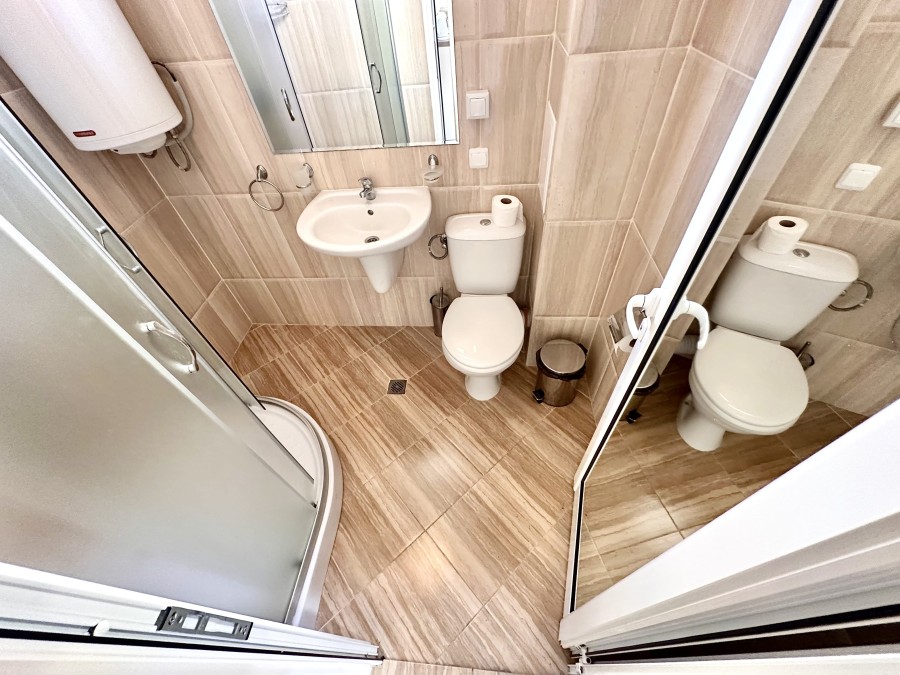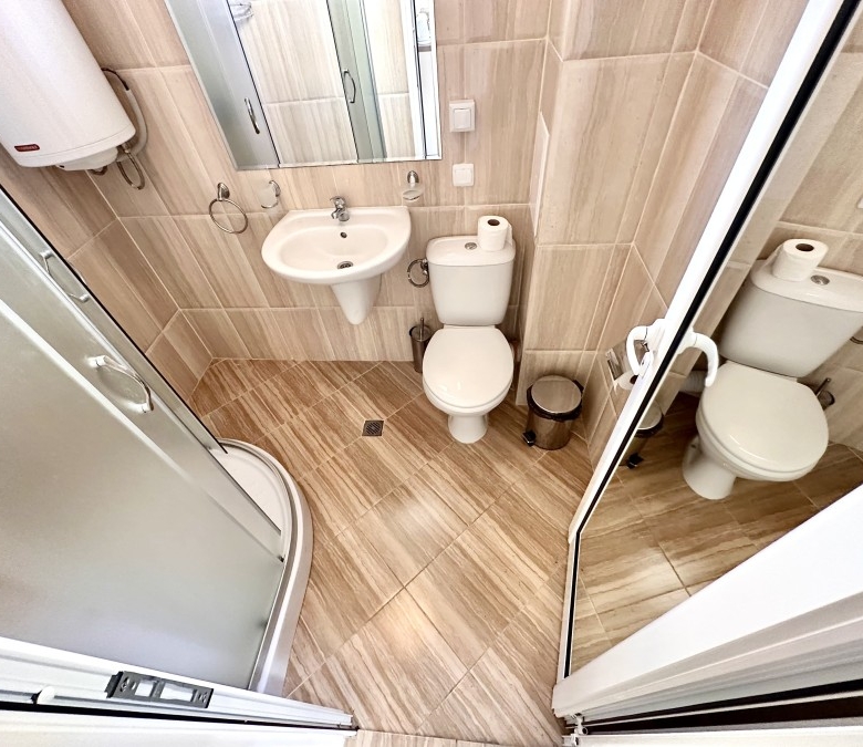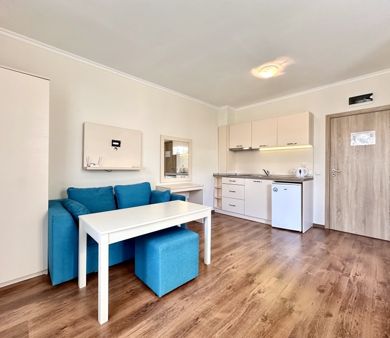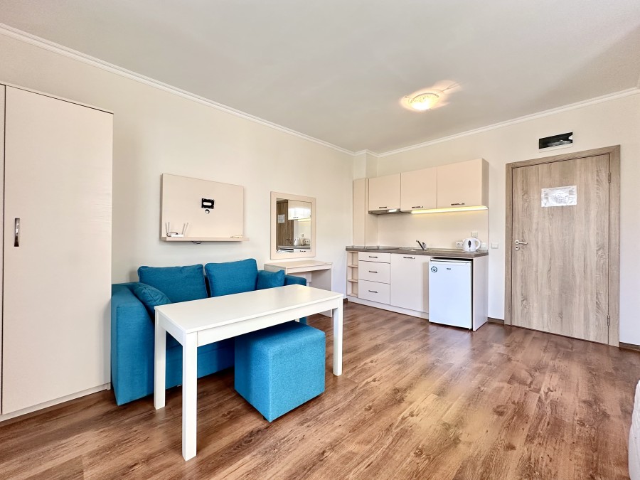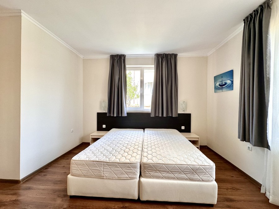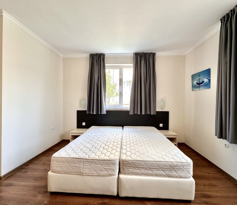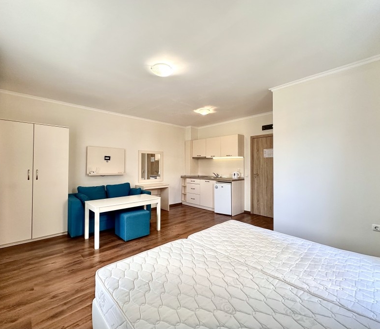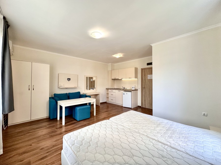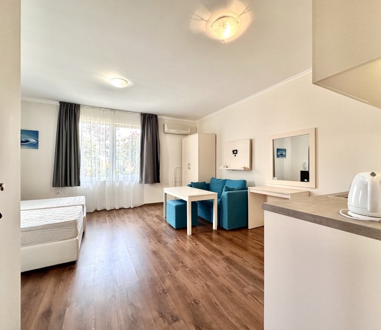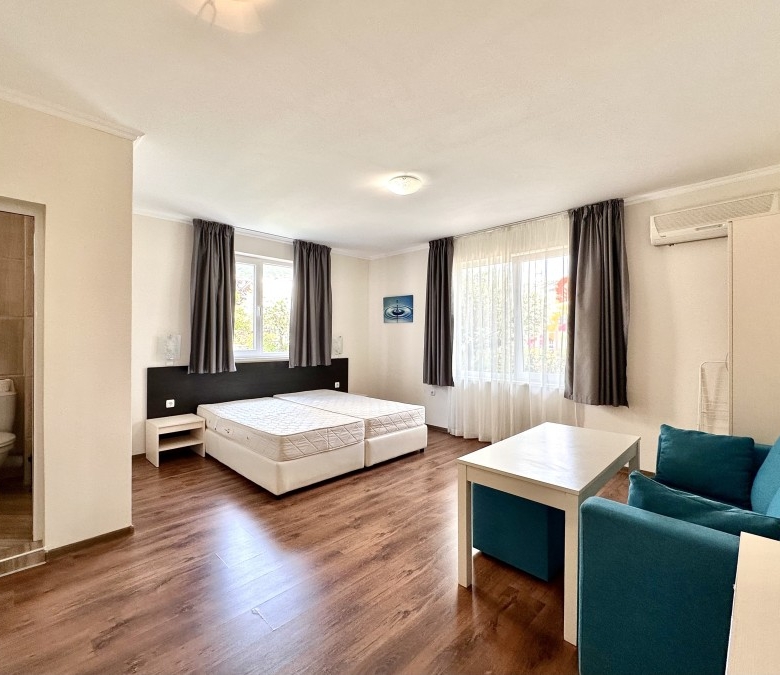 Nicely furnished ground floor studio, 40 sq.m., in Macon Residence, Sveti Vlas We offer a studio in the city of St. Vlas in the Apart Hotel Macon Residence Wellness and Spa. The property boasts of its excellent location, 5 minutes from the center of St. Vlas, 5 minutes to the Mercury supermarket, 7 minutes to the sea. Living area – 40 sq.m., located on the ground floor and comprising of: – hallway; – bedroom area; – bathroom and WC; No balcony. The studio is offered with all the furniture and electric appliances. Excellent location for holiday rentals. Maintenance fee 480 euros per year. For your active relaxation the complex offers 4 swimming pools, sauna, Turkish bath, massage parlors, sports hall, fitness hall, sports grounds, and children playgrounds and slides. There is also a lobby bar, a restaurant, children’s pastry shop, and shopping area Excellent investment for living and renting out.