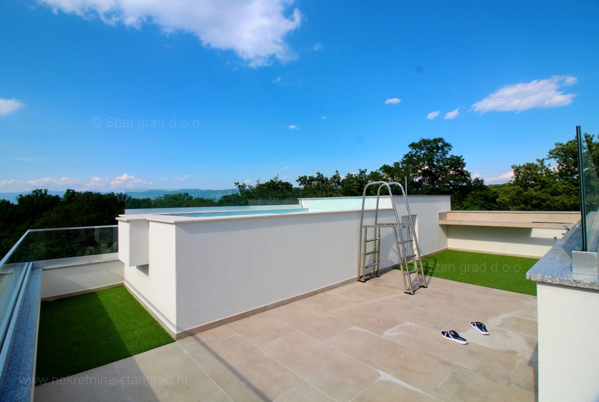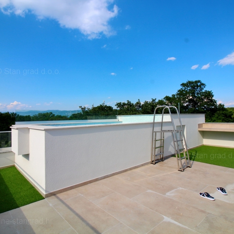 The agency Stan Grad Immobilien is selling an exceptional apartment built according to a modern project on the attractive northern Adriatic area, the island of Krk. The property in question is beautifully integrated into a beautifully planned area of a nice Mediterranean settlement not far from the center of Njivice and all the necessary facilities. According to the type of property, this is a medium-sized two-story apartment. In a very good and quality building, the apartment is located on the ground floor. The apartment covers a total area of approximately 112 m2. It consists on the ground floor of a room, bathroom, storage room, stairs to the floor where there are 2 bedrooms, kitchen, living room, bathroom and stairs to the roof terrace with swimming pool. The property with a preserved interior is equipped with a set of very good technical equipment and quality pieces of furniture. It is certainly worth noting that the property described has an exceptionally well-decorated and well-kept yard. The owner of the apartment will have one parking space at his disposal. In addition to the mentioned features, this apartment is very well oriented and offers a beautiful view of the sea and the coast. This apartment is owned by a natural person and in the name of its transfer, the buyer is obliged to pay real estate sales tax in the amount of 3%. The seller of the real estate guarantees proper construction and ownership documentation and a quick transfer of the real estate to the name of the buyer. Our staff will make sure that you feel at home in Kvarner. Visit us on the island of Krk. If you place your trust in us, the Stan Grad Immobilien agency will be happy to help you transfer the ownership rights of this property and the bill for its utility connections and services to your name.