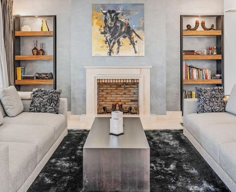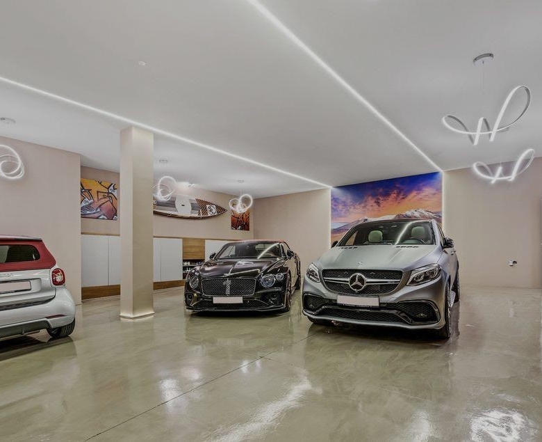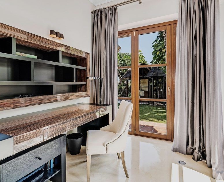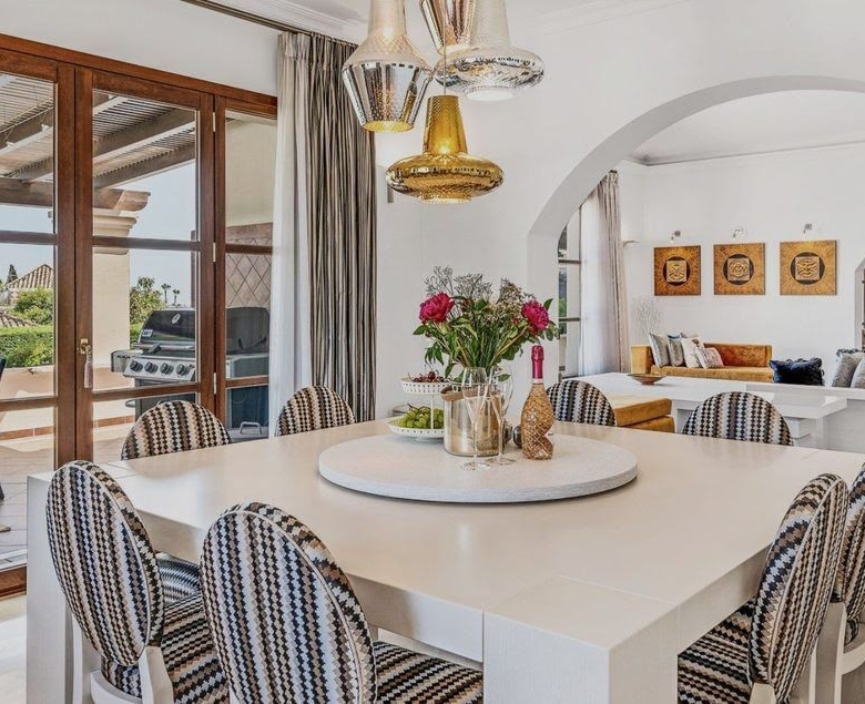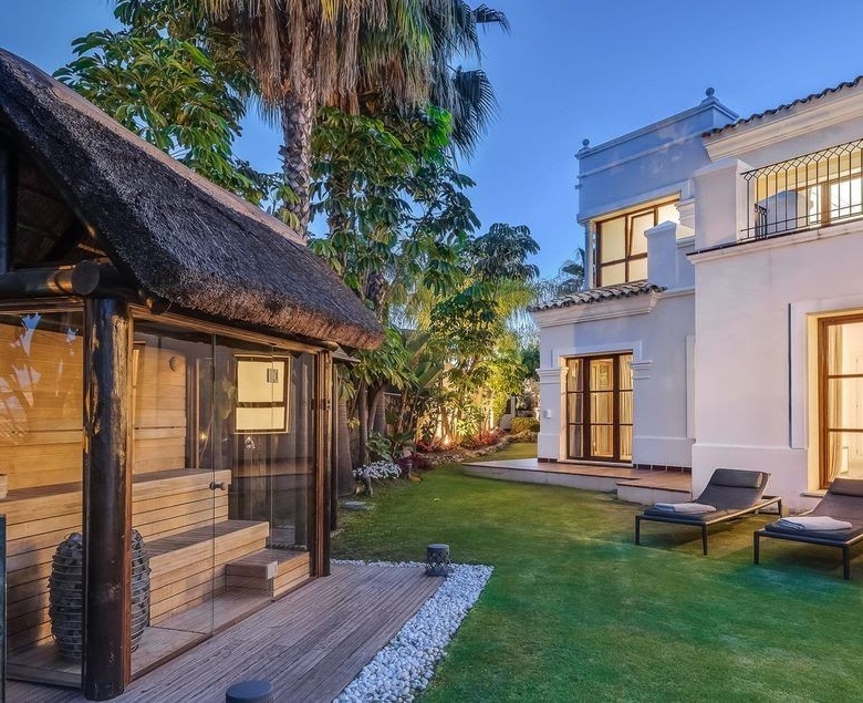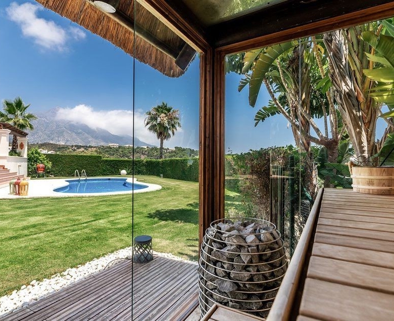 A majestic Andalusian-style villa built on three floors, on a quiet street in the heart of Nueva Andalucía. Though minutes away from Marbella’s most prestigious golf courses, schools, shops, and restaurants, this spacious family home is in a peaceful neighborhood. The villa is set in a gated community with a security guard on duty every night. Everything is included in the price; the majority of the interior has been designed and built by the current owners, therefore, having been in use only 1-4 years. The house has underfloor heating (water) and air conditioning for the hot summer months. The main entrance leads to an open plan large living room/sitting area with a ceiling reaching nearly 5 meters high. To the right is a small library with a fireplace; to the left is the dining room. Next to the dining room is a separate kitchen – perfect for closing doors to the cooking when entertaining guests. From the living room, double-sided doors open to the garden with the pool. The pool is heated, and the garden features an automated watering system. There are two separate areas on the terrace, one an outside dining space with an undisturbed view of La Concha mountain and the other a lounge overlooking the garden. There are three guest rooms with en suite bathrooms and fitted wardrobes + an extra guest bathroom. The house also features an elevator, which brings us to the second floor. This is a family floor with the master suite, a walk-in wardrobe, a large bathroom with a jacuzzi, and a separate terrace. Next to the master bedroom is an extra room that is currently used as a yoga room and a small gym but can be turned into, for example, a baby room, an art studio, etc. On the ground floor, there is the garage which conveniently fits five cars (+ a Smart or motorbike). Next is the spacious laundry room, the cinema with a built-in Bang&Olufsen sound system, a small wine cellar, and two more guest rooms. The star of the show is the gentlemen’s lounge with a professional snooker table