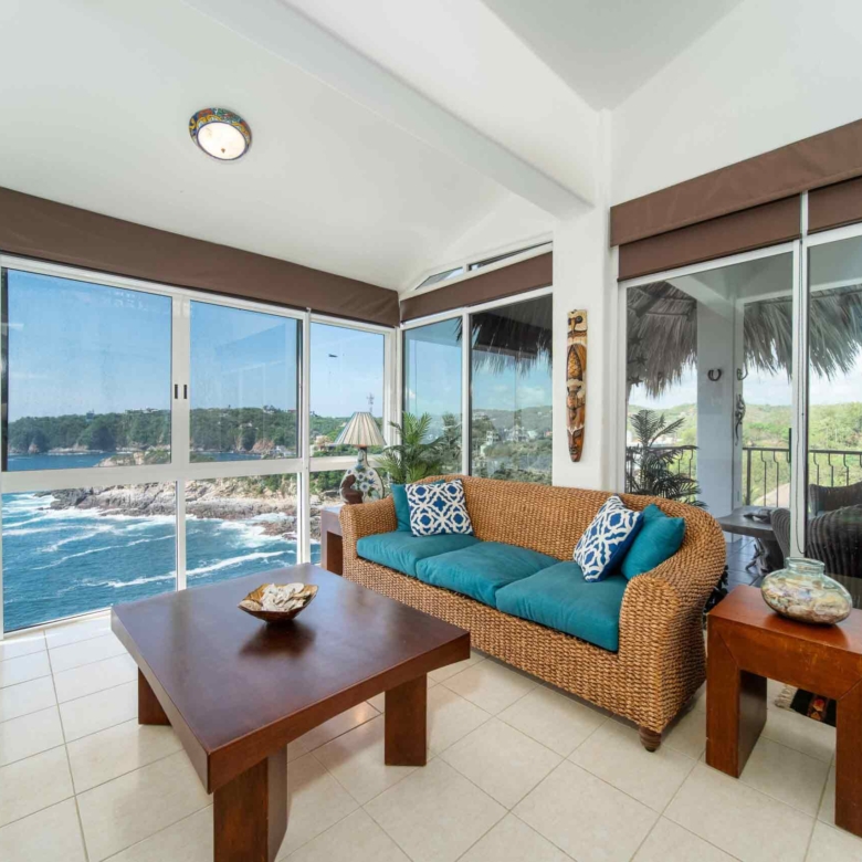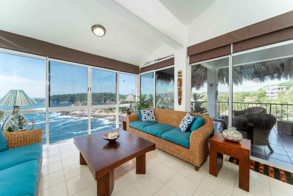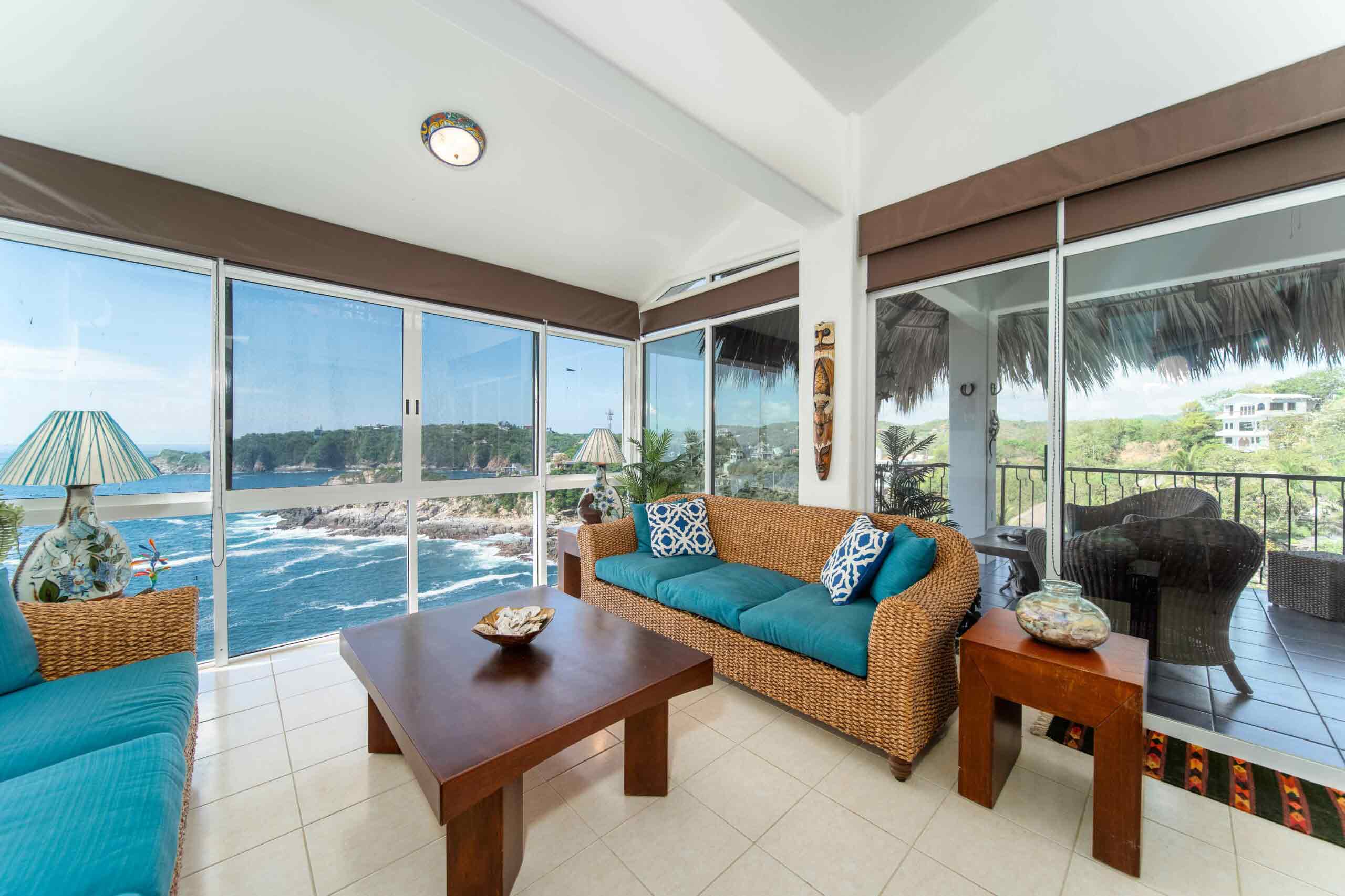 Located in the laid-back beach town of Puerto Angel. Living in the tropics is all about being comfortable inside and out and you will be that in this beautiful 2,056 ft2 2 bedroom, 2 bathroom condo. This oceanfront condo boasts a well-lit, spacious living room with expansive floor-to-ceiling windows, allowing plenty of natural light to grace the interior. Step out onto your private patio, adorned with a beautiful palapa, providing a shaded retreat for relaxation and outdoor living. Viewpoint at Puerto Angel speaks for itself as it is set atop a rock peninsula boasting over 270 degree ocean views that will leave you breathless. Lounge by the pool while watching whales and dolphins swim by the point. This dramatic property is located at the center of the Oaxaca coast surrounded by a collection of authentic Mexican beach villages. Contact us today to book a showing.