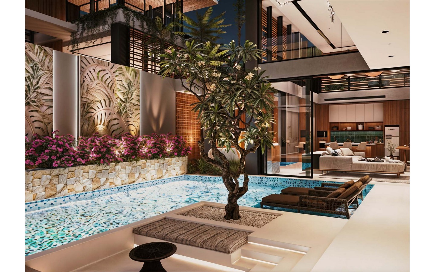 Spanning 250 square meters of prime real estate, this three-story marvel boasts a generous 281 square meters of elegantly designed living space. The villa includes two spacious bedrooms and three bathrooms, featuring premium amenities such as rain showers and sleek sinks, ensuring a spa-like experience within your private sanctuary.