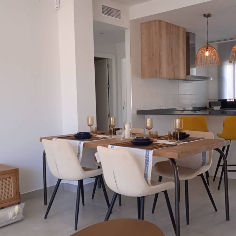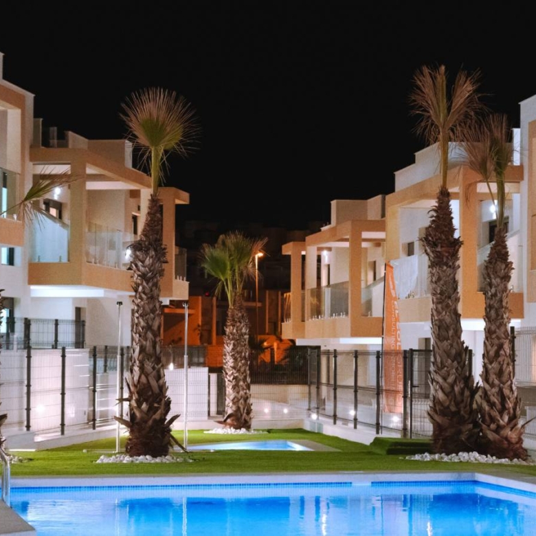 Bungalows for sale in Orihuela Costa, Alicante The residential has 40 homes with 2 or 3 bedrooms, 2 bathrooms, close to the beach. Ground floor properties with garden or top floor with solarium. Features: - High energy efficiency- Fitted kitchen (wall and base units, Silestone worktop or similar, integrated extractor hood with smoke outlet, induction ceramic hob, electric oven, microwave, LED lighting). – Energy-efficient, low-consumption electric DHW system. – Premium quality stoneware floors, modern design, large format. – Wall-mounted bathroom furniture with countertop washbasin, recessed mirror in bathrooms and toilets, shower tray with fixed tempered glass screen, mixer taps, electric towel radiator in stainless steel, premium quality non-slip flooring and modern design premium stoneware tiling.- LED lighting- White lacquered built-in wardrobes and large sliding doors. – Pre-installation of A/C throughout the property. Property ID: GH-307703 Price: €279,000 Property Size: 81 m2 Land Area: 178 m2 Bedrooms: 3 Bathrooms: 2