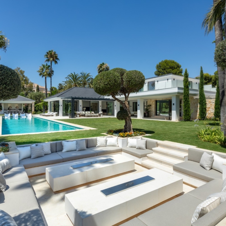Welcome to this awe-inspiring frontline golf villa with an unbeatable location in the heart of Nueva Andalucia. Overlooking the prestigious members-only Las Brisas Golf Club, this west-facing estate captures breathtaking sunsets that inspired its name. The meticulously manicured garden, adorned with exquisite landscaping, offers a stunning setting for the private pool—perfect for year-round enjoyment. A sunken chill-out area beside the pool adds a stylish touch to the outdoor space, while a pergola with a custom bar and alfresco dining area creates the ideal atmosphere for entertaining.