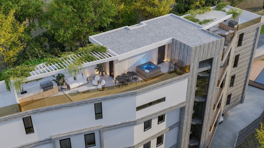 It is a modern four-story building with 11 stylish apartments. It offers a range of 1, 2, and 3-bedroom apartments and features a communal heated swimming pool for residents to enjoy. The highlight of the project is the three-bedroom penthouses located on the 4th floor, each featuring a private roof garden with its own jacuzzi, offering the ultimate luxury and privacy.Each apartment is designed with comfortable bedrooms, a bright open-plan kitchen, a living area, and a large veranda, perfect for relaxing and enjoying the views. Every unit also comes with its own parking space and storage room.Located in the well-known Panthea – Mesa Geitonia area of Limassol, it offers a peaceful lifestyle in a quiet neighborhood. At the same time, it’s close to the city center, with easy access to schools, cafes, and shops.This new development is the perfect combination of style and convenience in one of Limassol’s most sought-after locations.This unit has a 51 sqm private roof garden with a jacuzzi.Delivery – December 2026.