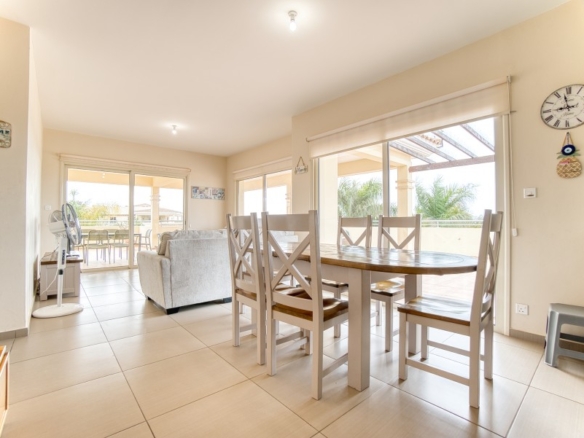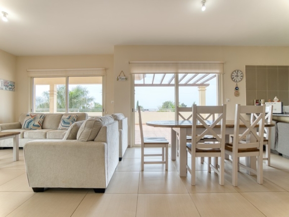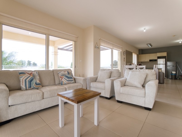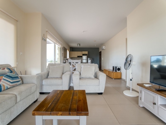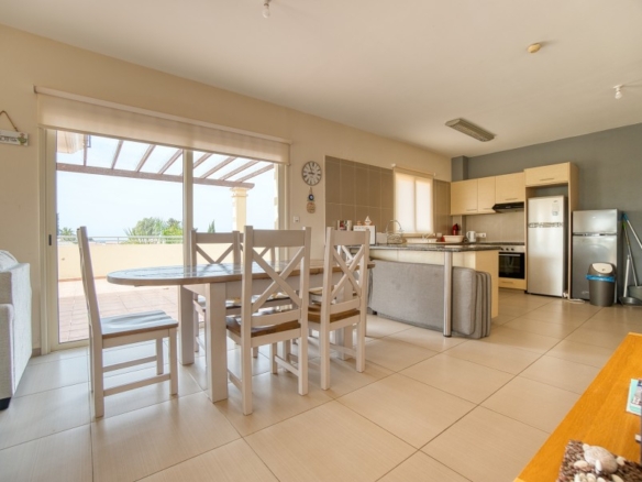 The penthouse has sea views from the kitchen, dining and lounge areas. There are views over looking the pool areas too. The development is a short walk (less than 5 minutes) into the center of the village, which has several restaurants, pubs and a mini-market. The development is a short drive (5 min) to Paphos airport; and 5-10 minutes to three of the top golf courses on the island. It is less than a mile to the beach, approximately 15 minute walk.