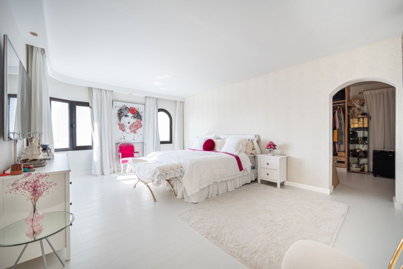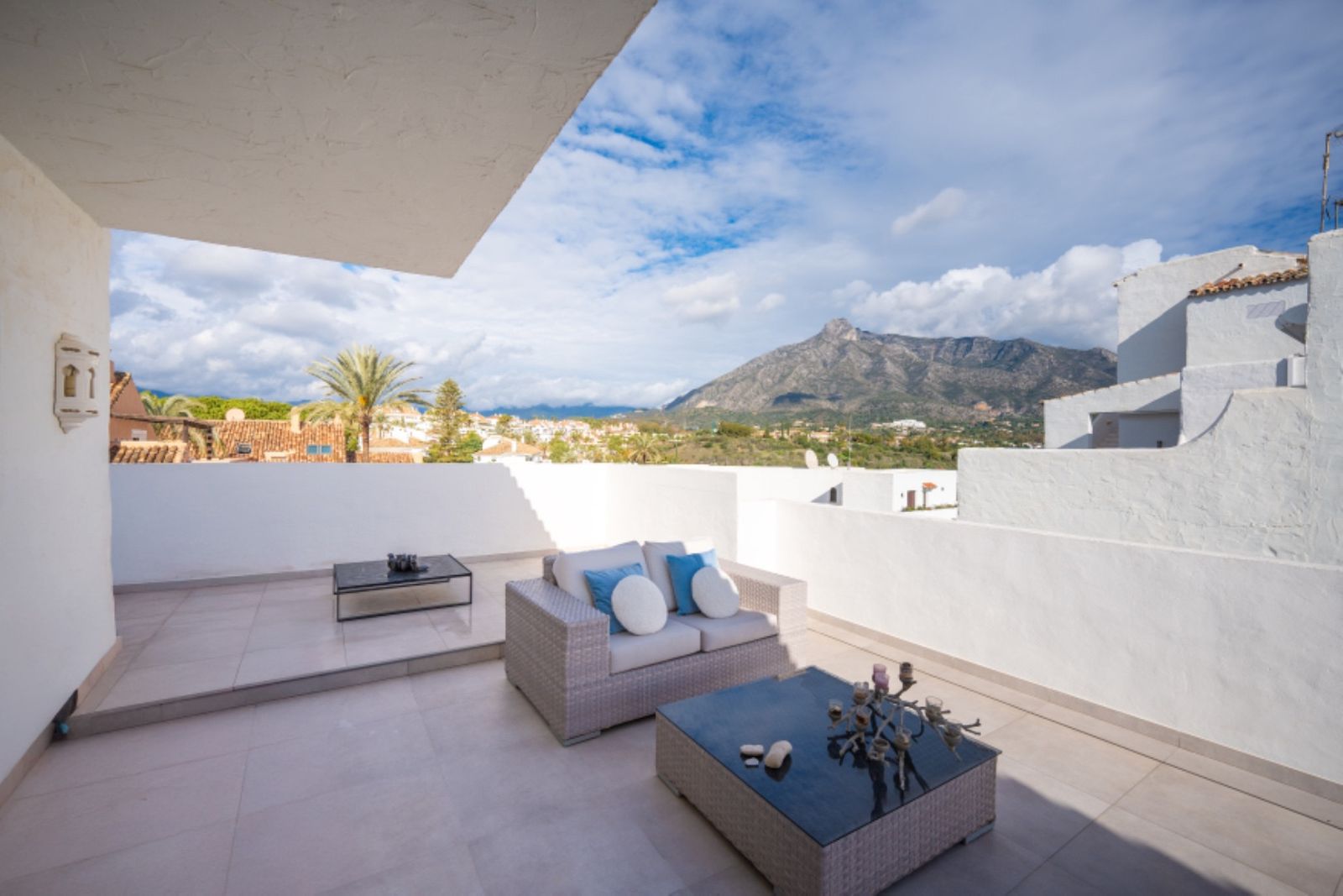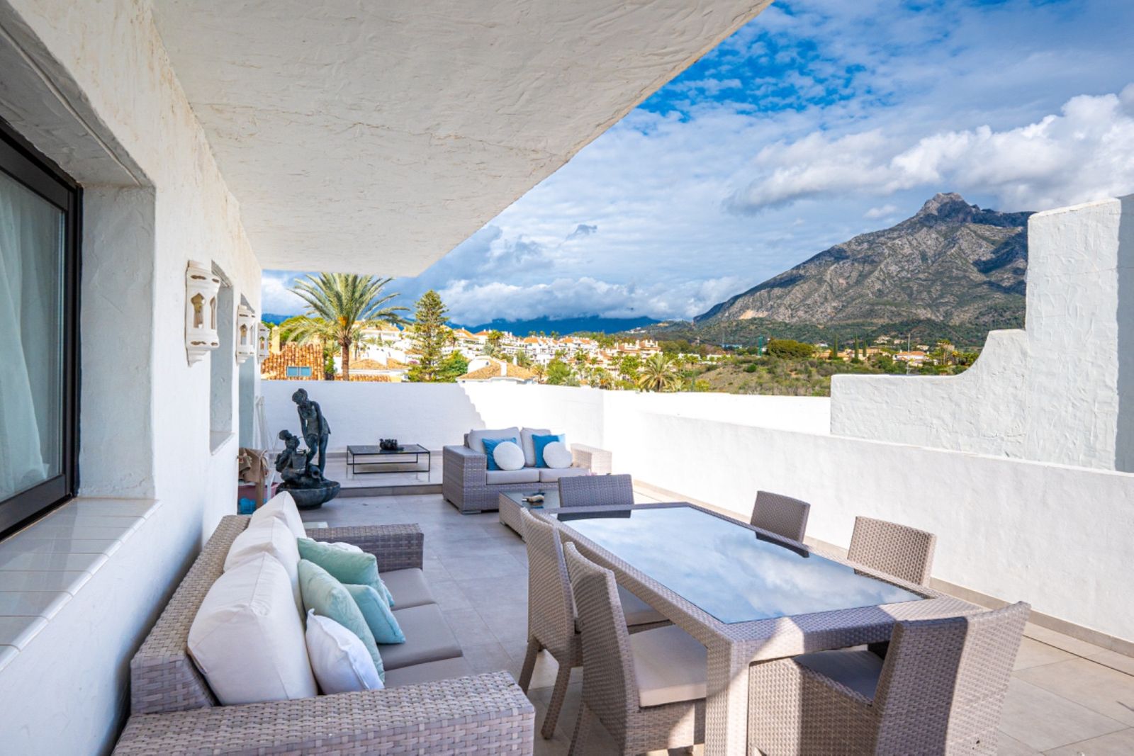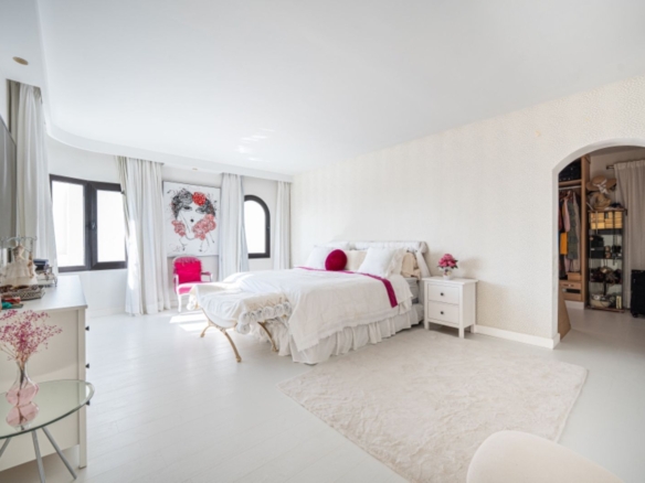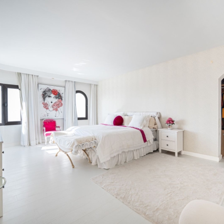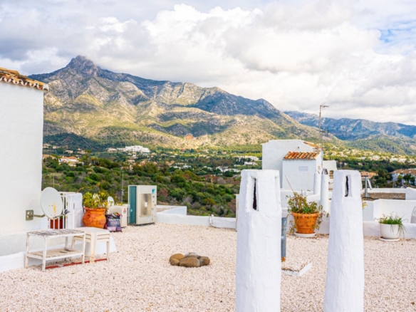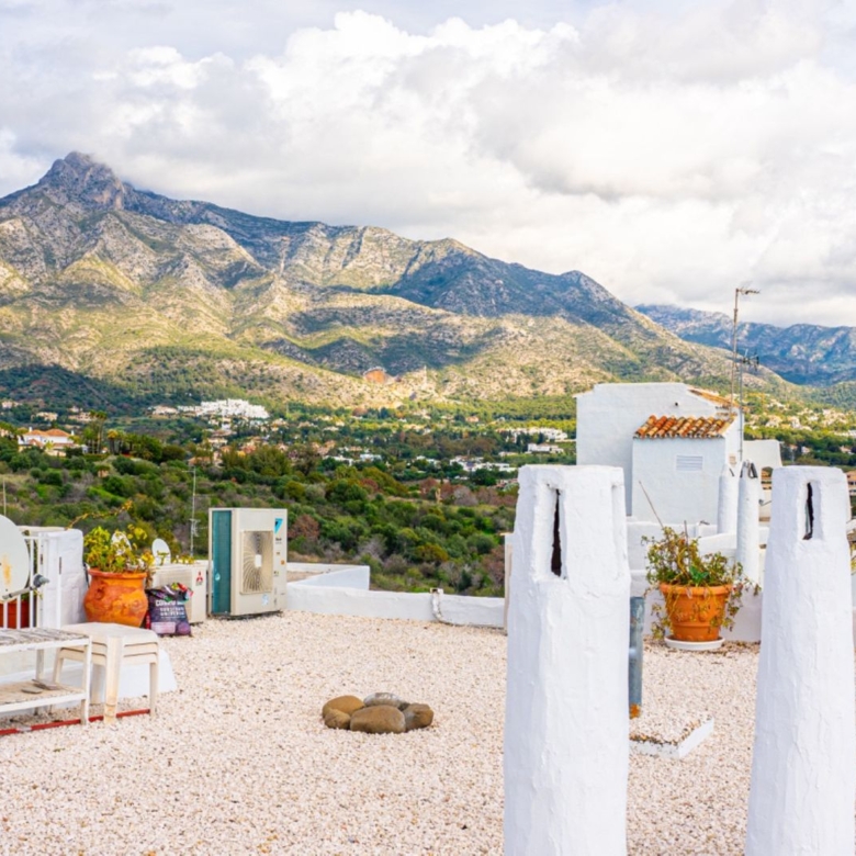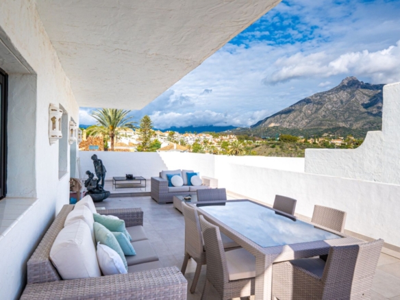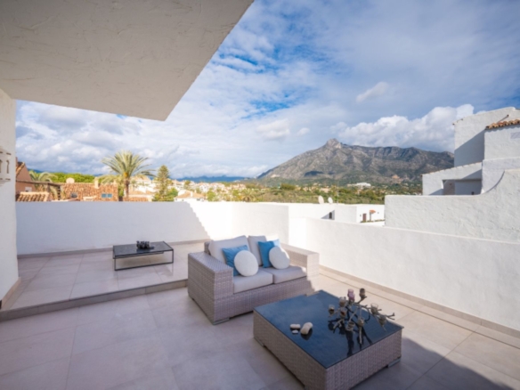 in its prime position within one of the coasts most renowned gated communities, offering an alfresco gymnasium, Andalucian style walkways and passageways guiding you around the urbanization and with beautifully tended gardens and swimming pool, this is a leafy oasis unlike any other.Rising above its surroundings yet protected by the all embracing silhouette of the iconic La Concha mountain at the rear, this stunning penthouse is sublet yet elegant in both its position and its appearance.Walking into the open plan living areas you are immediately taken aback by the sheer luminosity of the entire floor. Windows that appear to wrap around the facade of the property give huge glimpses of breathtaking views that steal your gaze from the mountain range, down to the coast and out across the glistening Mediterranean Sea where the deep blue borderline of the horizon meets the skies above.The dining room is elegant on one side of the main living area, streamlined in white and black neutral shades – a theme that continues over in the kitchen which stands adjacent. This kitchen has been astutely designed to run the length of the property yet offer bar seating area at one end. The kitchen is fully equipped with a myriad of first class appliances, including a wine cooler, all cleverly integrated within the white units that sit juxtaposed to the black countertops. A glass door at one end gives direct access out onto the terrace that encircles the property.Delicately positioned in the main section of the floor is the seating area, frame again by the windows along the front of the property. Beautifully dressed in white, in keeping with the cleanliness of the decor, and with touches of pastel colour, this area gives a feeling of elegant ease. A chaise longue is ingeniously placed in the far corner adding a certain ‘je ne sais quoi’ to the ambience. All throughout the touches of colour subliminally link each space to its neighbor, thus creating a graceful continuance.The hall leading off from the dining area reveals two dazzling bedrooms, each one a quiet corner offering reflection and tranquility. The guest bedroom is charming in it pastel pink and white furnishings, with mirrors skillfully positioned to reflect as much light as possible. The effect is glittering. its adjoining bathroom is simplistically designed and uncluttered, offering a feeling of serenity to its guests.However, it is the master suite that is resplendent, both in size and illumination. Furnished in pure white with just a splash of vibrant colour here and there, this room commands your attention. With the bed strategically placed to appreciate views through the windows and a colossal walk in wardrobe and dressing room at one end, this feels more like a separate wing to the property than a bedroom! The ensuite bathroom has an aura of chintzy chic to it, with its delicately flowered wall paper, yet is sleek in its modernity with a full length walk in shower at one end and two sink units side by side, all in pure white.The terrace that wraps around the property is open and wonderfully designed, with various seating and dining areas, all of which enjoy both sun and shade at different times of the day. The view across the tree tops and over to the sea are all encompassing as are the views back across to La Concha. Up yet further to the solarium floor is the roof top. This hidden secret offers promises of long lazy summer afternoons spent lounging under the summer sun or of evenings spent sipping cocktails and counting stars.With is exalted location on the Golden Mile this penthouse is simply stunning: a sanctuary yet still a home: a home that, once you are safely esconced within, you may never want to leave. Perfect!