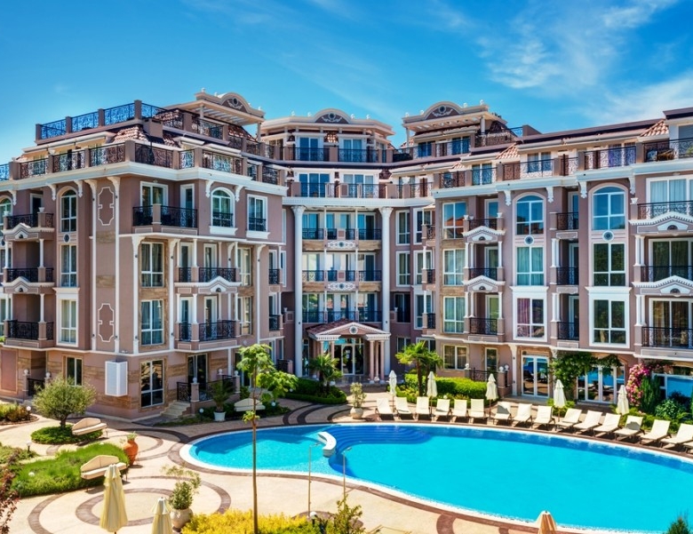 Penthouse with 2 bedrooms and a big terrace; 91 sq.m., in Izida Palace 2, Sunny beach KC Properties would like to offer you this beautiful property finished and furnished to a very high standard, part of best Bulgarian resort -Sunny beach. This real estate is a great example of combining contemporary building standards with classic and elegant style in finishing and furnishing. It is an excellent opportunity for those who enjoy luxurious beach vacation as well as for living 4 seasons. The property offers total living area of 91.16 sq.m. which comprises of: – entrance hallway; – Kitchen with lounge; – two bedrooms; – Bathroom and toilet with shower cabin; – Large terrace with lovely views to both pools The apartment is completely furnished and furnished, ready to use. There is an air-condition for cooling and heating the property. The terrace looks towards the pools and gardens of the complex. Guests and owners can enjoy all-year-round the indoor pool and spa facilities. Annual maintenance fee – 1868.79 EUR/year. Renovation fund – 93.10 EUR/year On site facilities and amenities: The apart-complex Izida Palace is unique with its architecture, aristocratic spirit, high quality and excellent conditions for relax and leisure. The inside and outdoor swimming pools, SPA center, the reception desk and all amenities which Izida Palace offers are completely enough for all owners to use the complex for all-year living. Owners and guests at Izida Palace will benefit from all the necessary amenities for all-year living. Those include: -inside swimming pool; -outdoor swimming pool with many attractions; -outdoor children’s pool; -Jacuzzi in the pool; – umbrellas and lounges; – SPA center with Jacuzzi, showers and recreation area and steam room; – lobby bar and common parts with unique interior design – Billiard hall; – Football playground (25.6 m x 11 m = 281 m ?); – Tennis courts (24 m x 11 m = 264 m ?); – Barbecue; – Playground; – A beautiful garden with fountains, gazebo and a place for recreation with exotic vegetation and planting – palms, olive trees, fig trees and many beautiful flowers and trees; – Parking – 24 hour year-round security service and video monitoring of the complex; – medical services – property management and maintenance